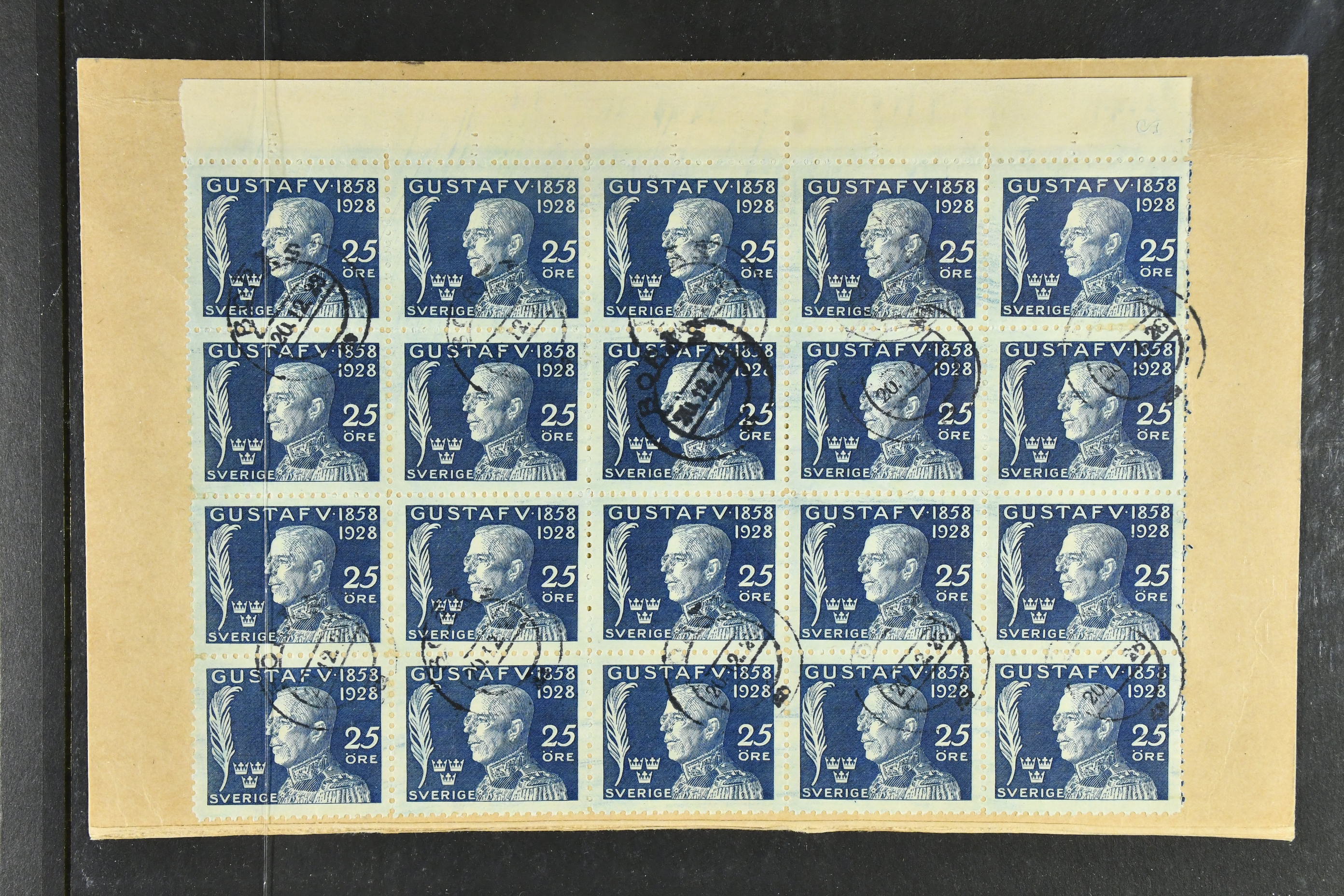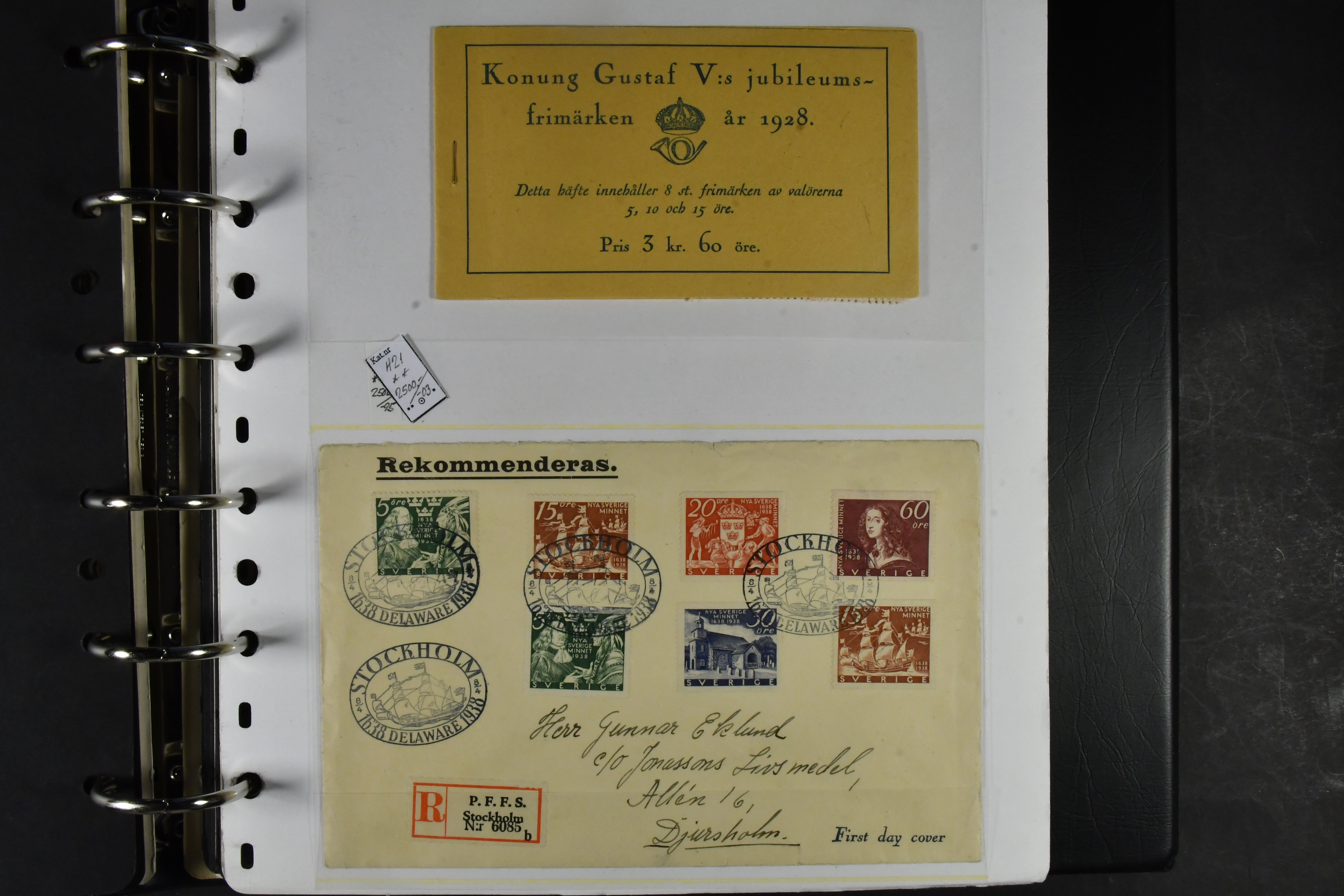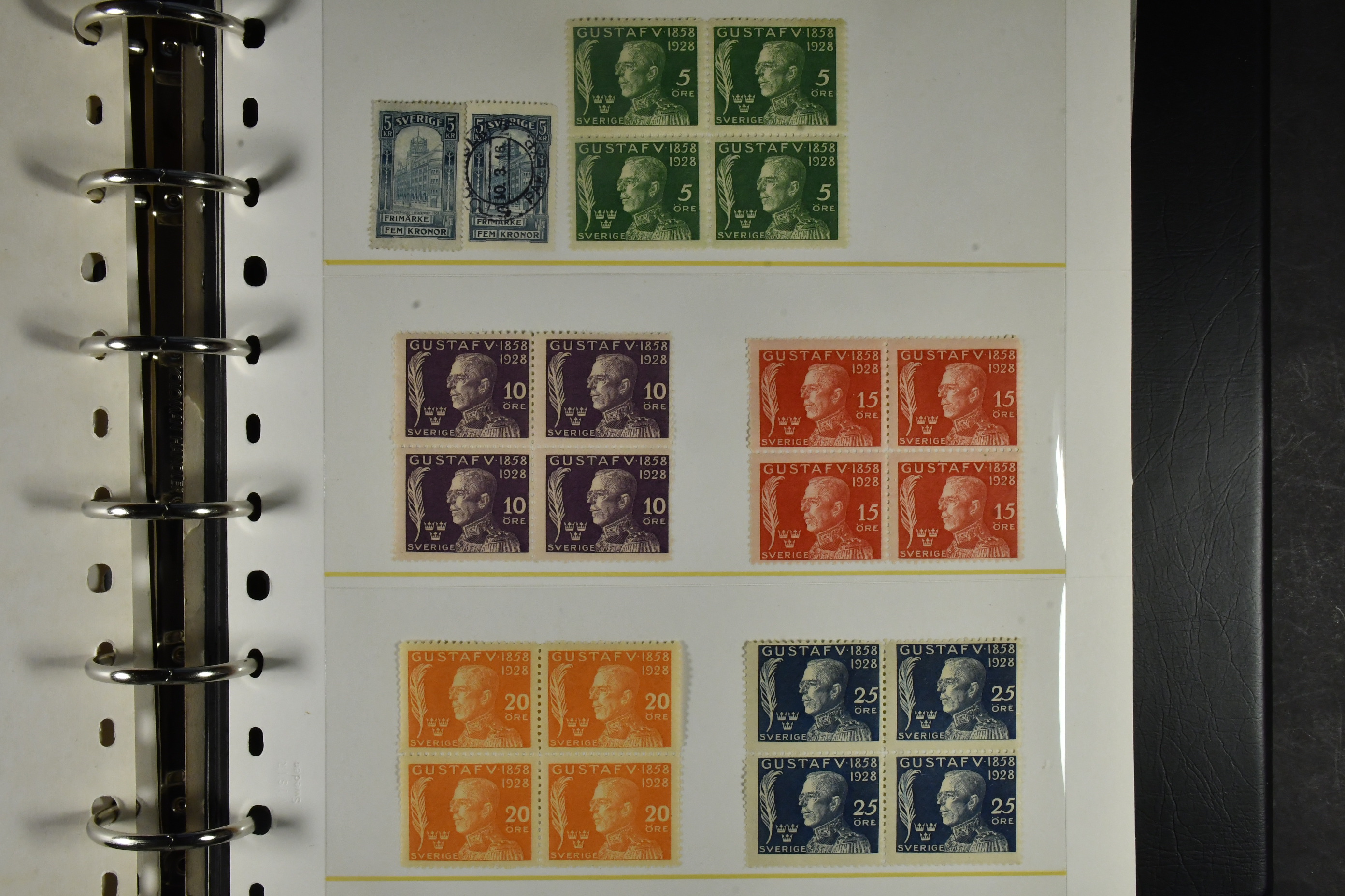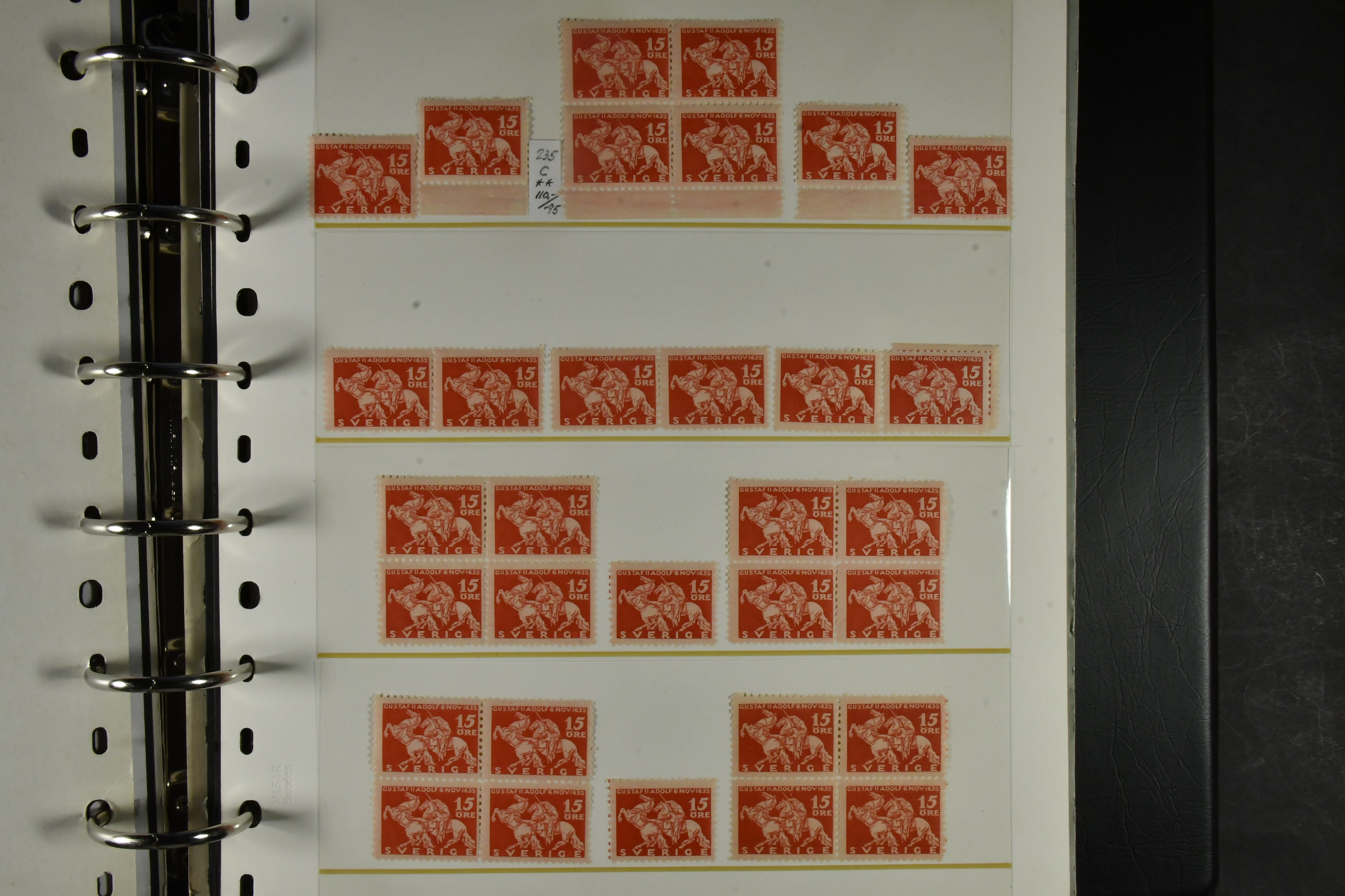 Sweden. Accumulation mostly ★★ 1928–1949 in visir album. Stock material, starting with King Gustaf V 70 years and ending with King Gustaf V regular issue (1939–49). A few older and/or cancelled stamps, plus one booklet are also included. Fine quality. (>500)