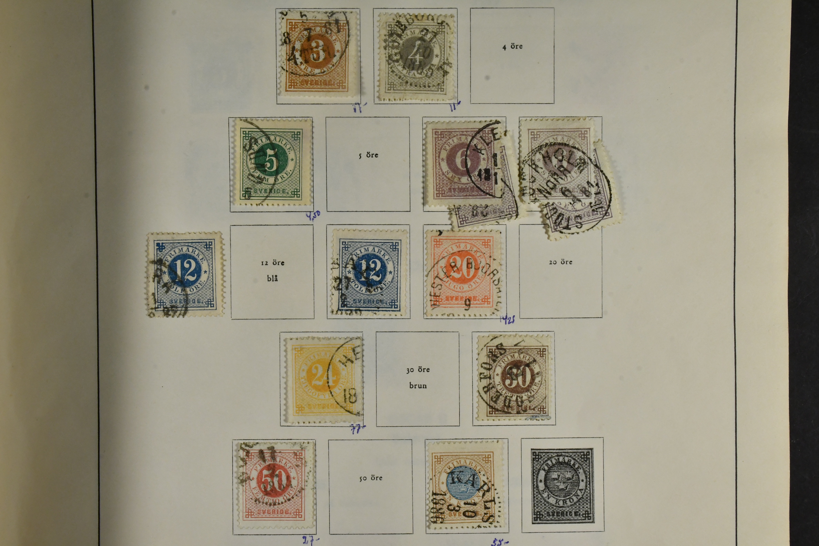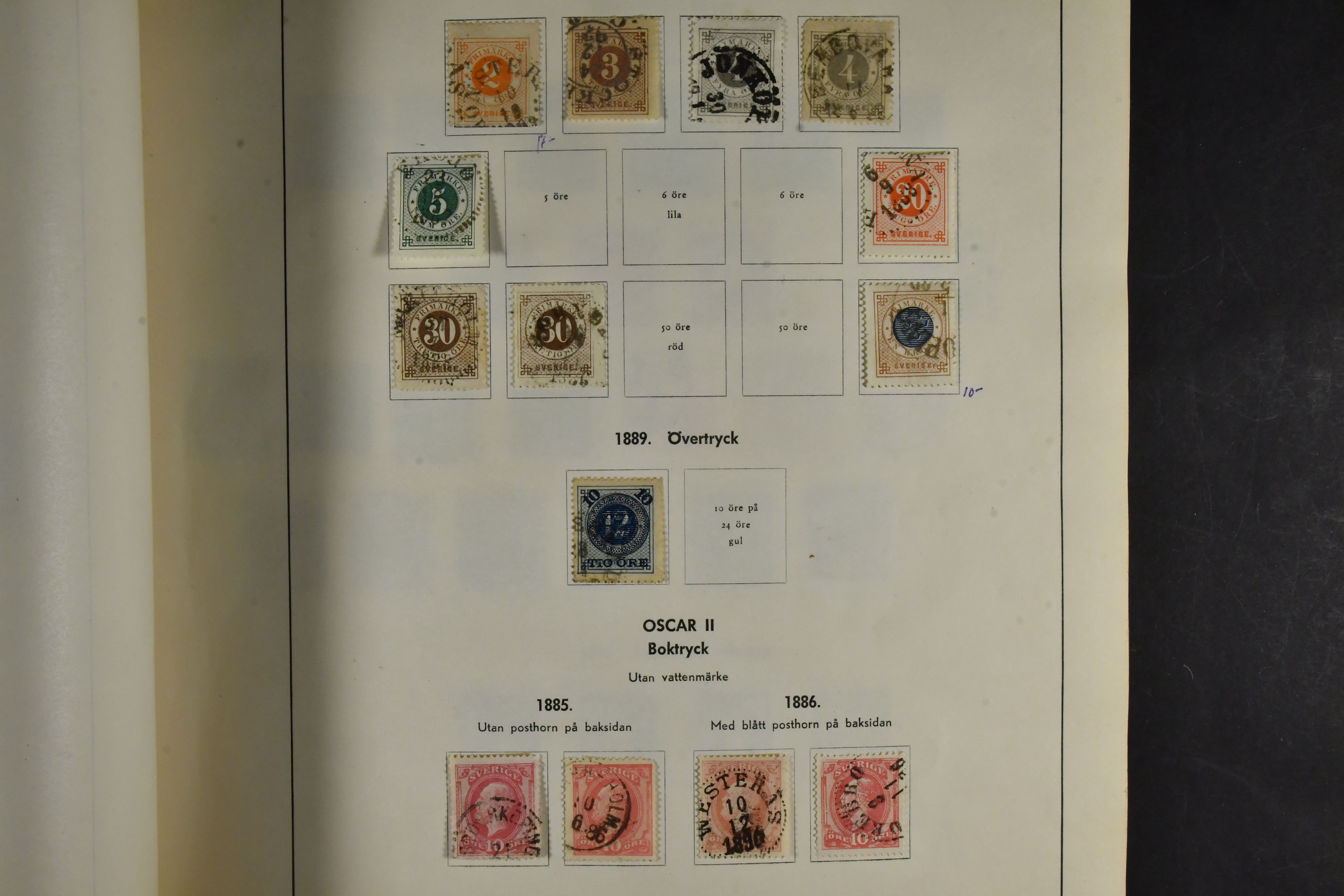 Sweden. Accumulation used 1858–1984 in box. Three albums/stockbooks of which one can be considered as a stock material. In one of the albums quite a lot of fine cancellations. Please see a selection of scans at www.philea.se. Somewhat mixed quality. Approx. 5 kg. (>1500)