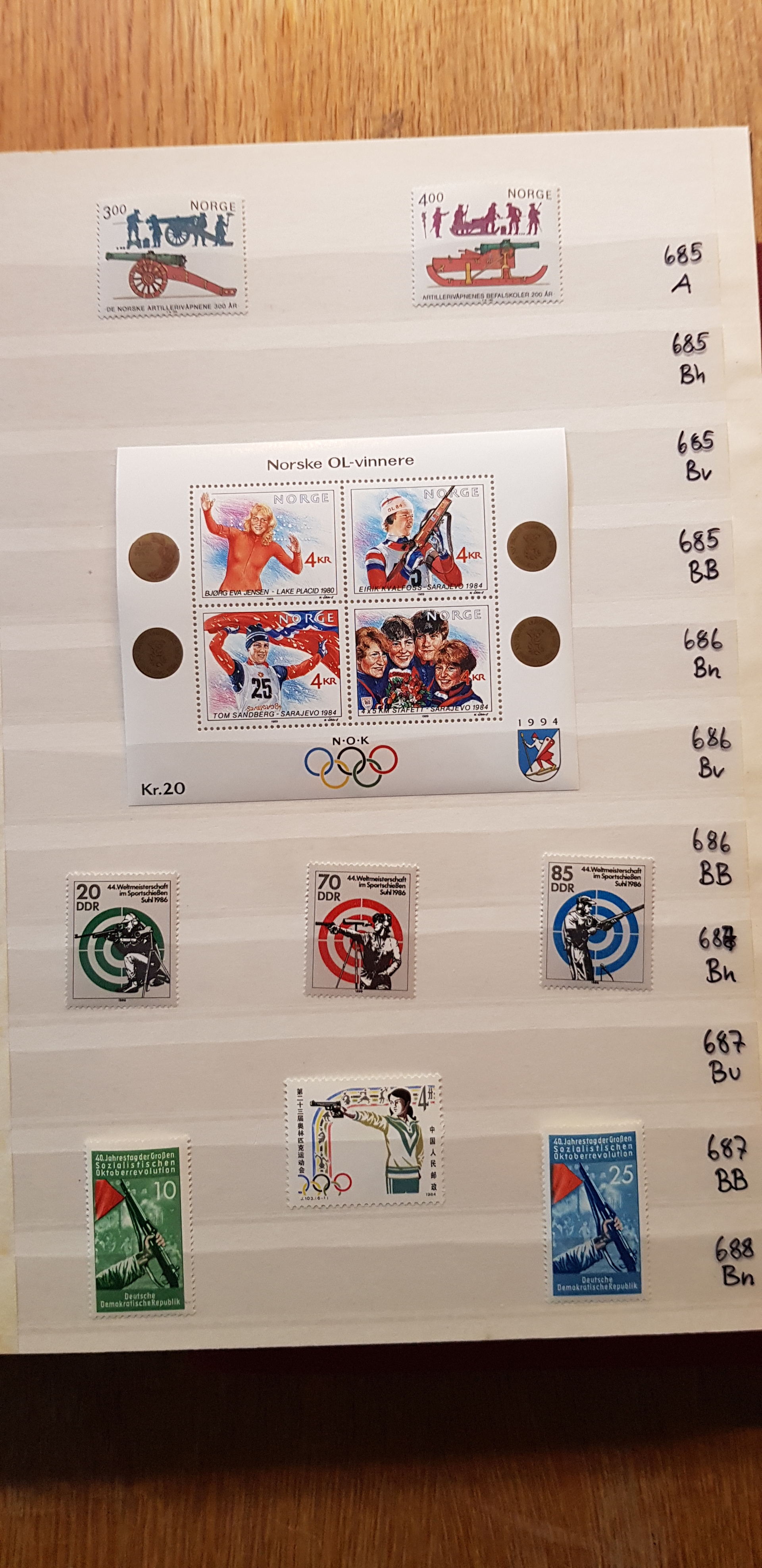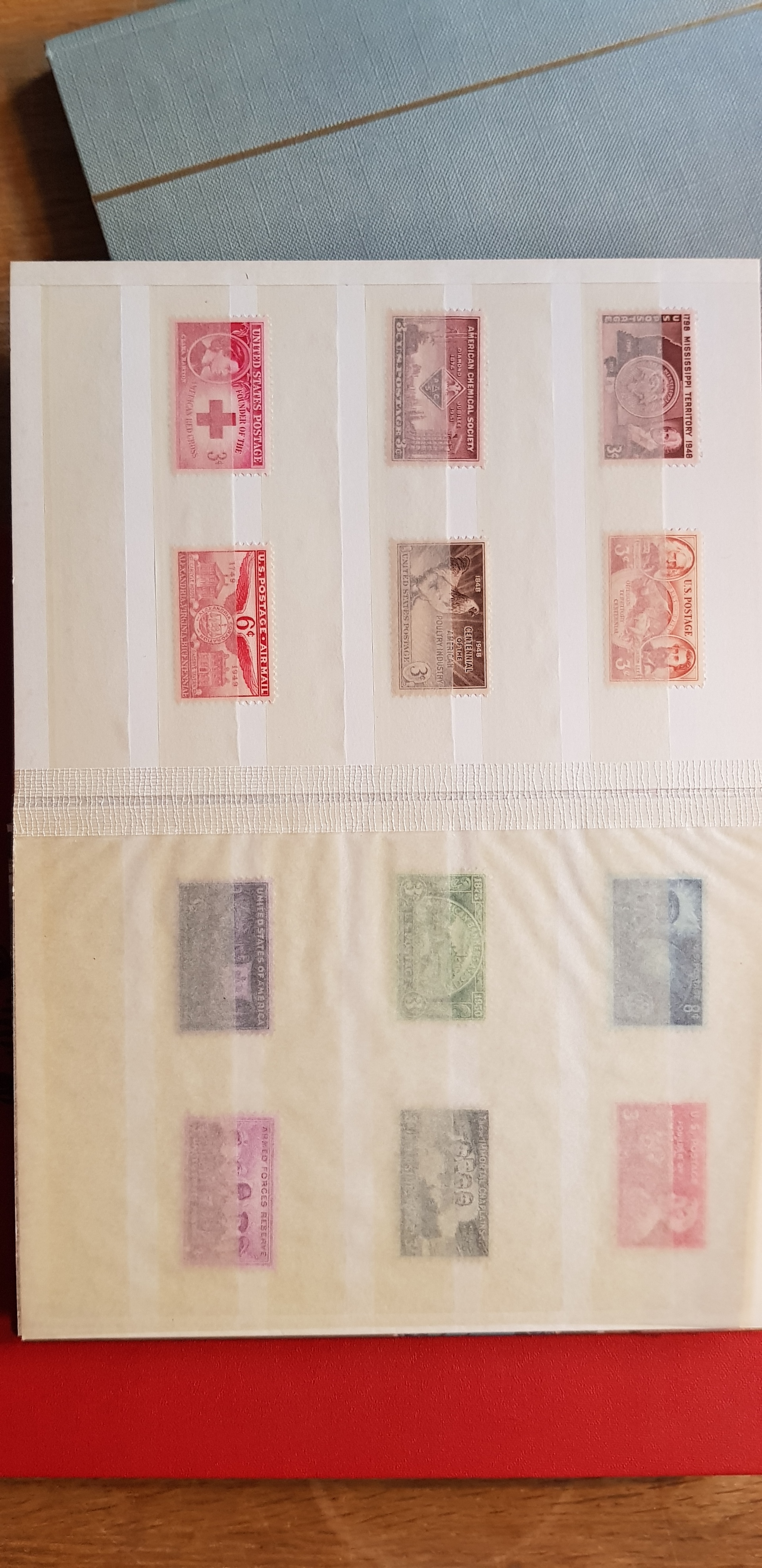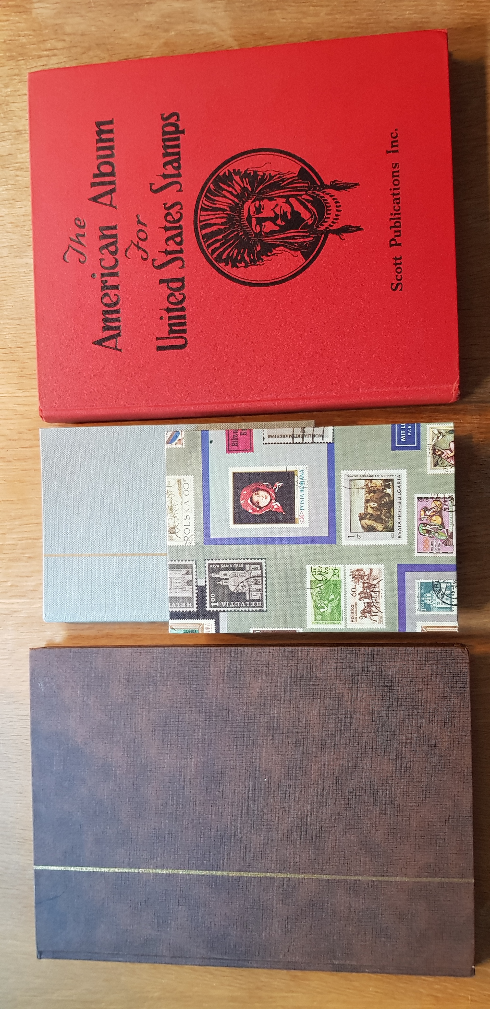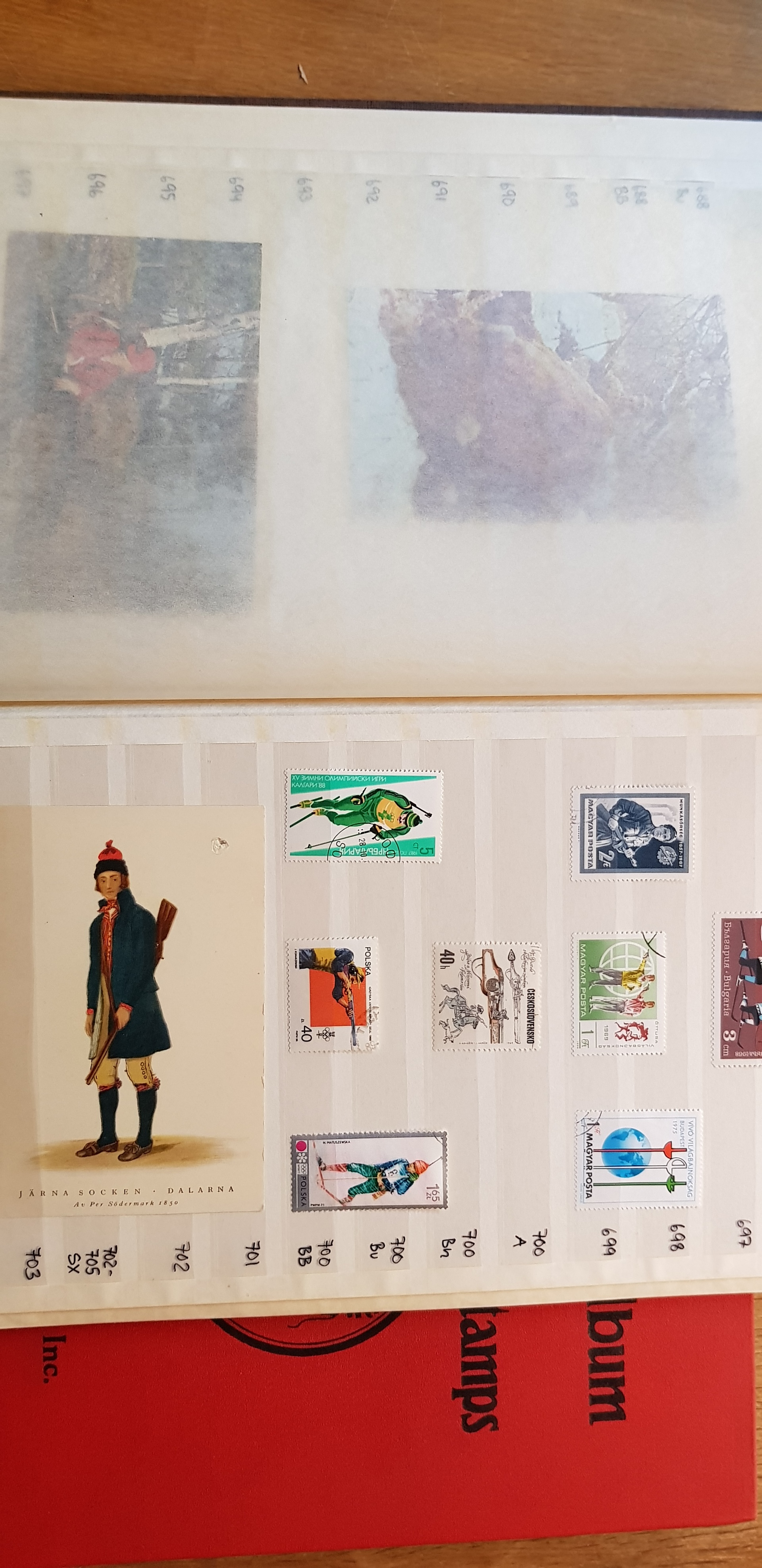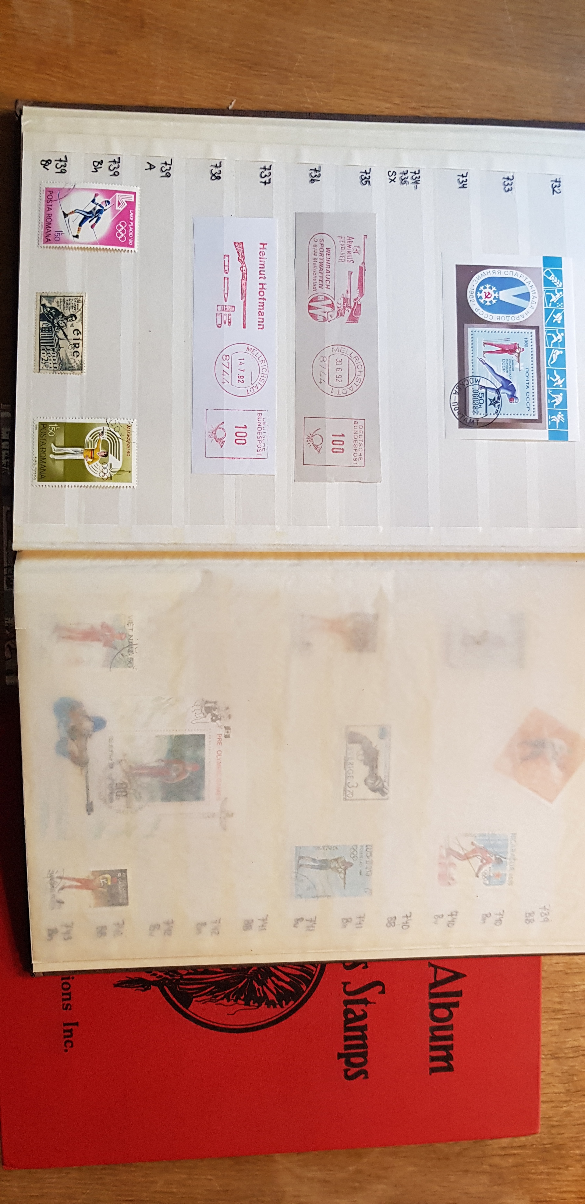 Thematics, Sport. Collection/accumulation mostly used 1900s in box. One album that contains of Hunting & Gun Stamps and Envelopes. 3 albums that contains of USA, the red album is a very nice one but has no stamps, the other two are full of stamps most used and unused.. Mostly fine quality. (>200)