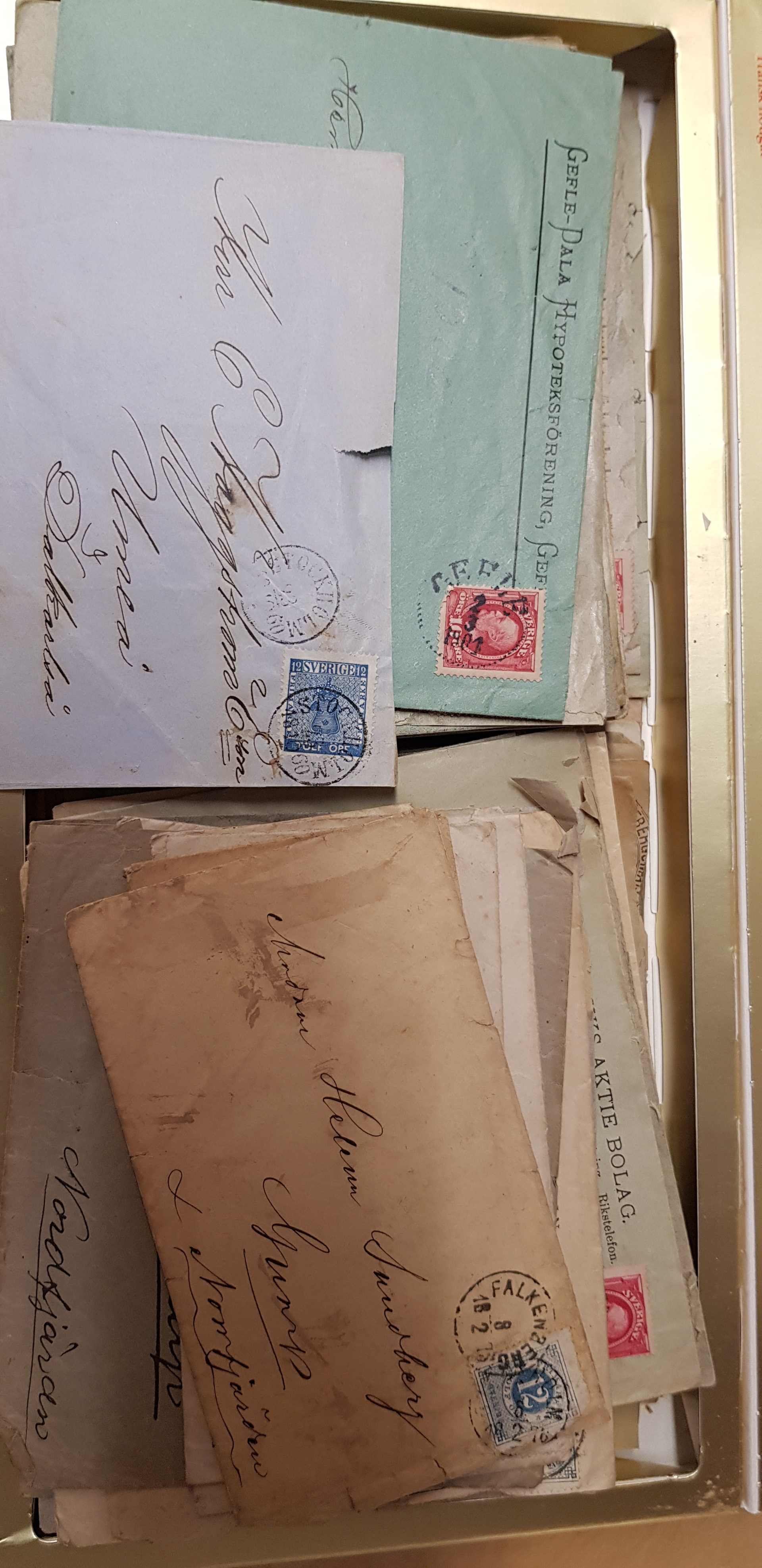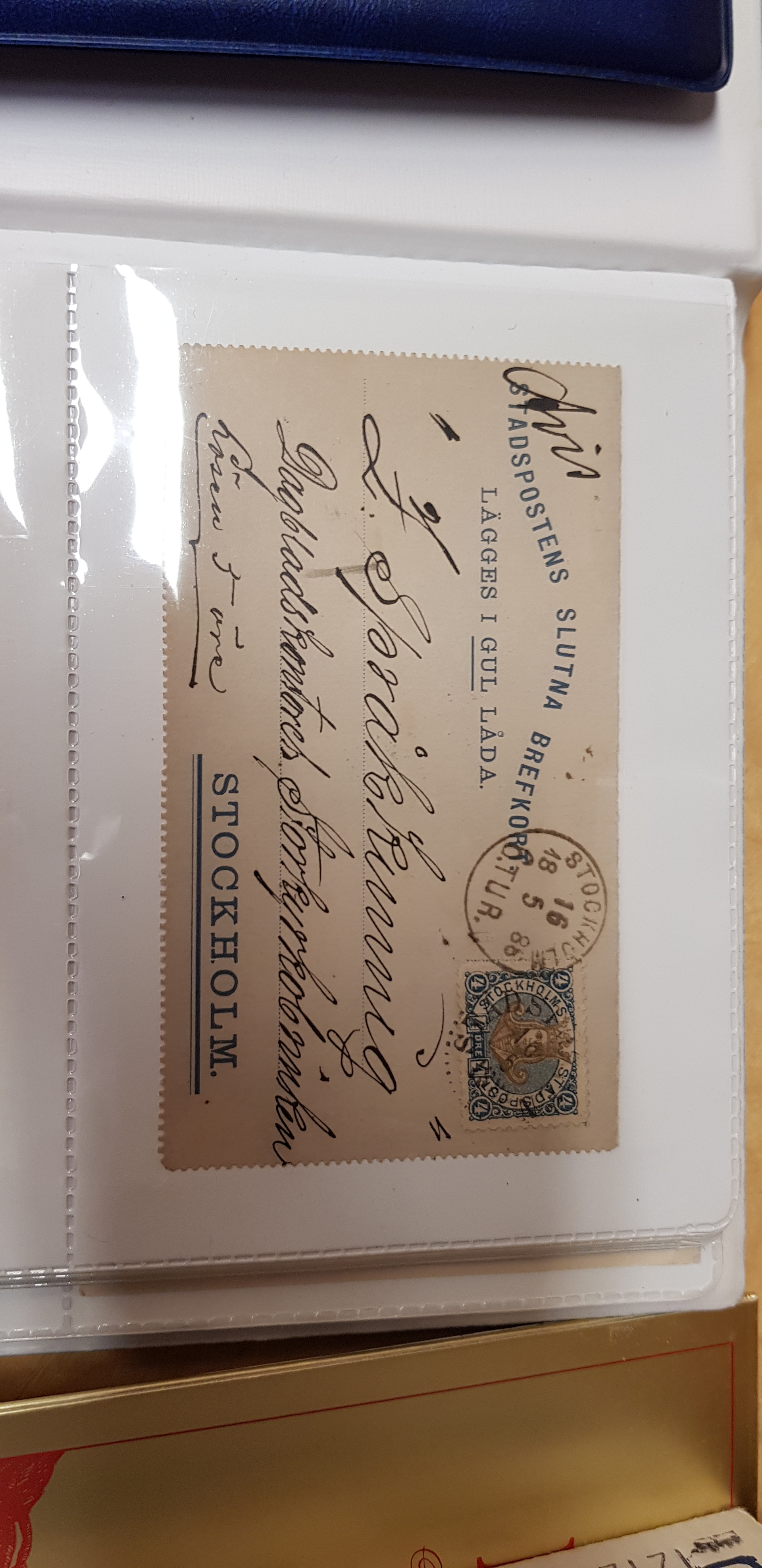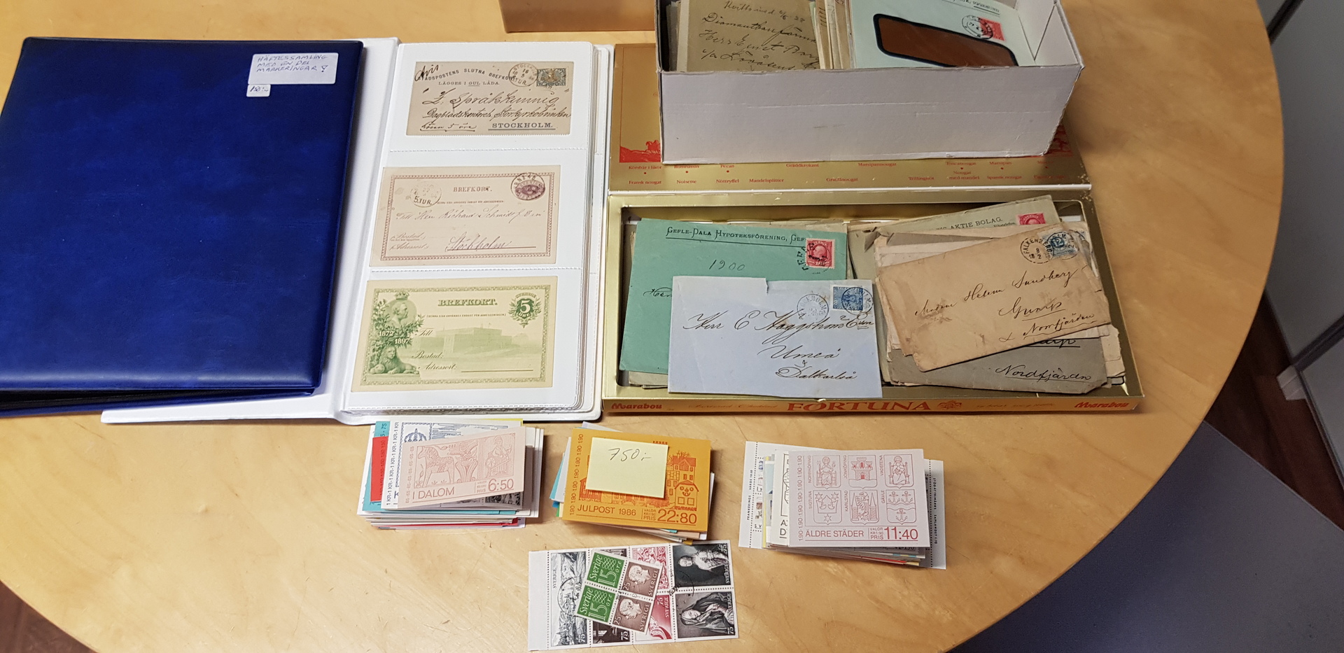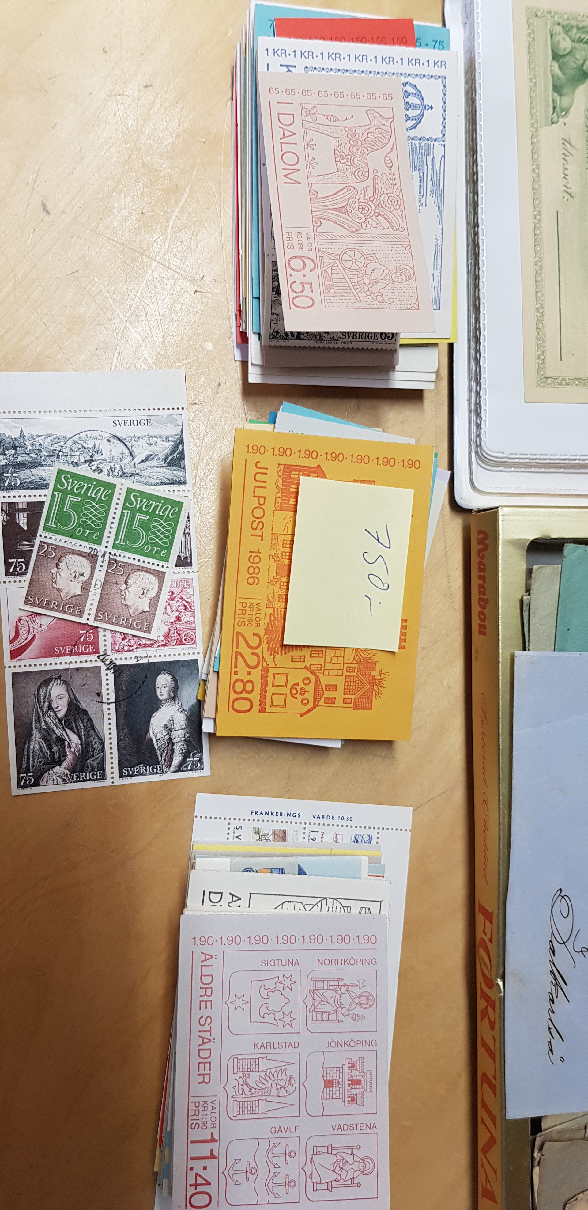 Sweden. Collection/accumulation mostly ★★ 1900s in box. Unused stamps of a Pstage value of 750SEK. Old envelopes in two boxes and old Postcards. One box with stamp macatura from 1972. Please see a selection of scans at www.philea.se. Mostly fine quality.