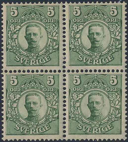 Sweden. Facit 75vm2 ★★, 5 öre green in a block-of-four with watermark parts of two crowns. SEK 2600