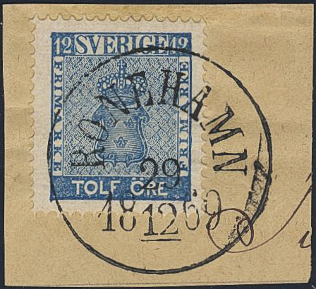 Sweden. Facit 9, I county. RONEHAMN 29.12.1869, circle cancellation. Very nice cut piece.