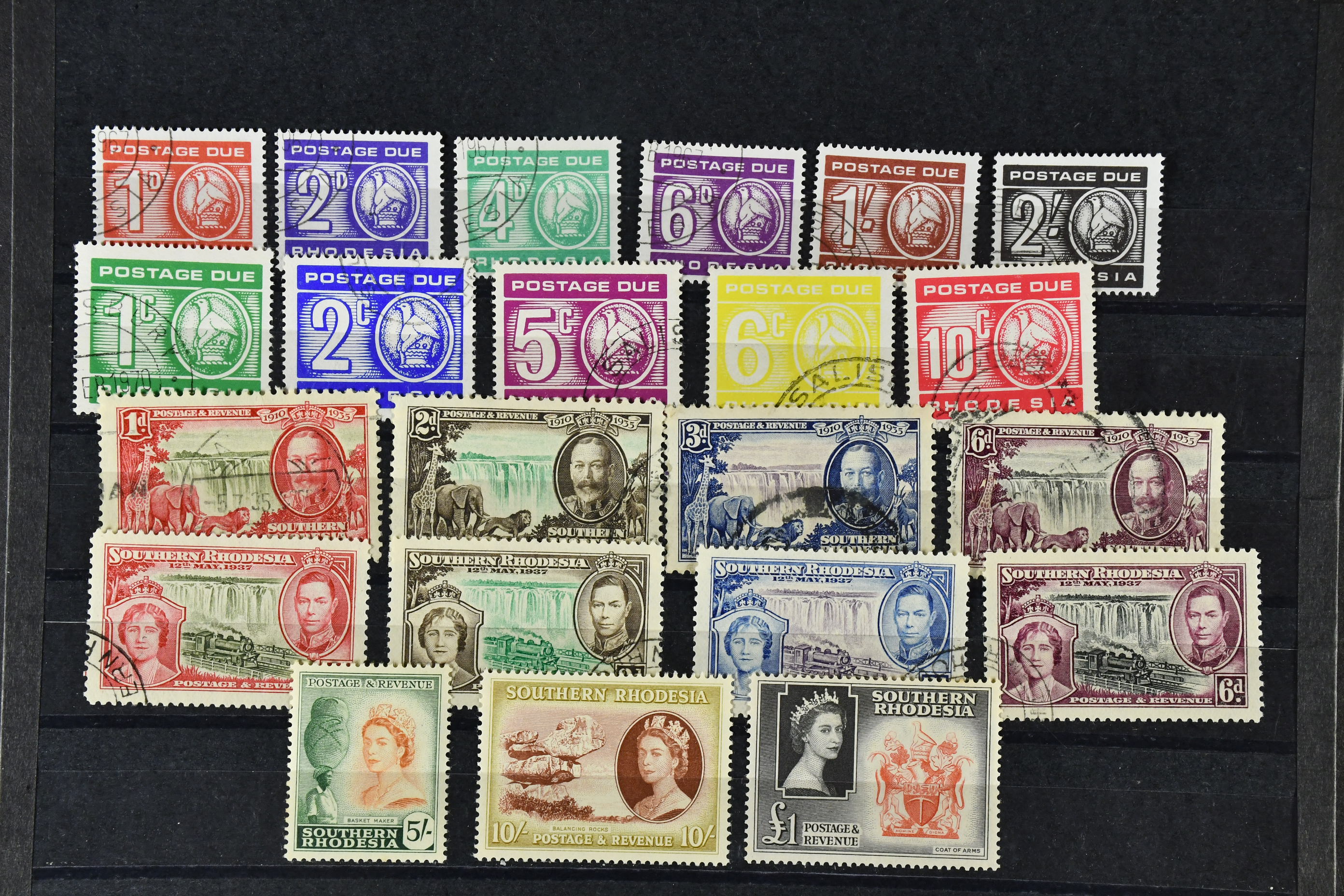 Rhodesia. Lot ★★/⊙ 1935–1953 on stock cards. Includes Silver Jubilee set (1935) Coronation set (1937) and Postage Due. Fine quality. (22)