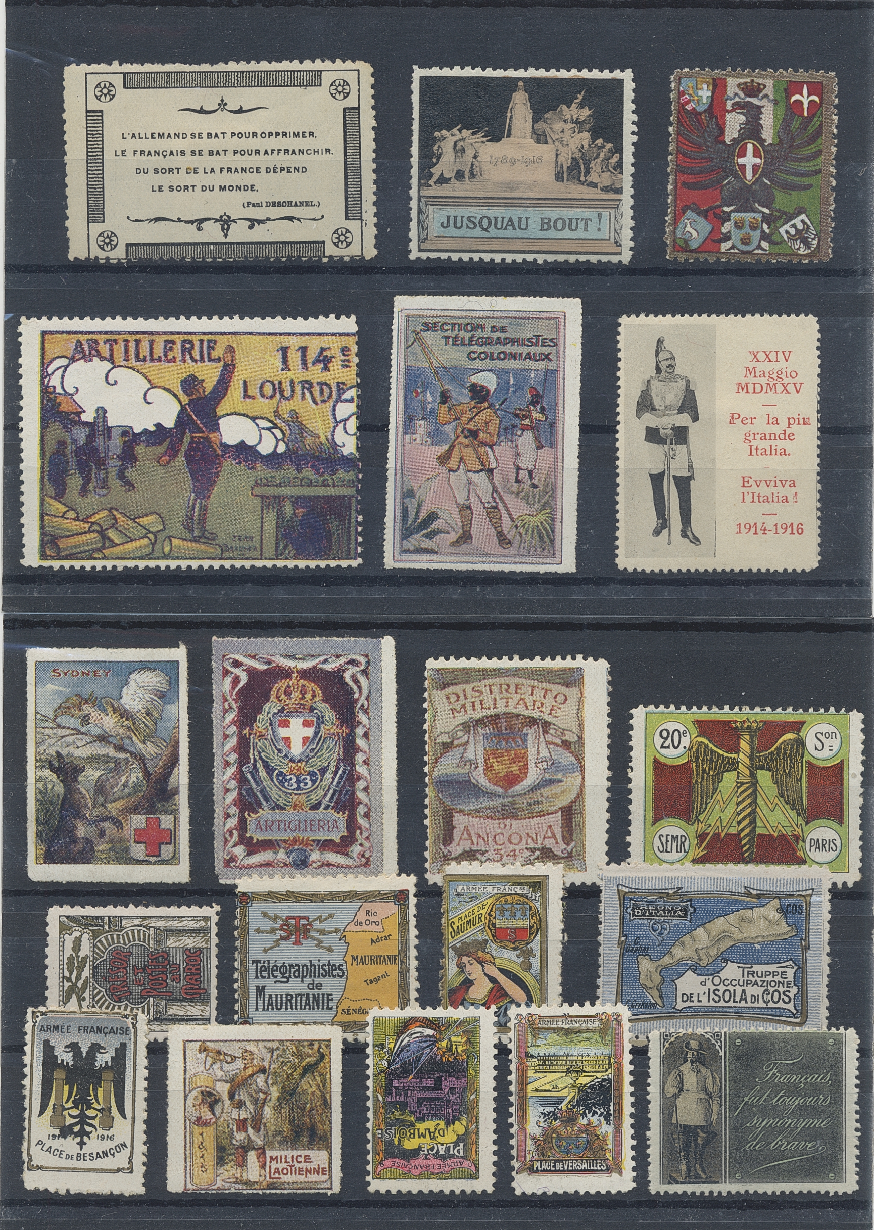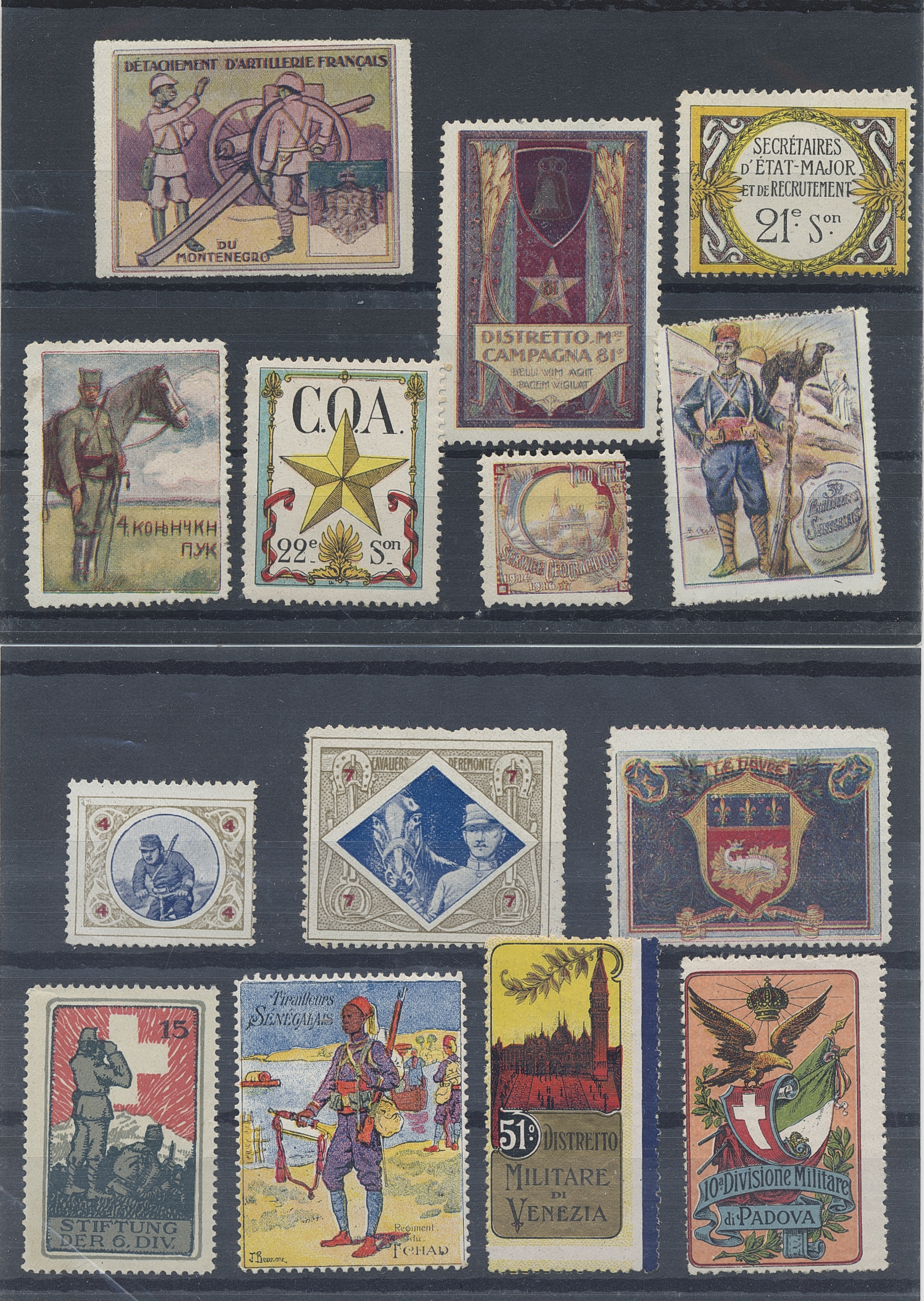 France. Seals, lot. WW1 Delandre labels, 32 different, and one Swiss WW2 solidier stamp. All * in very fine condition. Also Russia, Germay, Italy and Africa. The entire lot is presented at www.philea.se. (33)