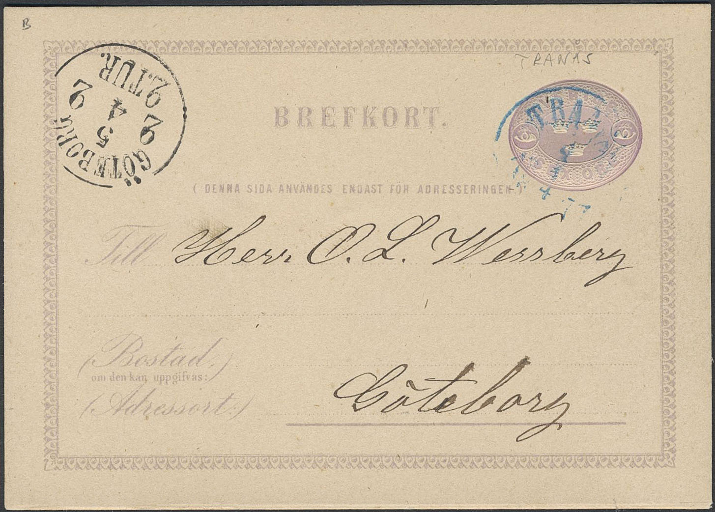 Sweden. Facit bKe2, F county. TRANÅS 4.4.1877. Cancel in blue colour. Very scarce, RR (= 1–2 recorded) according to SSPD.