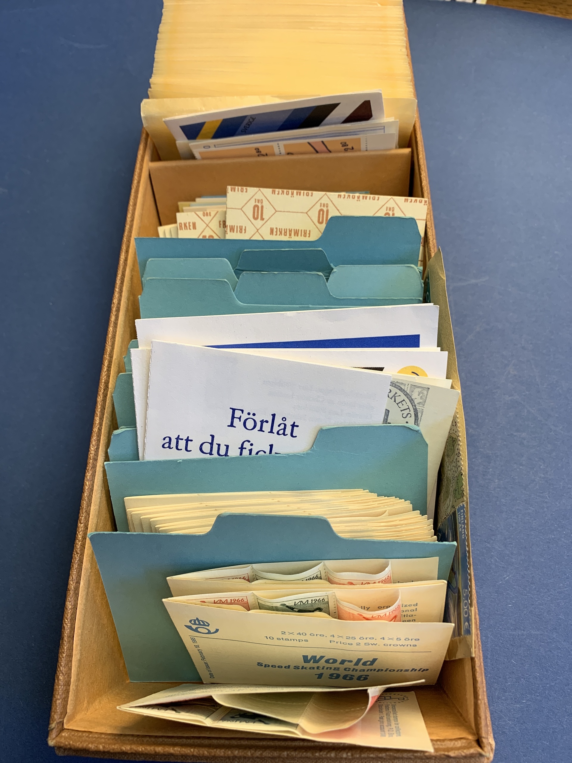 Sweden. Miscellaneous, collection/accumulation. Brown box with slot machine booklets, approval booklets, a stockbook with Swedish and foreign stamps and two elegant empty Chinese albums in a slip case. Please see a selection of scans at www.philea.se.