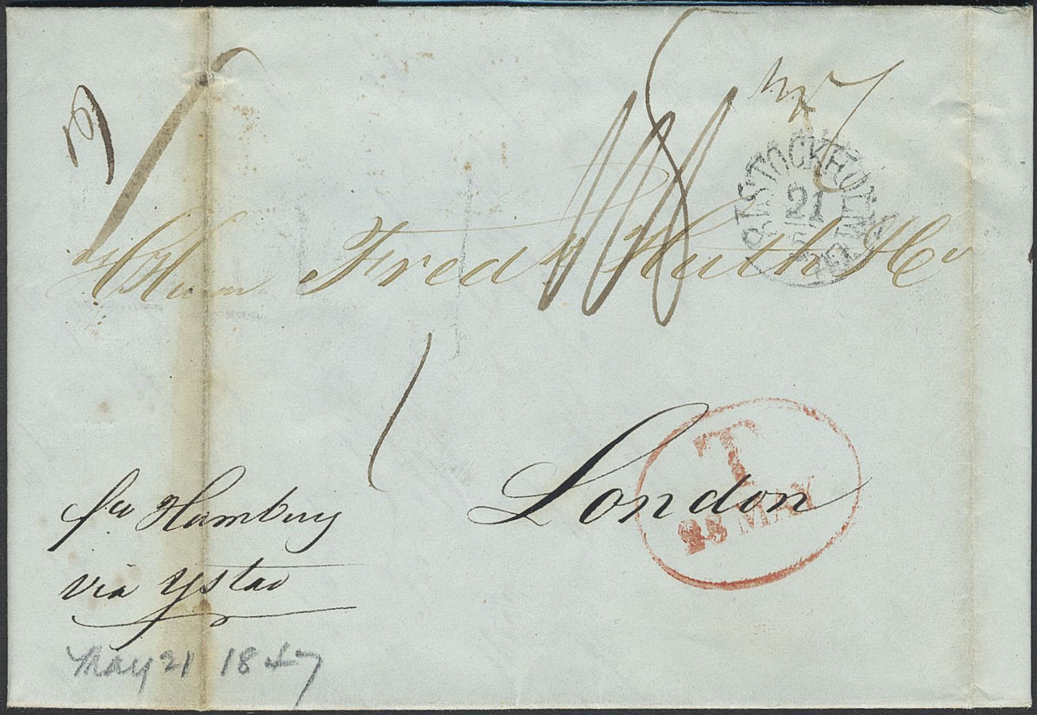 Sweden. Foreign-related cover. Great Britain. Folded letter dated "Stockholm den 21 May 1847" sent to London. Transit pmk KSNPC i STRALSUND D. 25 MAI, type 2 (P: 1500). Archive folds.