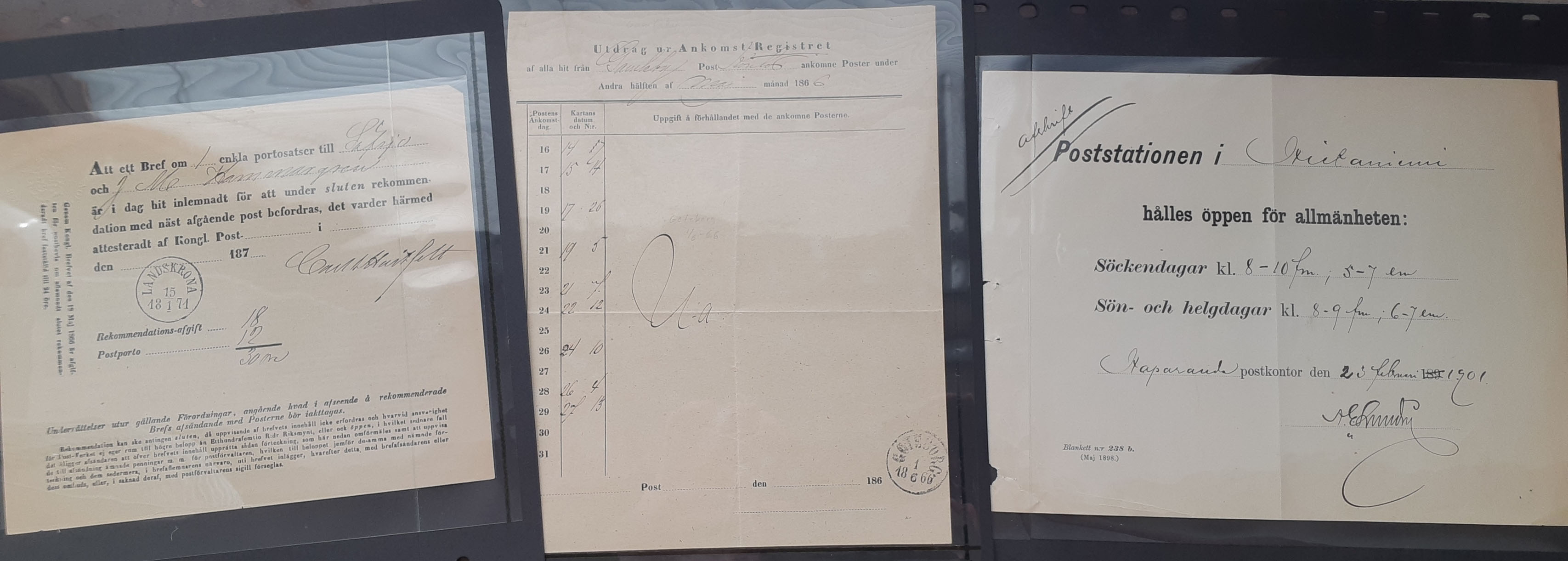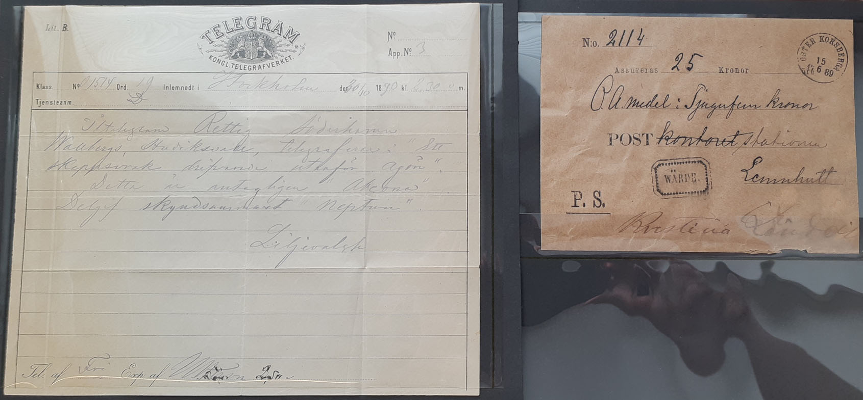 Sweden. Postal forms, lot 1871–1901 on visir leaves. Receipt for a registered letter cancelled LANDSKRONA 15.1.1871, "Utdrag ur Ankomst-Registret", postal form No. 238 b with specified business hours for the post office in Hietaniemi, a telegram with interesting content: "il-telegram ... Ett skeppsvrak drifvande utanför Agön, detta är antagligen "Akeona". Delgif skyndsamt "Neptun" and a PS-envelope cancelled ÖSTER KORSBERGA 15.6.1889. Somewhat mixed quality. (5)