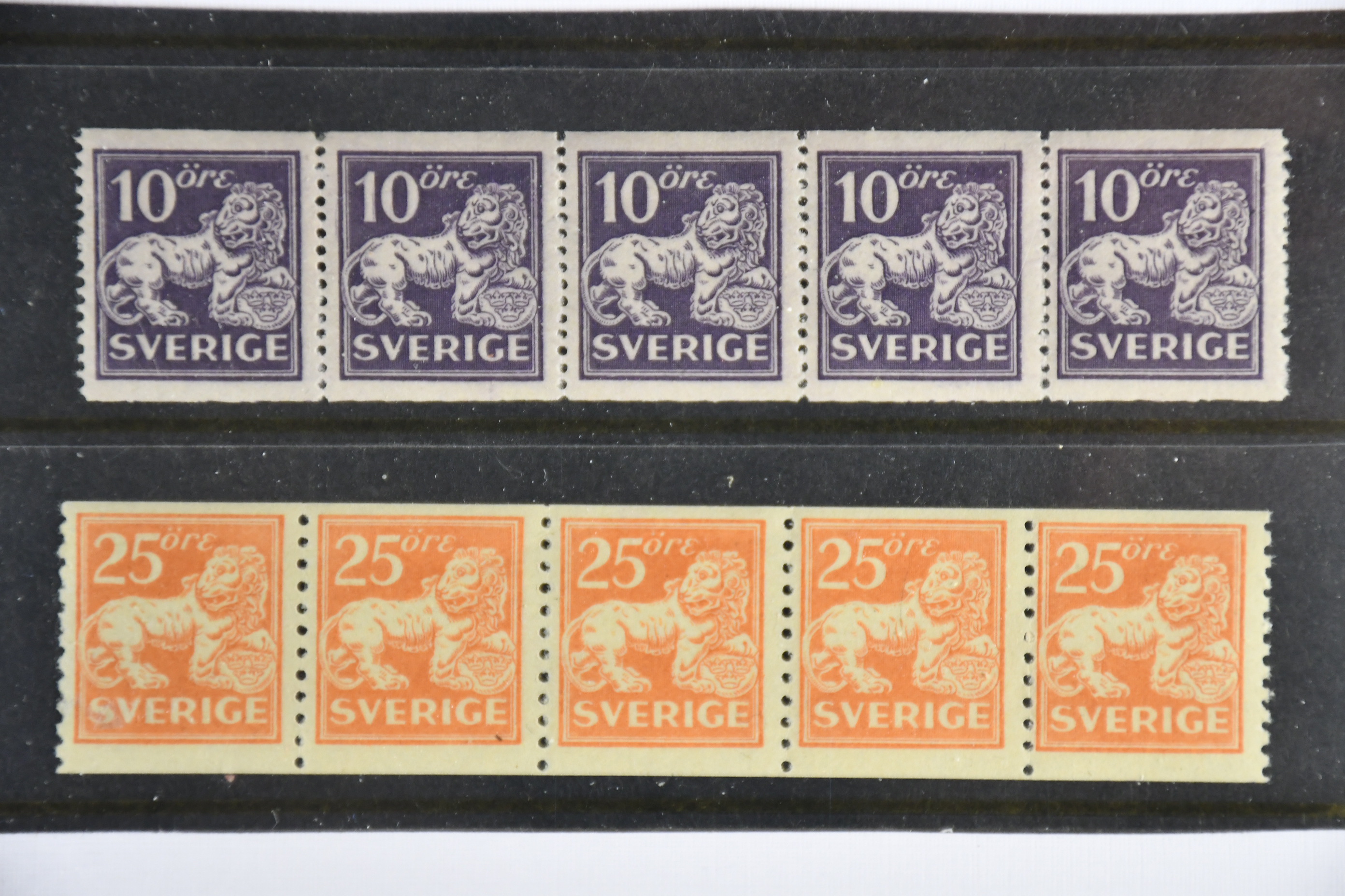 Sweden. Facit 145Eb ★★, 10 öre ultramarinish violet type I vertical perf 13 without wmk on pale rose toned thin paper (A2). 10 öre ultramarinish violet type I vertical perf 13 without wmk on pale rose toned thin paper (A2) and 25 öre orange in strip of five. SEK 3750