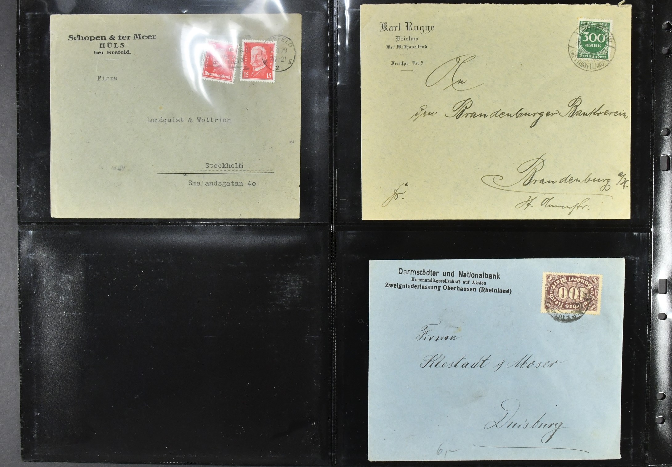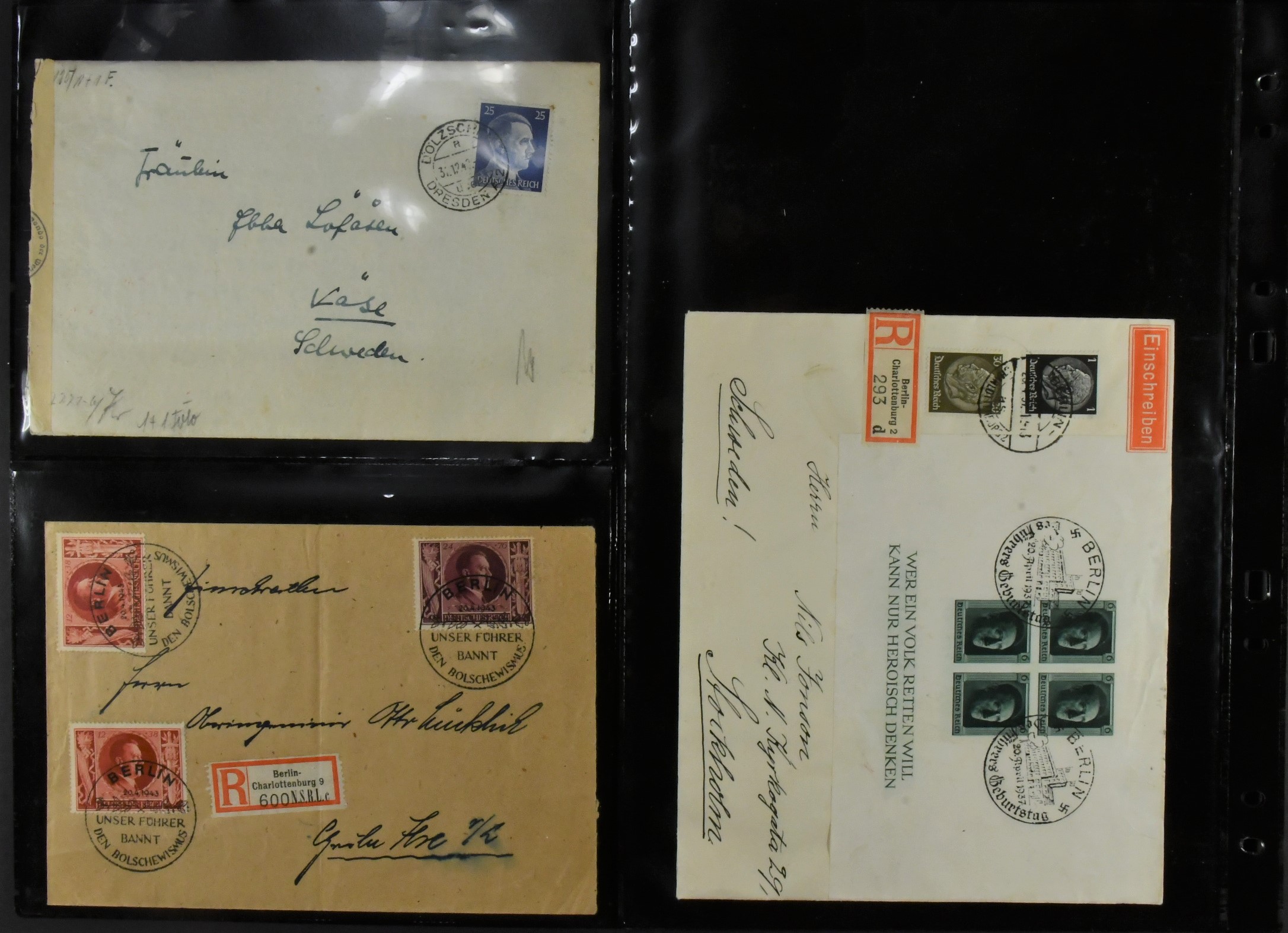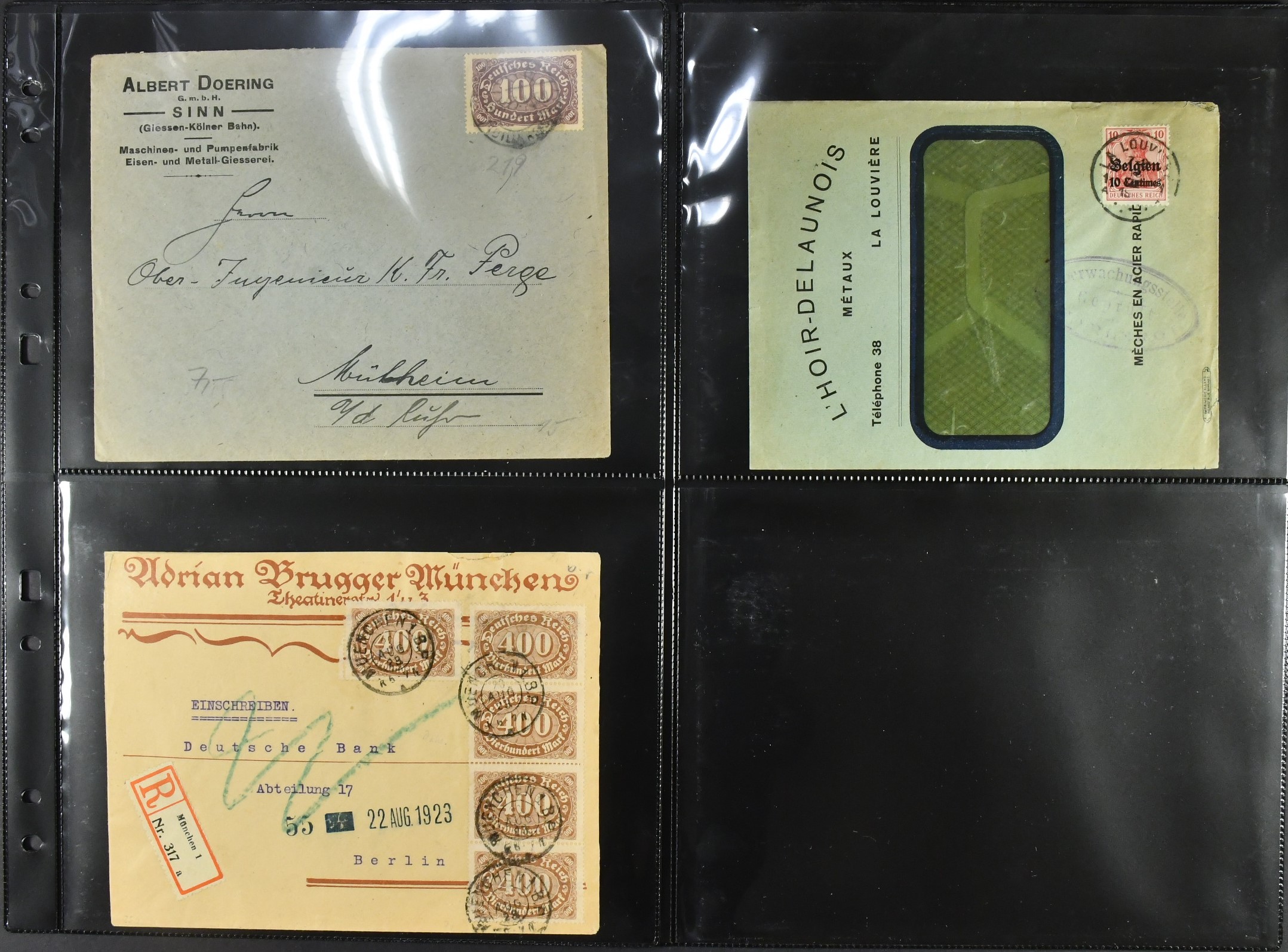 Germany, Reich. Covers, lot covers 1915–1944 on plastic sleeves. Covers and about 30 ppcs. E.g. two with s/s, some infla and WW1 occ. of Belgium. (85)