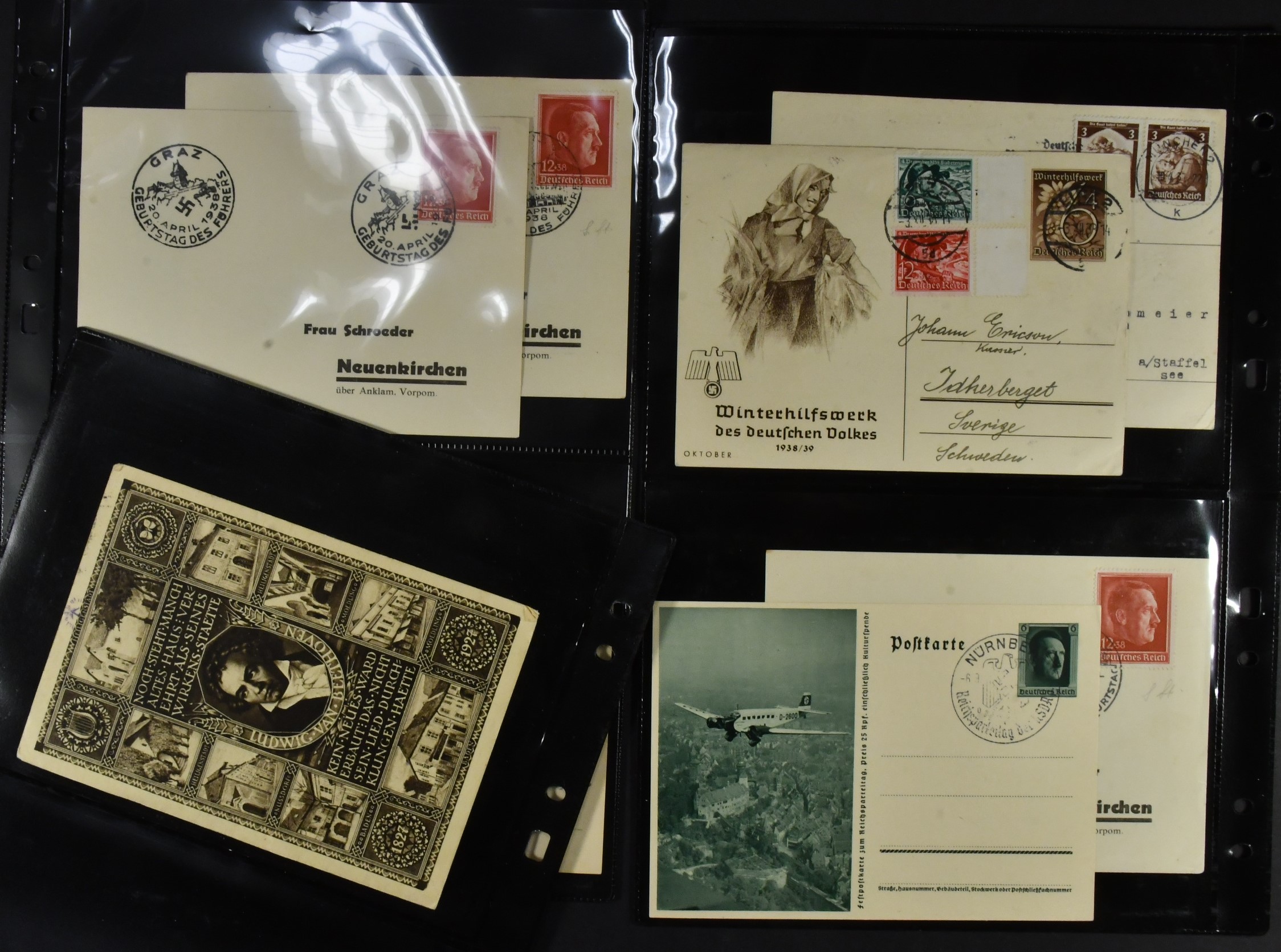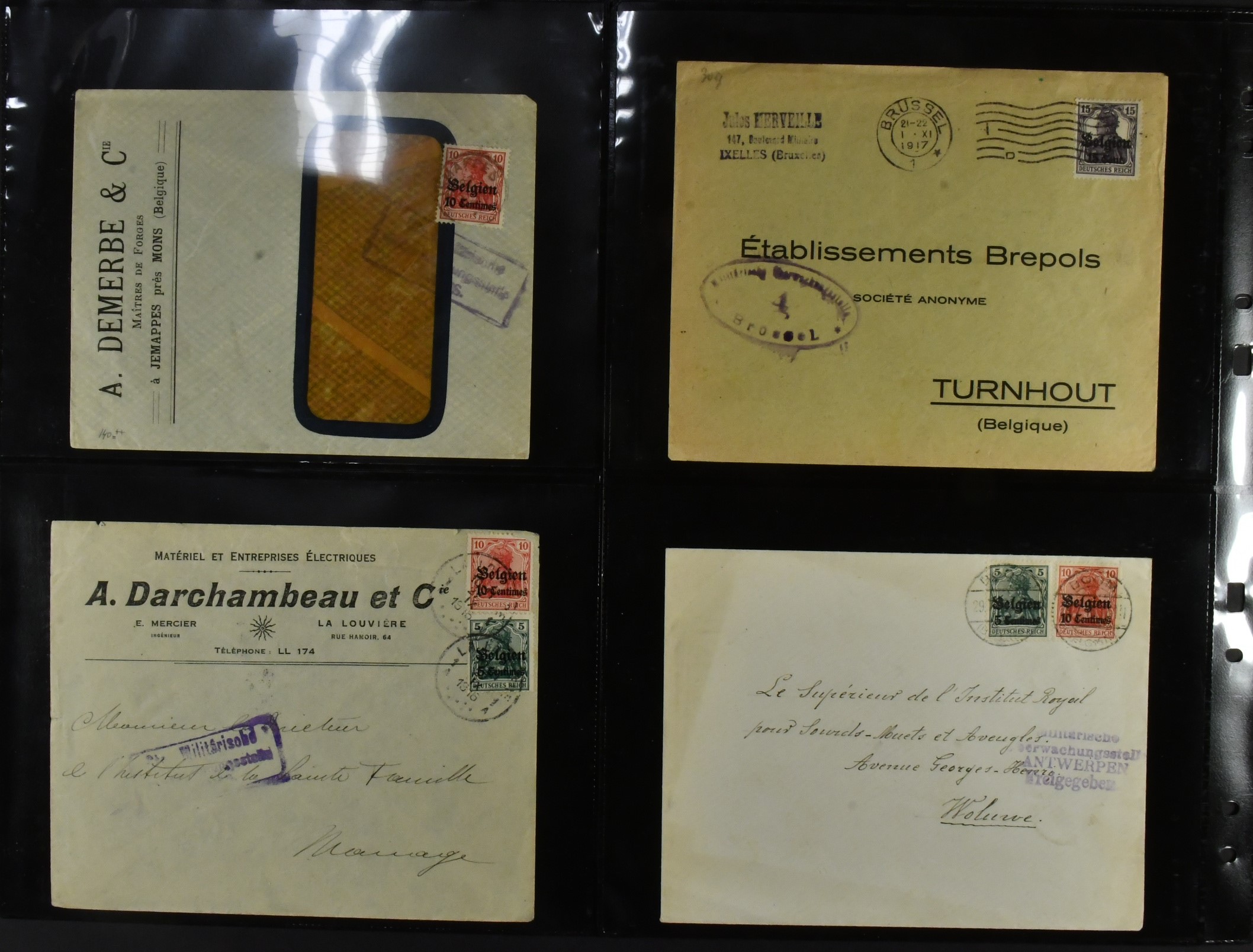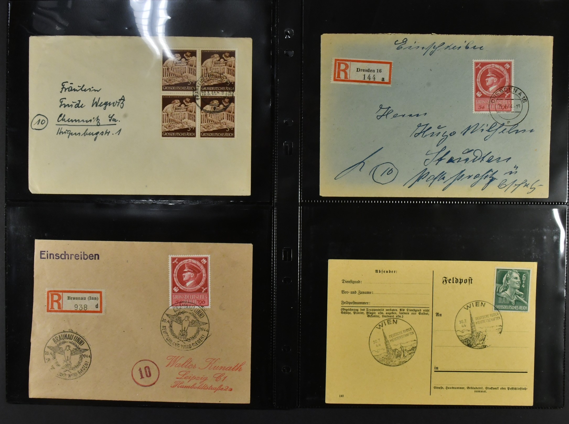 Germany, Reich. Covers, lot covers 1915–1944 on plastic sleeves. Covers and about 30 ppcs. E.g. two with s/s, some infla and WW1 occ. of Belgium. (85)