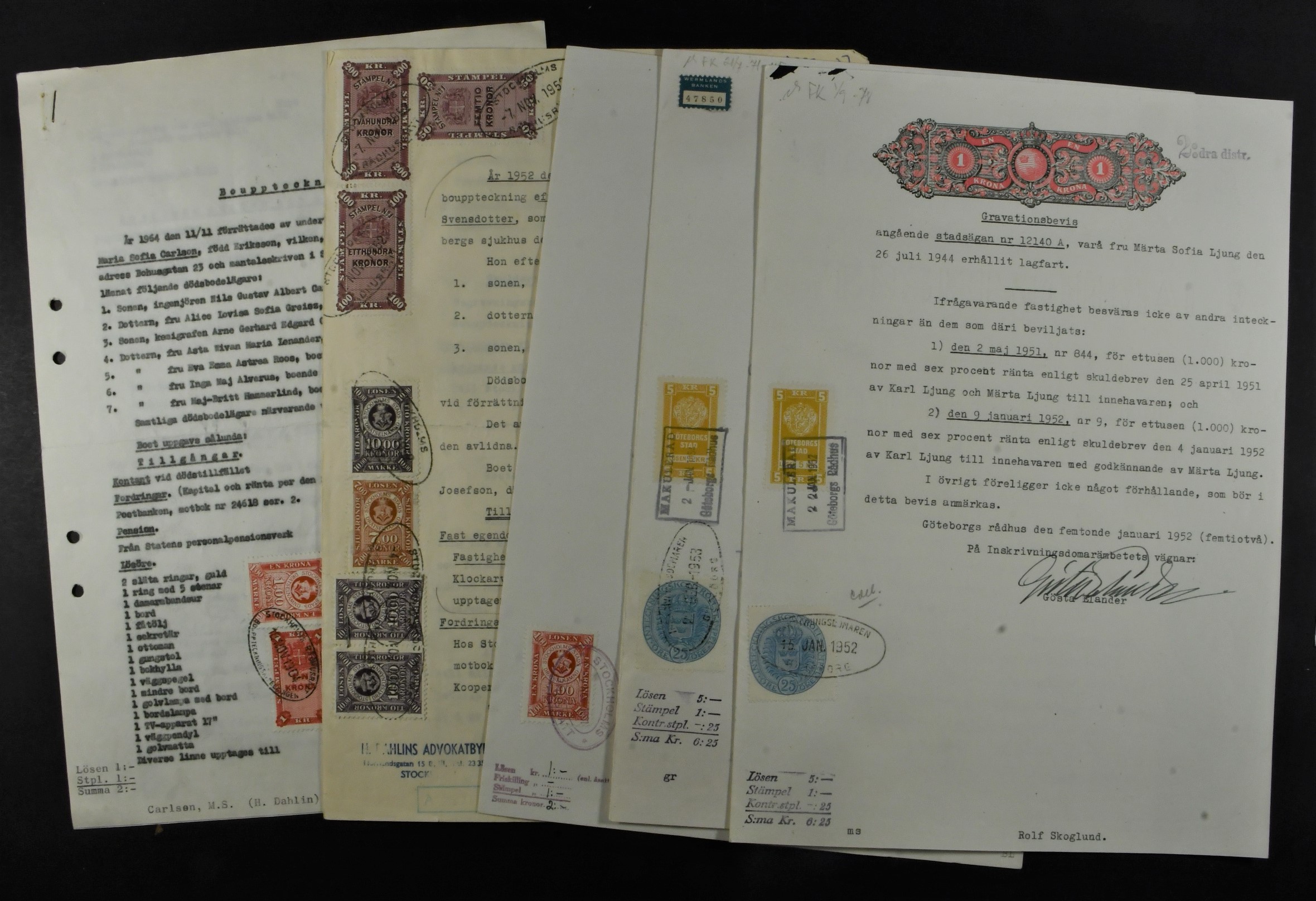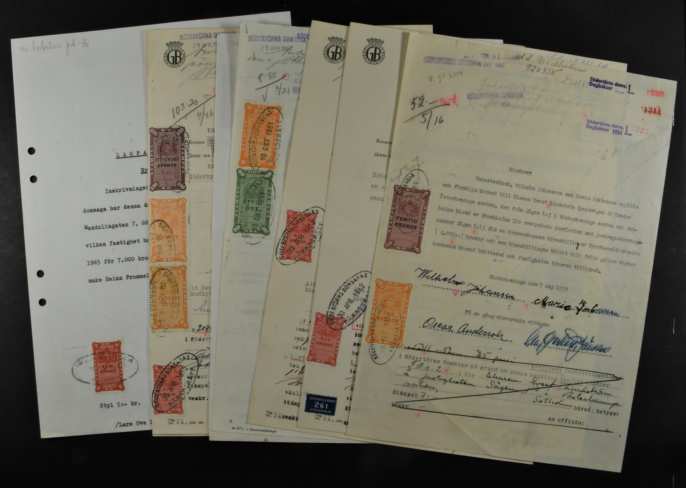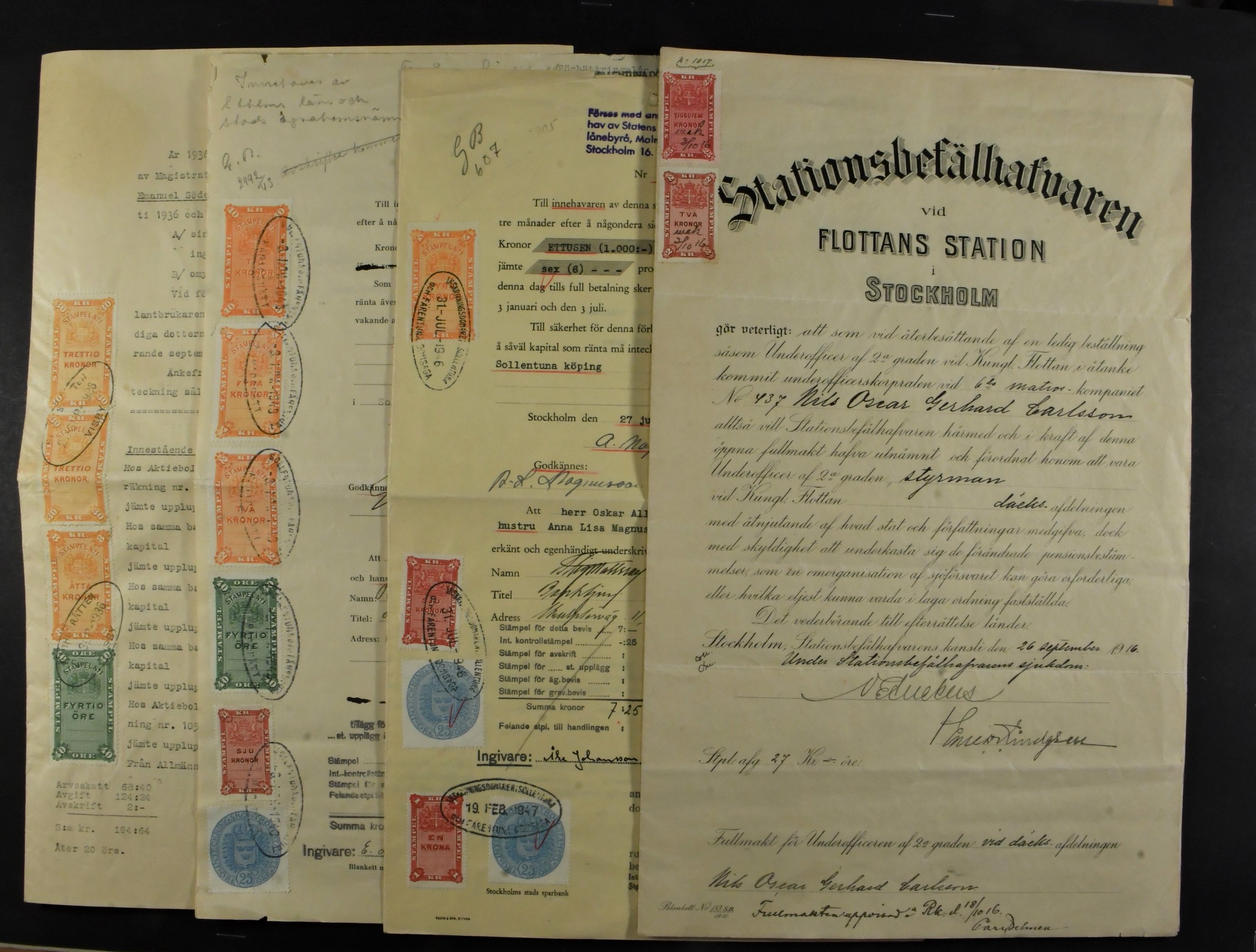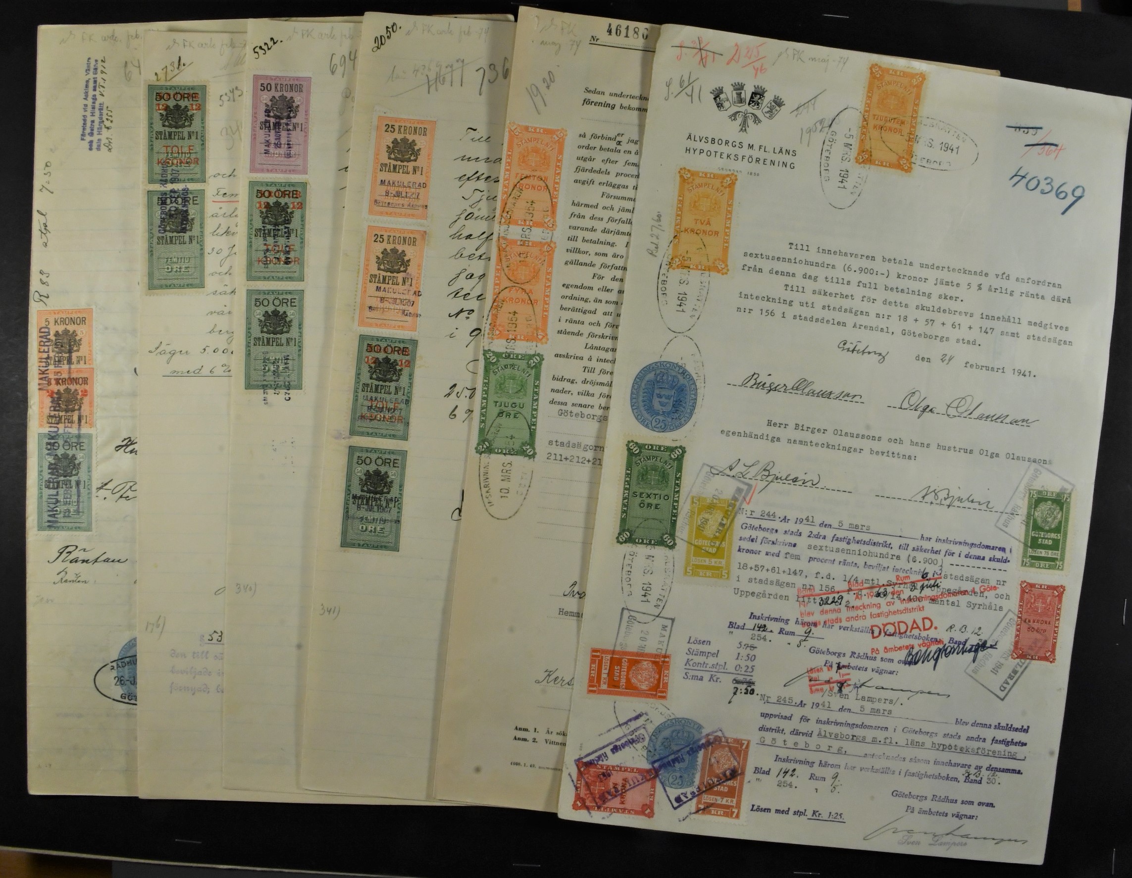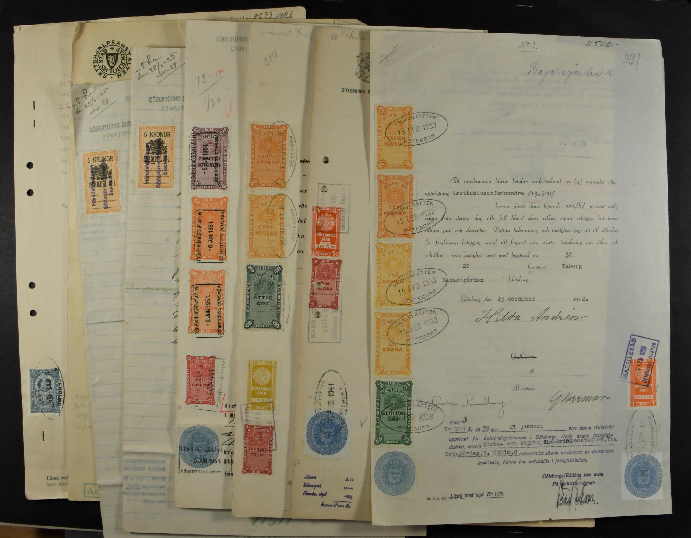 Sweden. Revenues, lot. A various range of documentary revenue stamps on 32 documents, added with Stockholm and Gothenburg municipal revenues on some. (32)