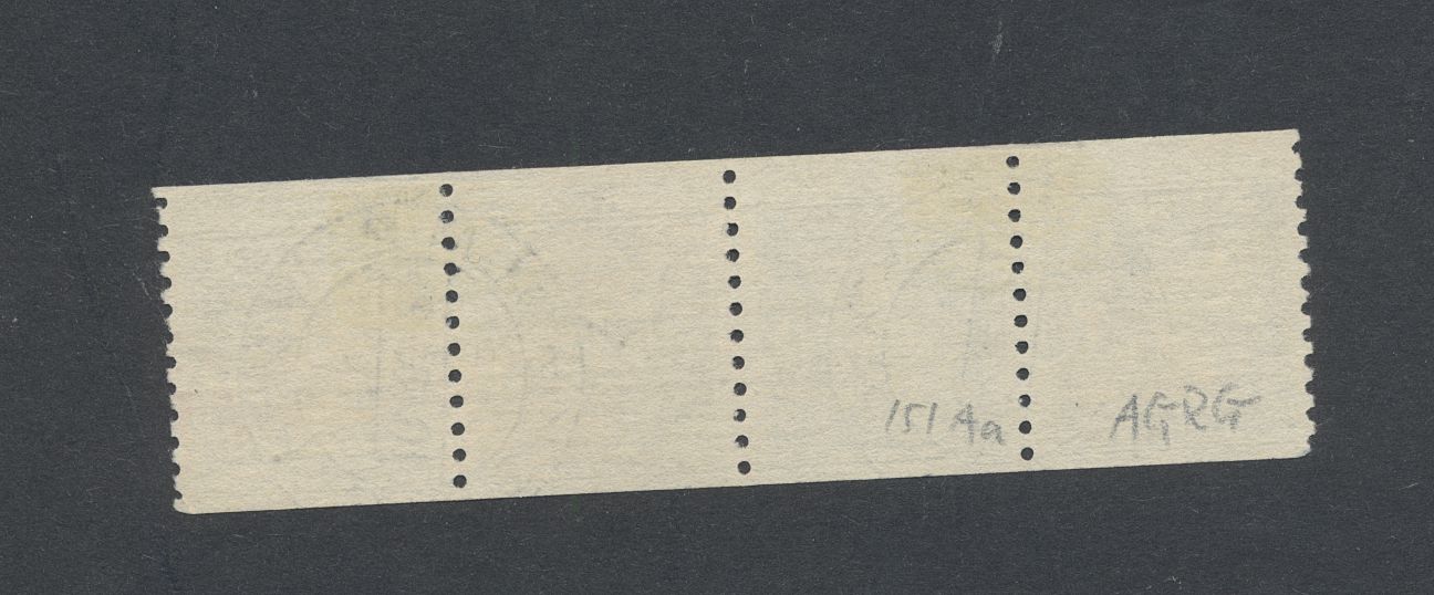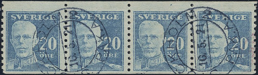 Sweden. Facit 151Ah used, 1920 Gustaf V full face 20 öre pale blue defect granular print vertical perf 9¾ on greenish paper (Agrg) in very fine strip of four. Cancelled STOCKHOLM 2 16.5.21. SEK 11200