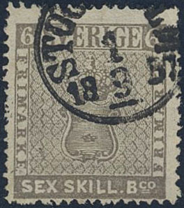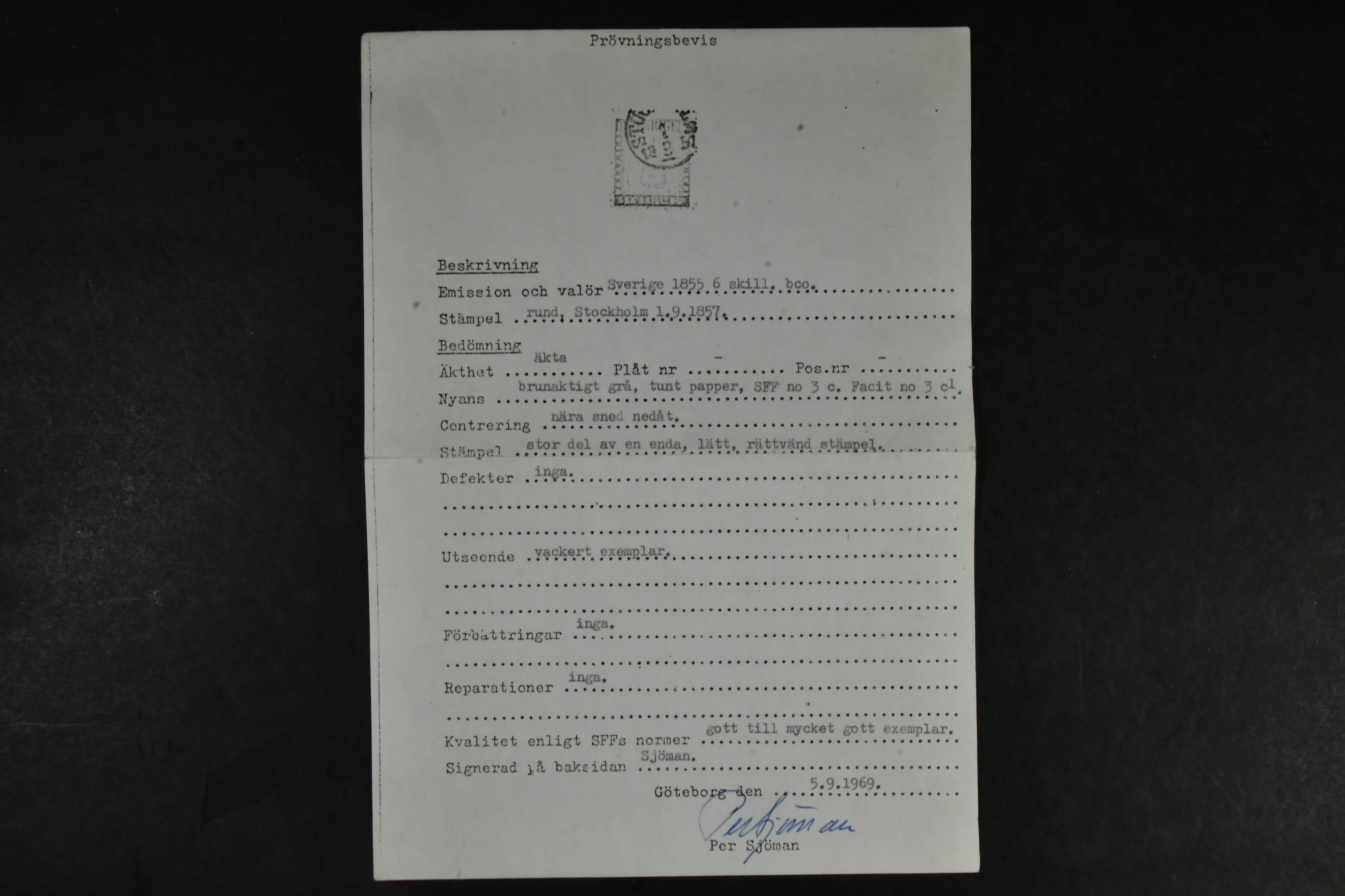 Sweden. Facit 3c used, 6 skill brownish grey on thin paper. Fine–very fine copy cancelled STOCKHOLM 1.9.1857. Signature and certificate by Sjöman (1969). SEK 12000