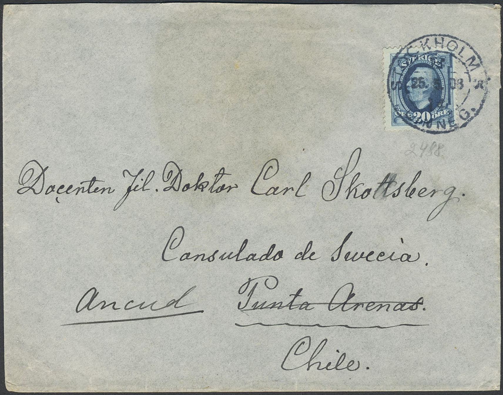 Sweden. Facit 56 cover, 20 öre on cover sent from STOCKHOLM 25.5.1908 to Carl Skottsberg in Chile. Forwarded from Punta Arenas to Ancud. Skottsberg participated in the Swedish Antarctic Expedition 1901–1903 on the ship Antarctic, and led the Swedish Magellanic Expedition in Patagonia 1907–1909.