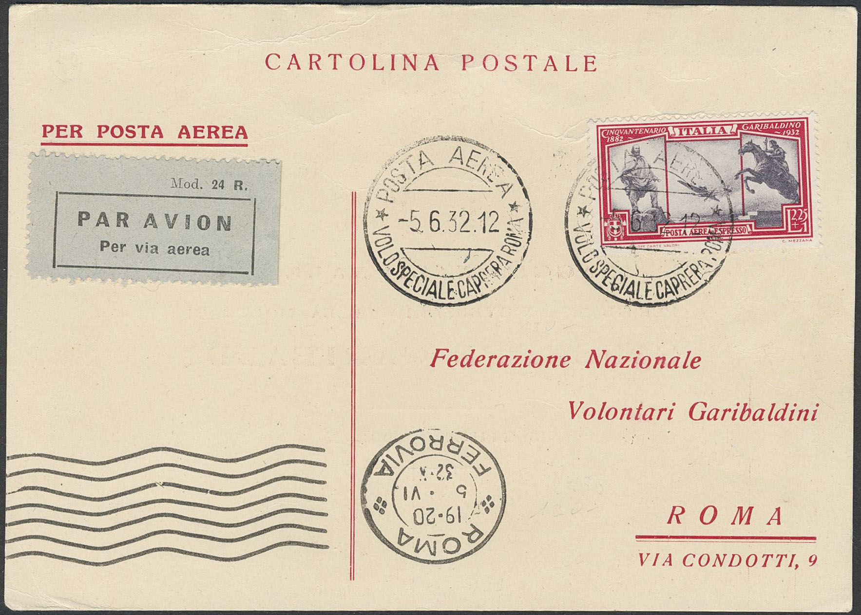 Italy. Michel 406 cover, Special "Cartolina Postale" sent to Rome franked with 2.25 + 1 L Garibaldi Airmail Express tied by VOLOSPECIALE CAPREREA ROMA 5.6.32 cds.