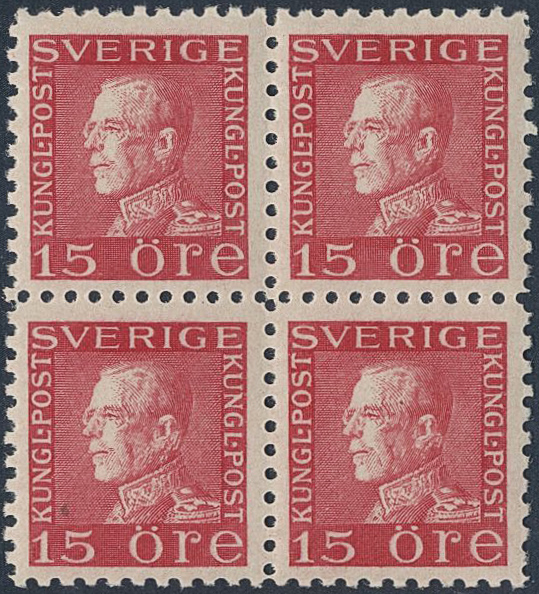 Sweden. Facit 177Cb ★★, 15 öre dull red type II perf 9¾ on 4 sides on pale rose toned thick paper (A1). Superb centered block-of-four. SEK 4000++