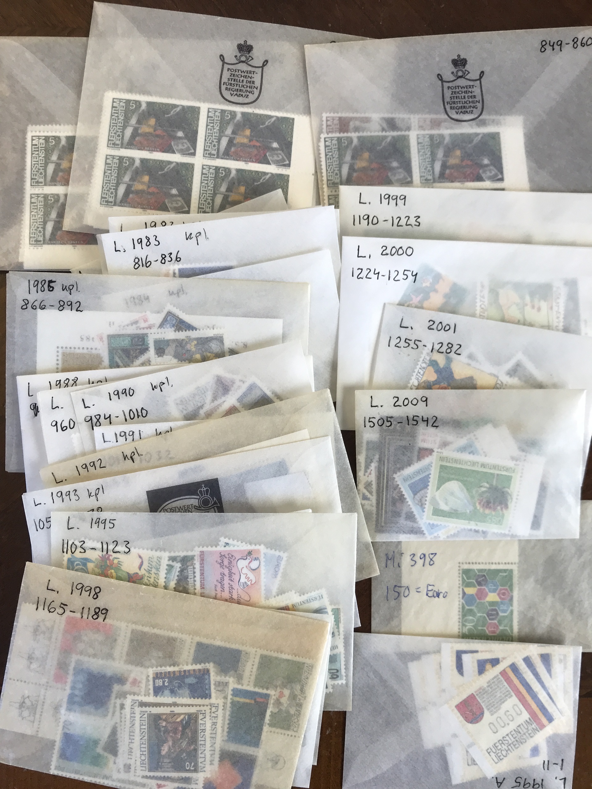 Liechtenstein. ★★. Lot 1979-2001+ 2009 in envelopes. Mi ca 1325 Euro. Also some blocks-of-four, Mi398 and some Automat labels.