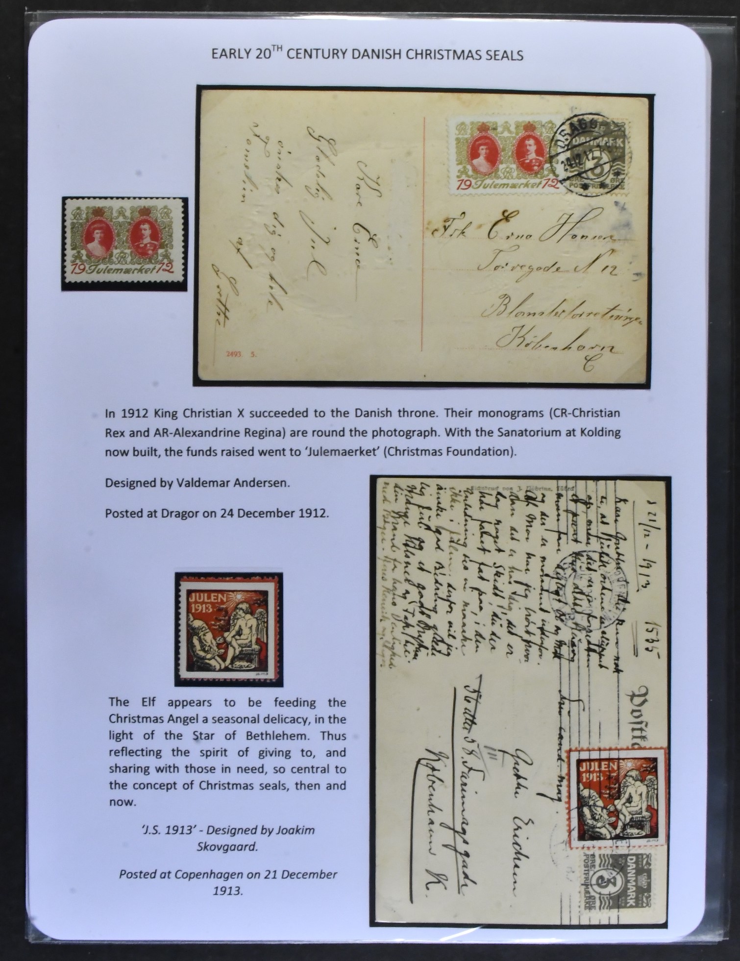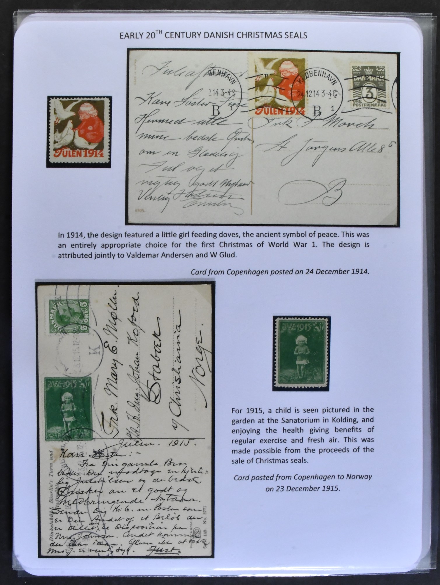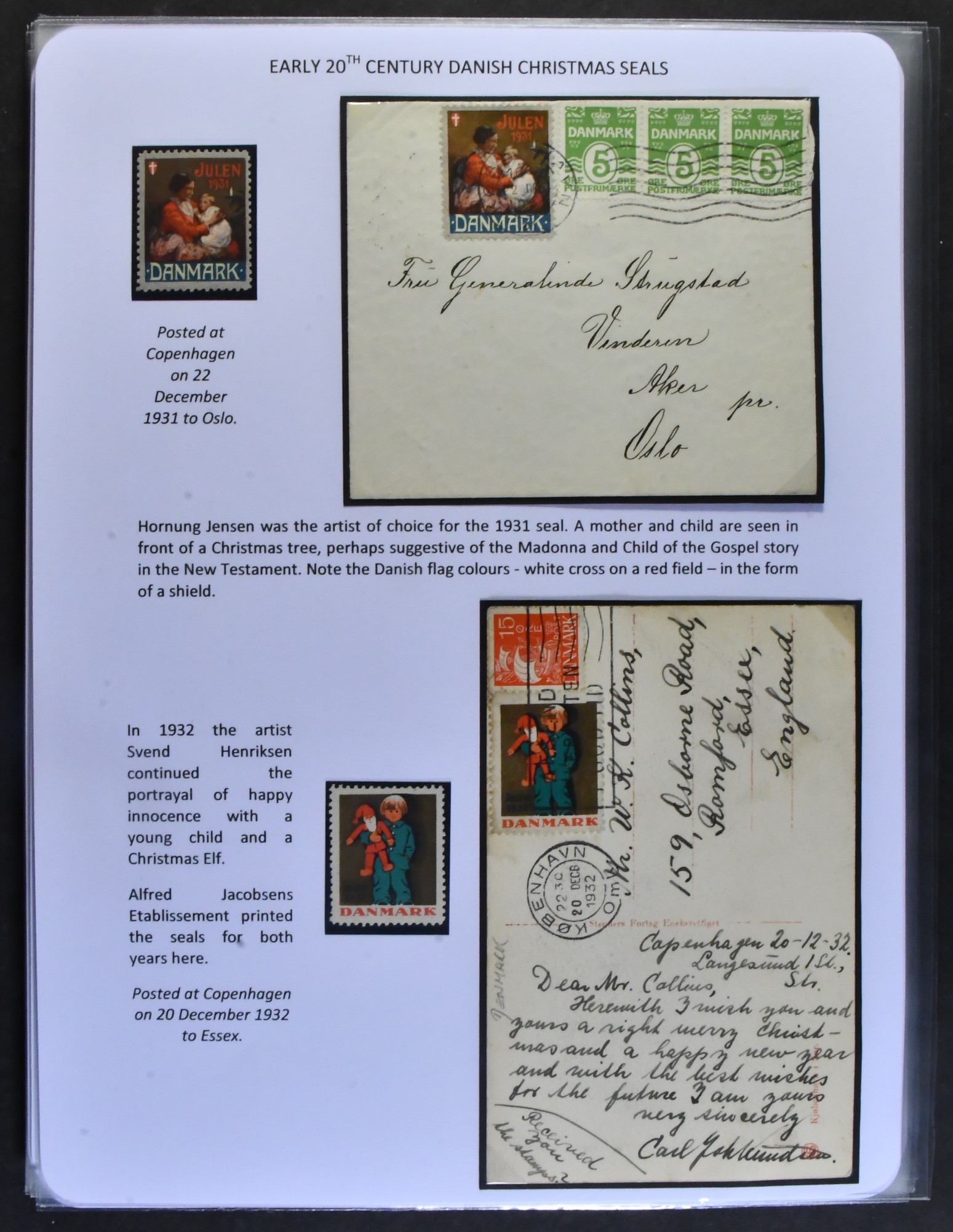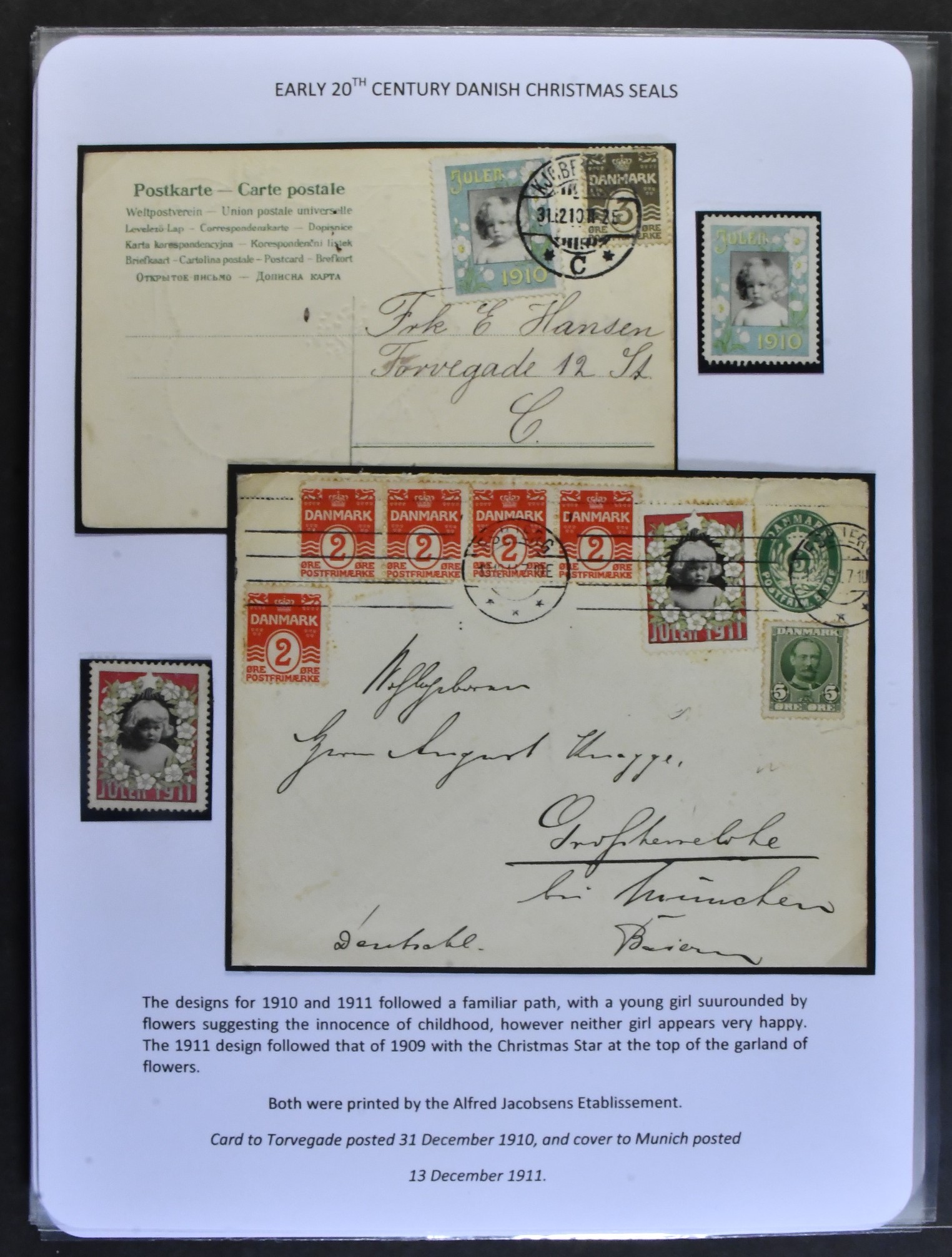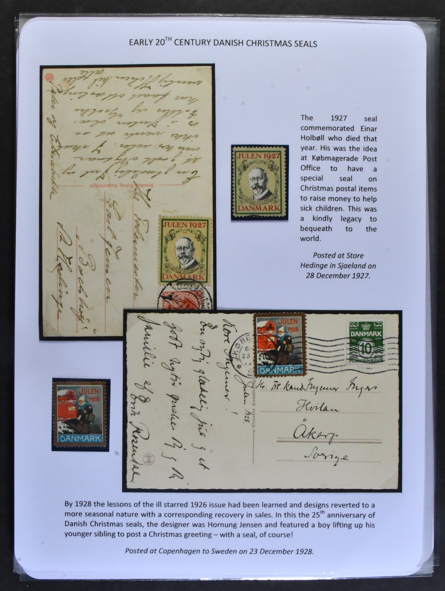 Denmark. Seals. A good exhibition display of Christmas seals, put together by a serious collector beginning with 1904 perf. and imperf. M&U, followed by virtually every year represented, beginning with 1907 onwards postal history used in combination with regular definitives, it is that comprehensive, a recurring pattern through to the 1930s.