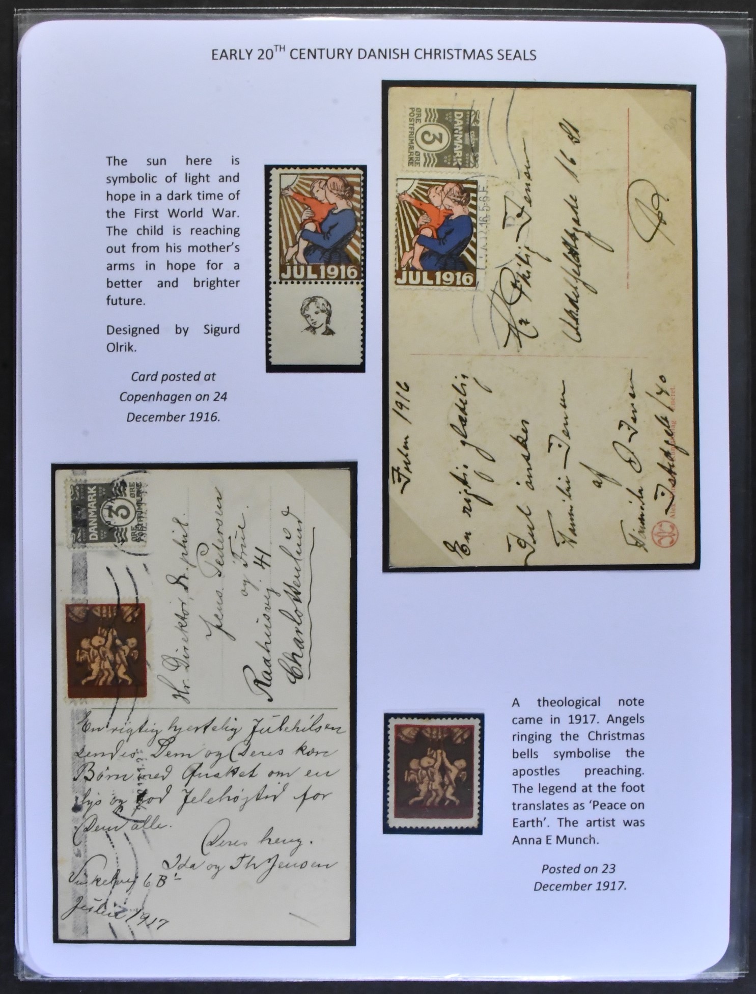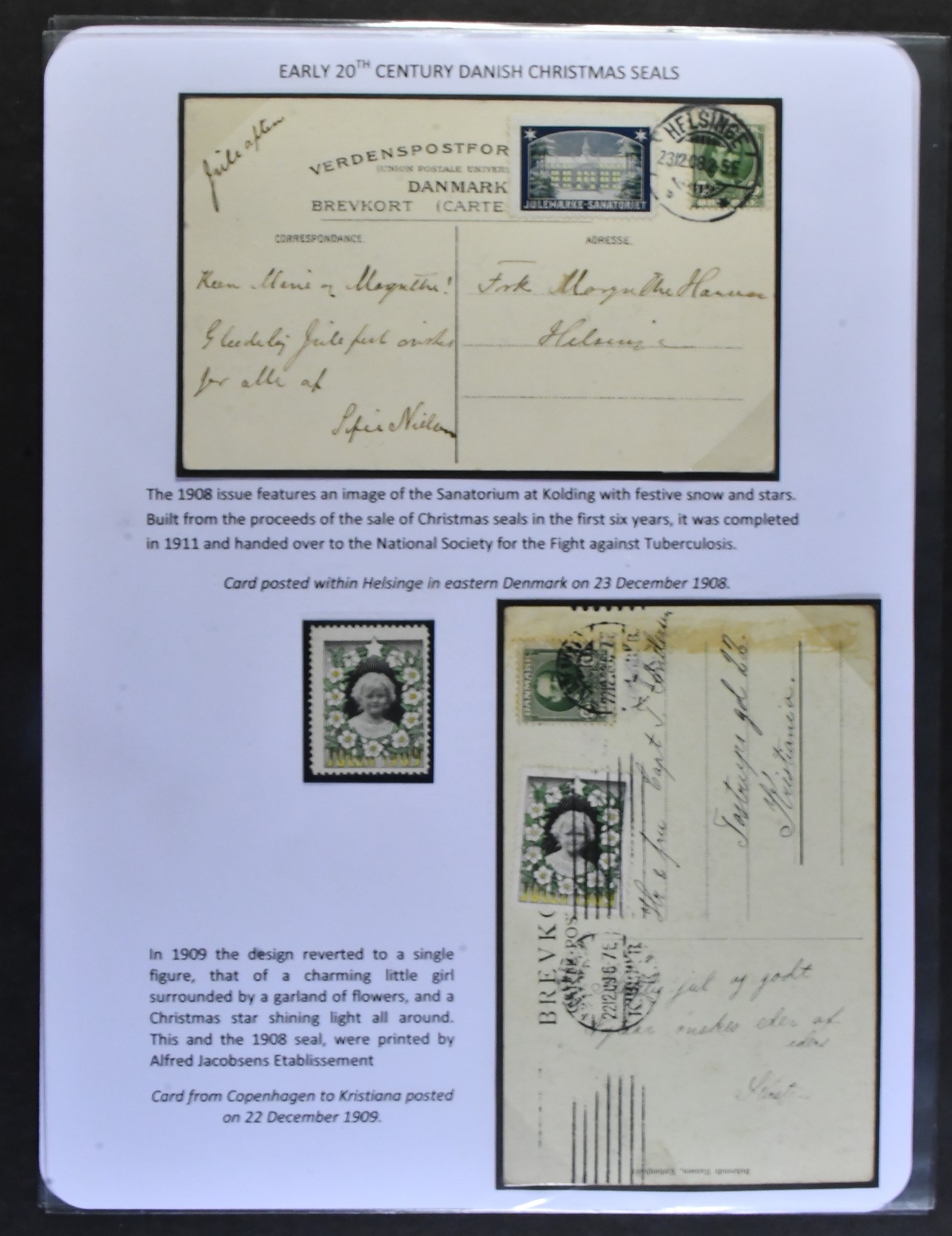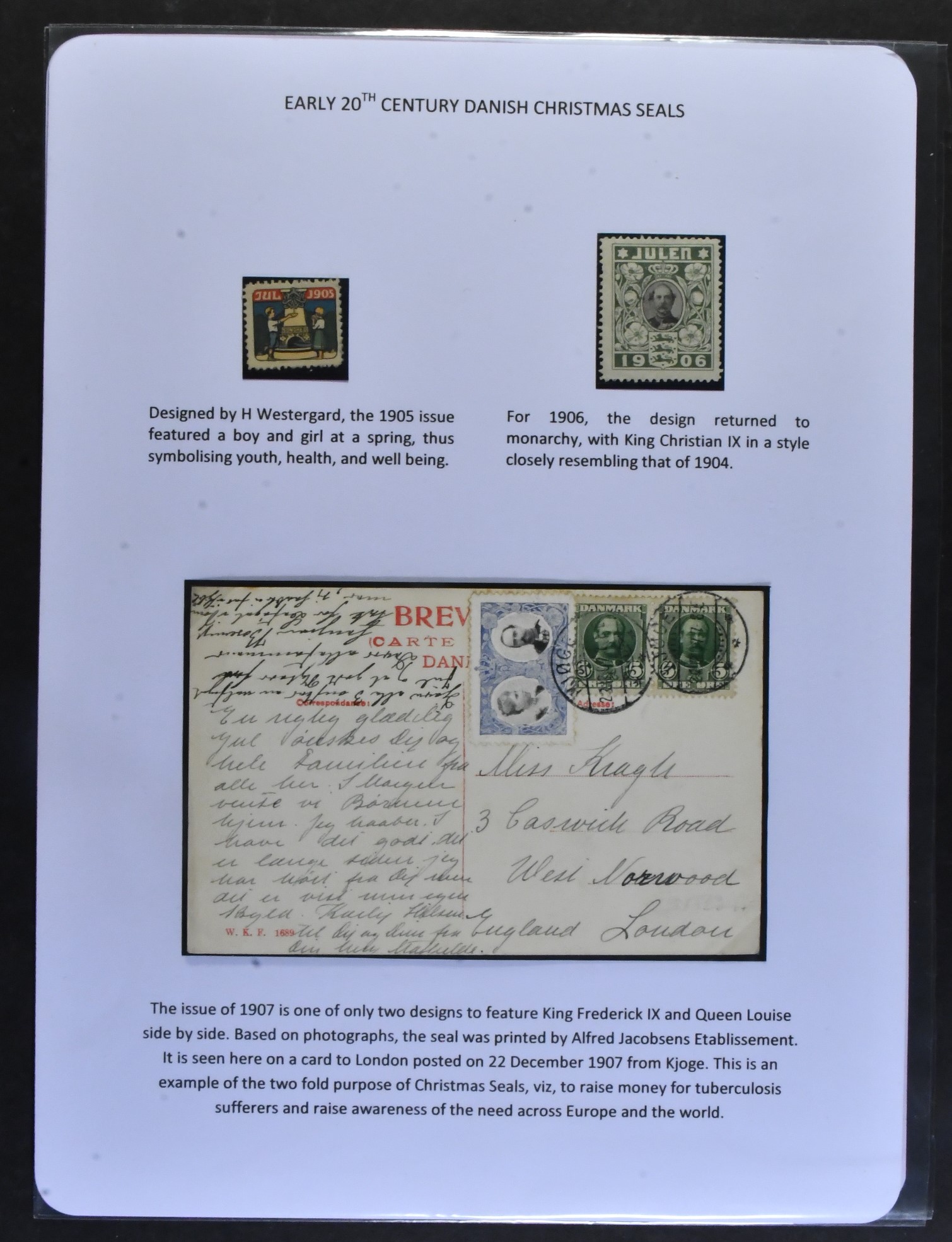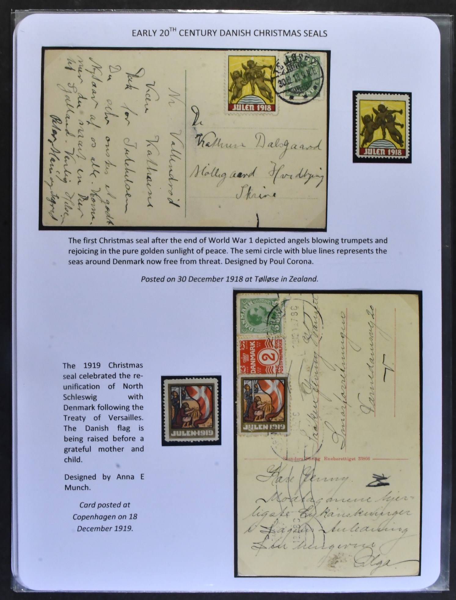 Denmark. Seals. A good exhibition display of Christmas seals, put together by a serious collector beginning with 1904 perf. and imperf. M&U, followed by virtually every year represented, beginning with 1907 onwards postal history used in combination with regular definitives, it is that comprehensive, a recurring pattern through to the 1930s.
