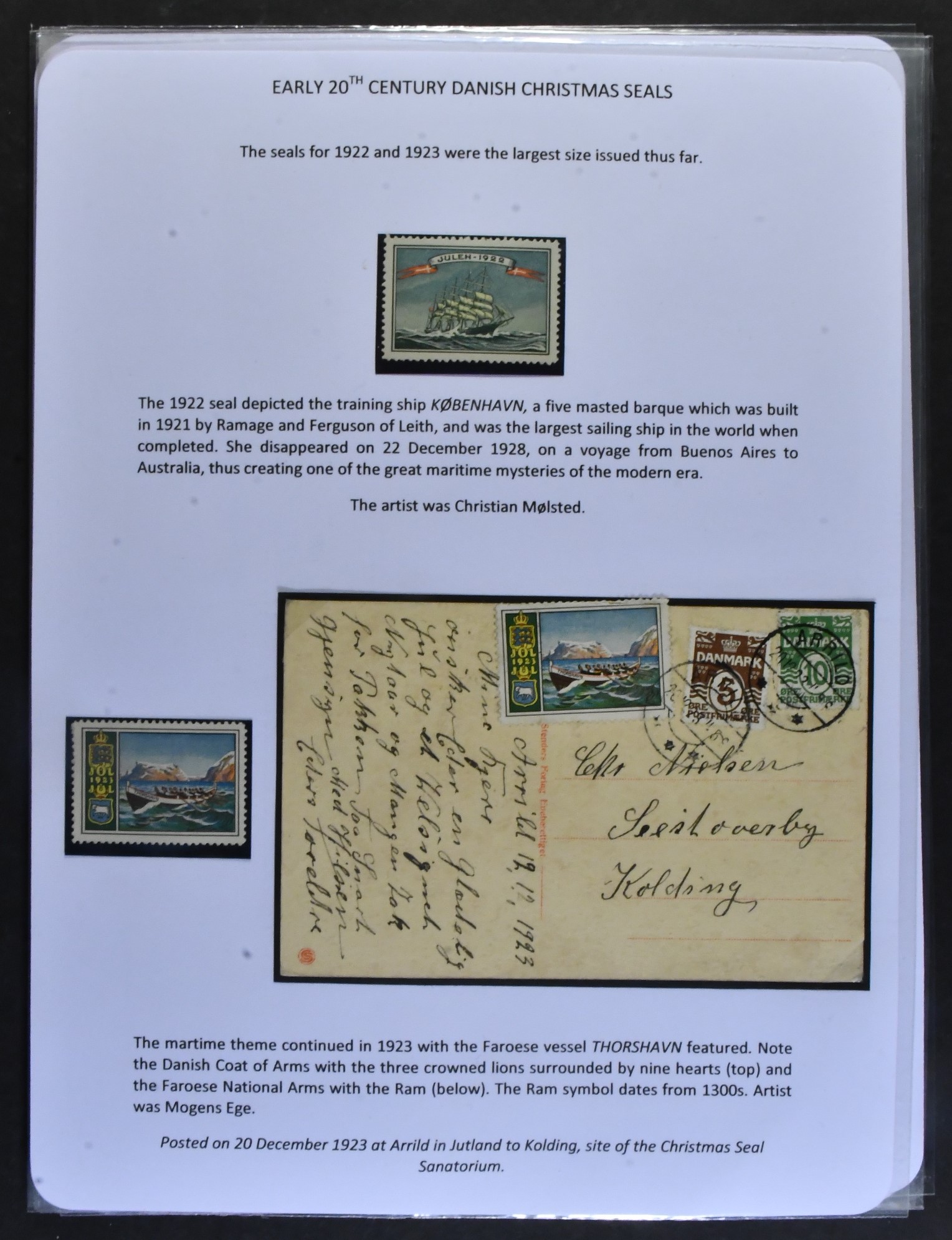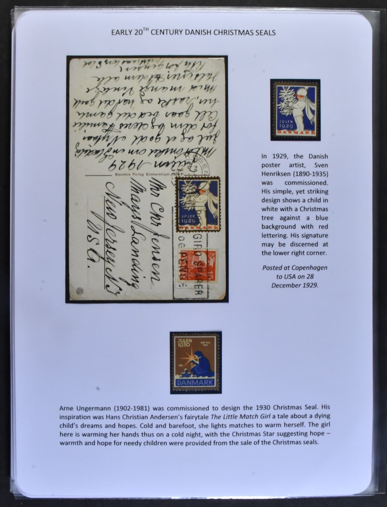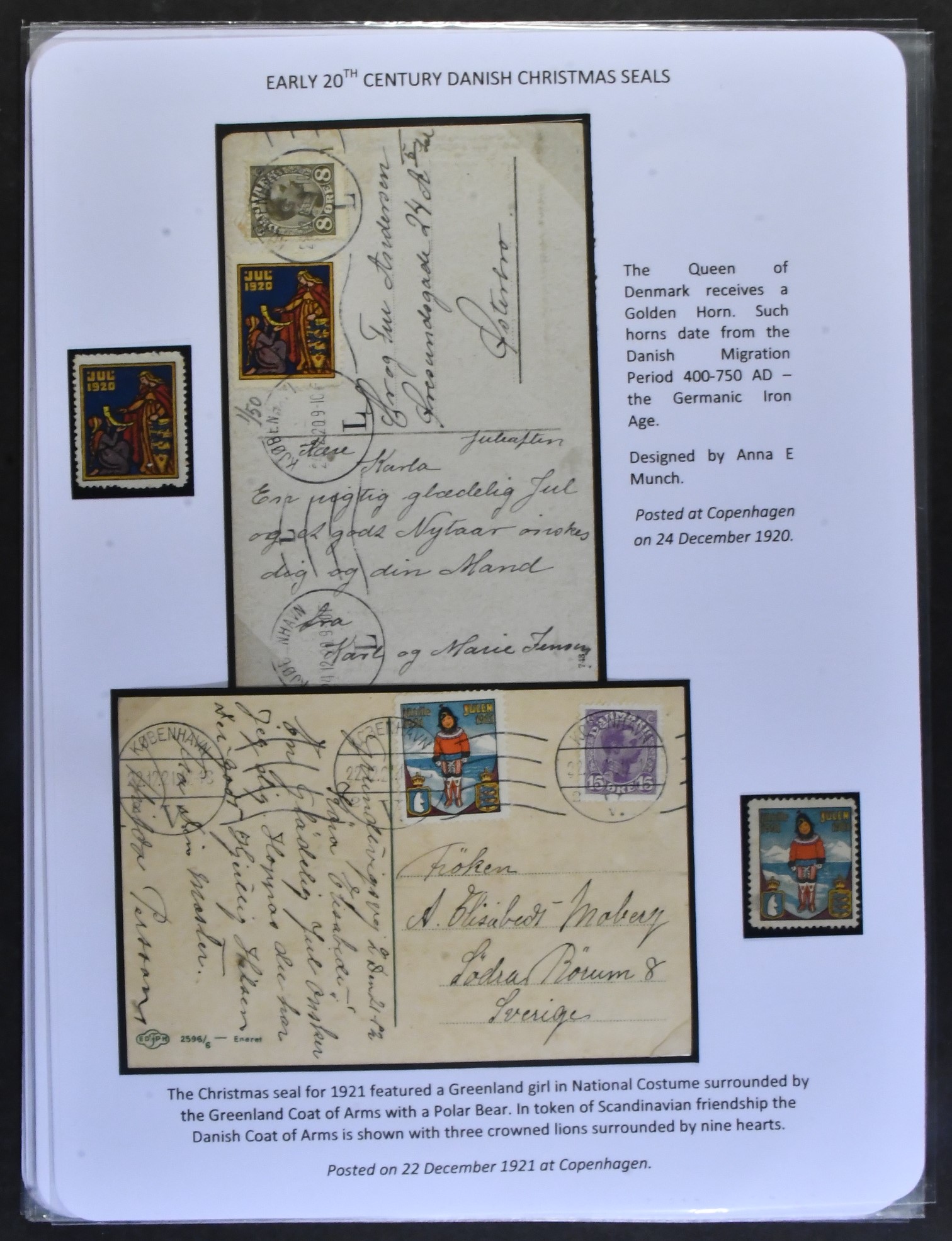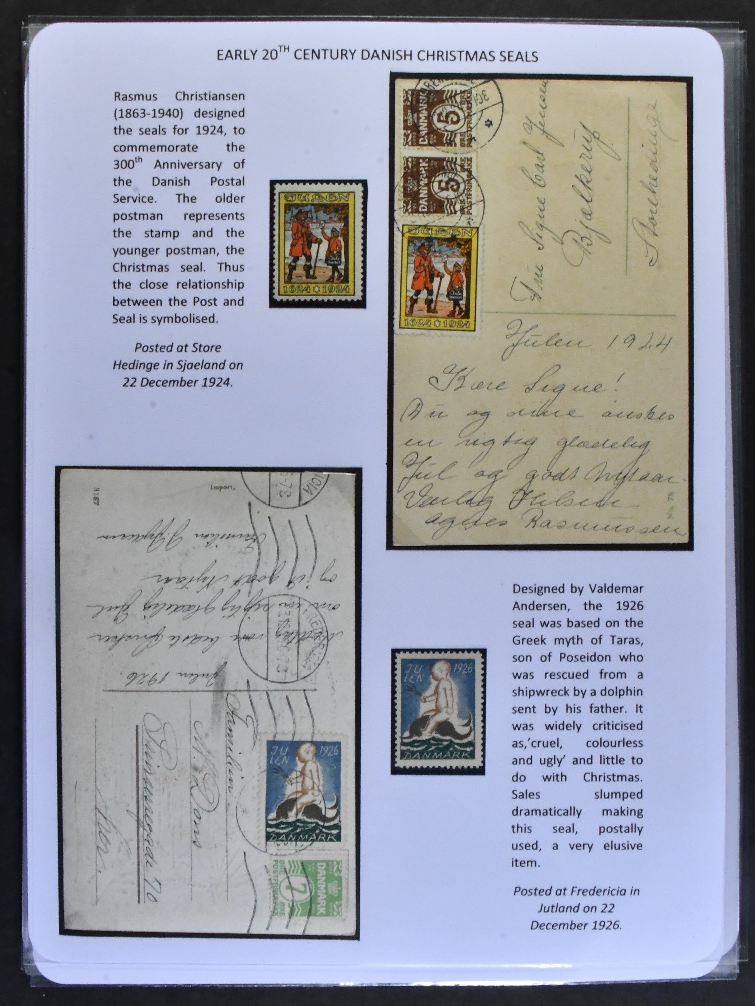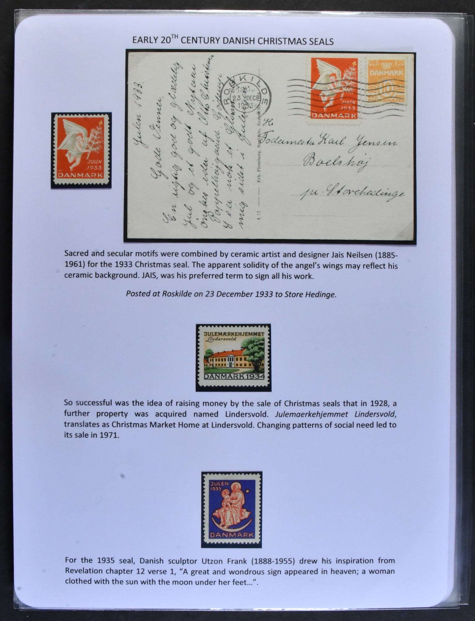 Denmark. Seals. A good exhibition display of Christmas seals, put together by a serious collector beginning with 1904 perf. and imperf. M&U, followed by virtually every year represented, beginning with 1907 onwards postal history used in combination with regular definitives, it is that comprehensive, a recurring pattern through to the 1930s.