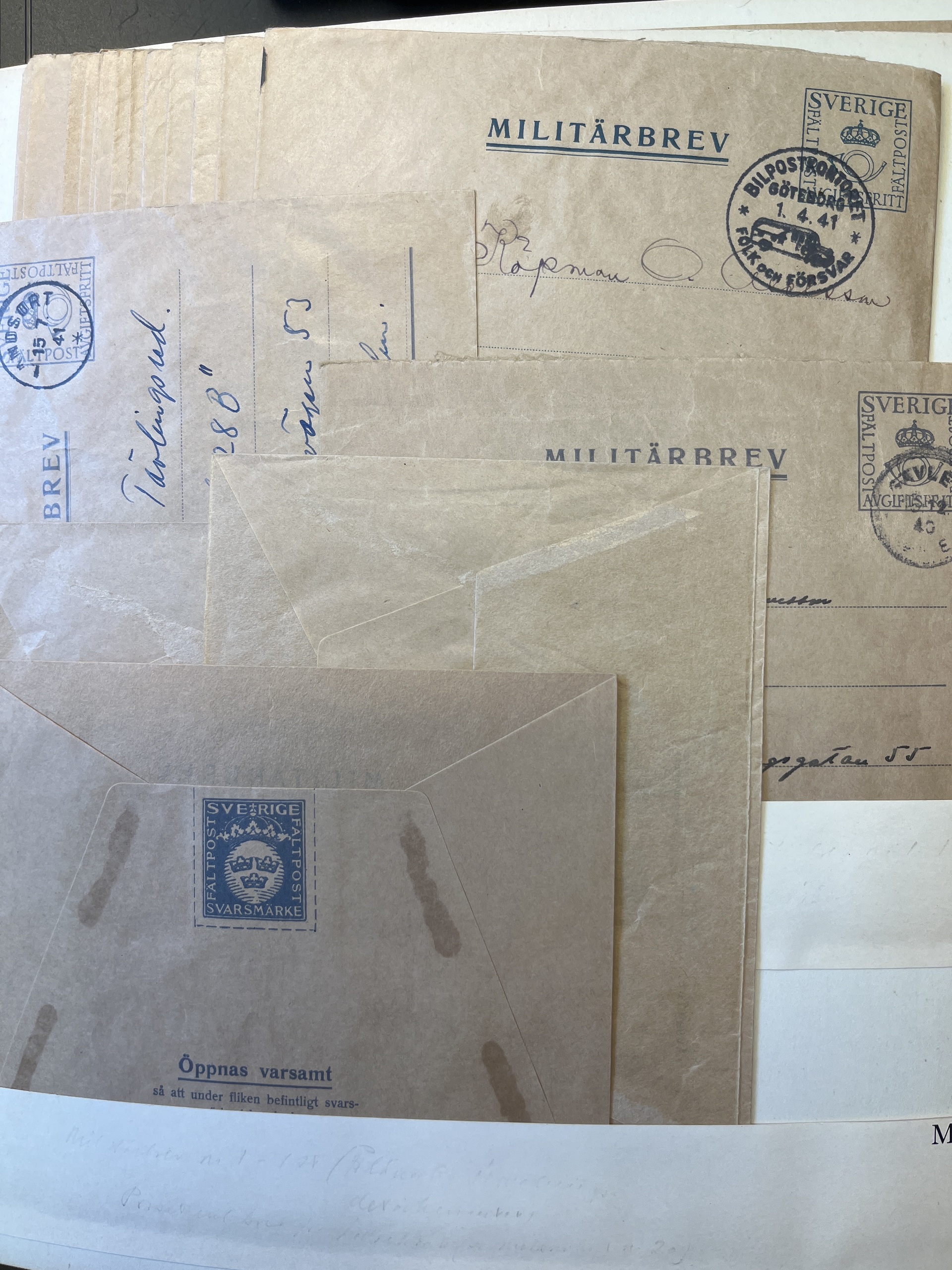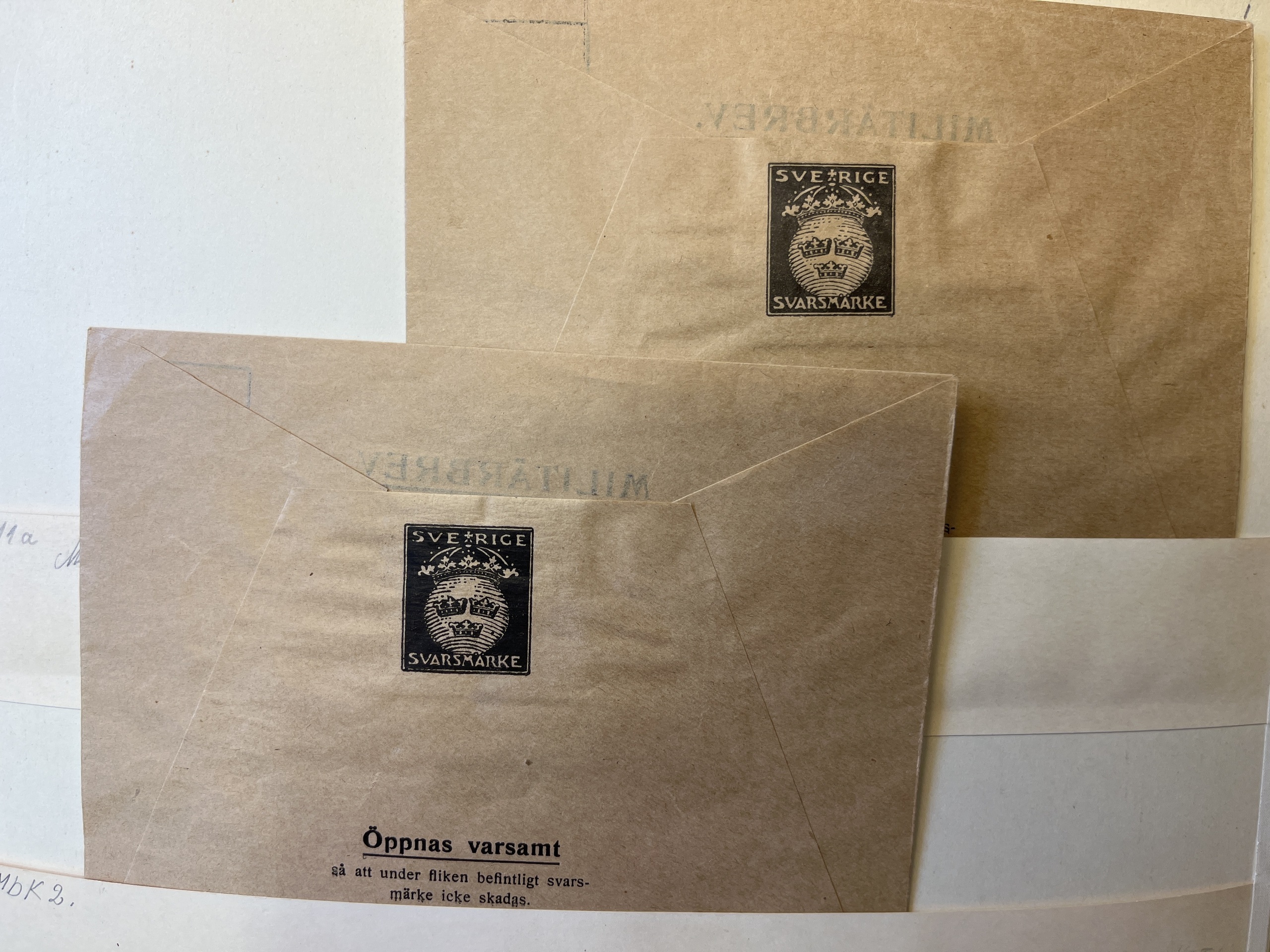 Sweden. Military covers, collection/accumulation in two albums. Military covers and military postcards, used and unused. The collection starts with two unused M1 covers.