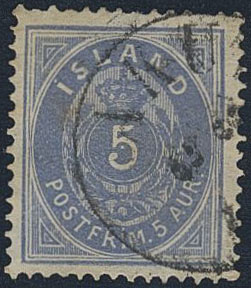 Iceland. Facit 9 used, 1878 Aur values 5 aur blue, perf 14 × 13½. Uneven perf. SEK 8000