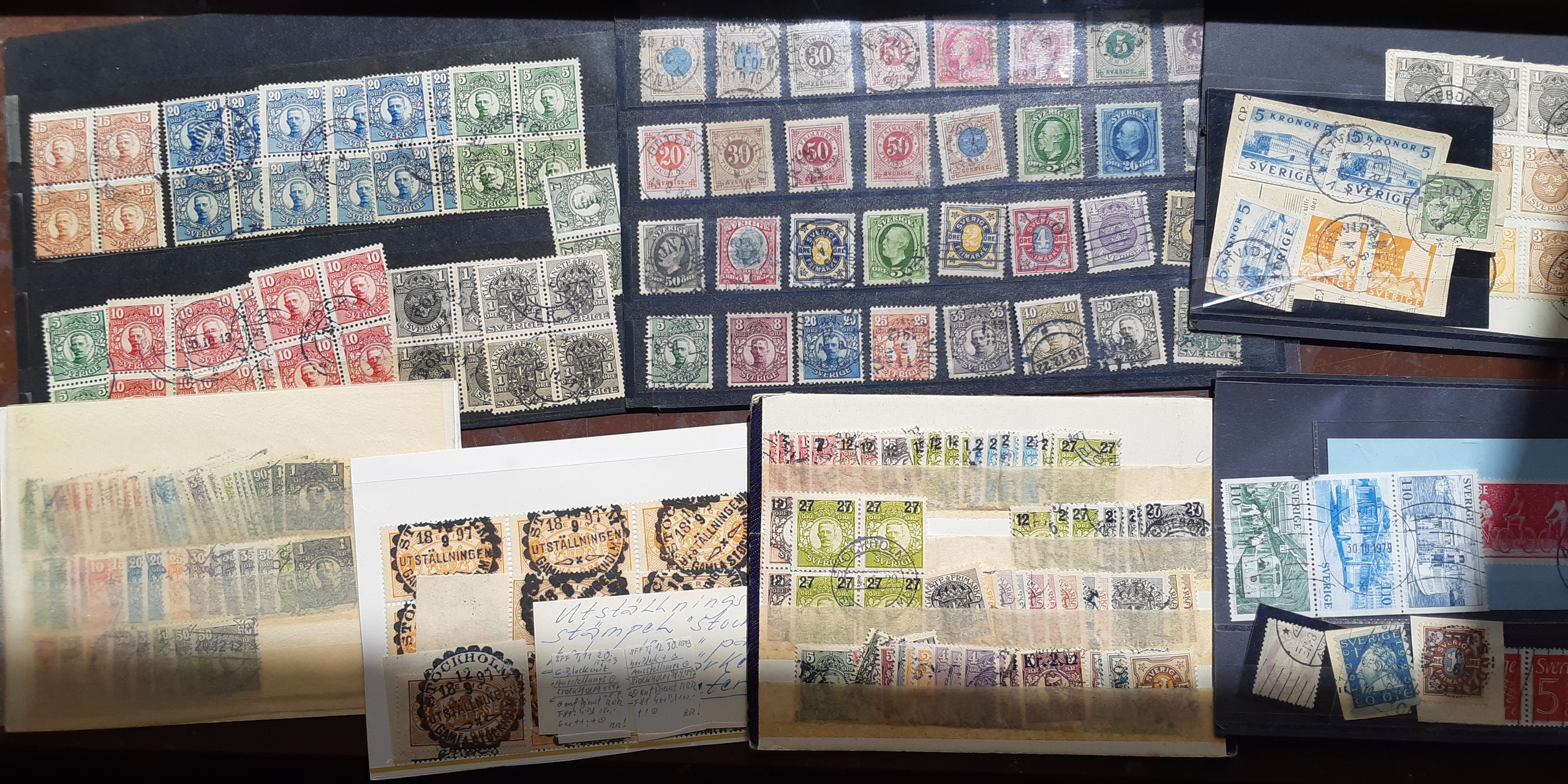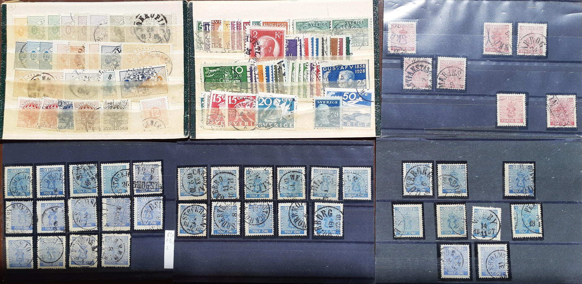 Sweden. Lot used mostly 1850s–1930s on stock cards. Duplicates incl. better e.g. F12 (×7), 27, 209, 233a (×2), officials, cancellations. blocks of four, etc. Somewhat mixed quality. (300)