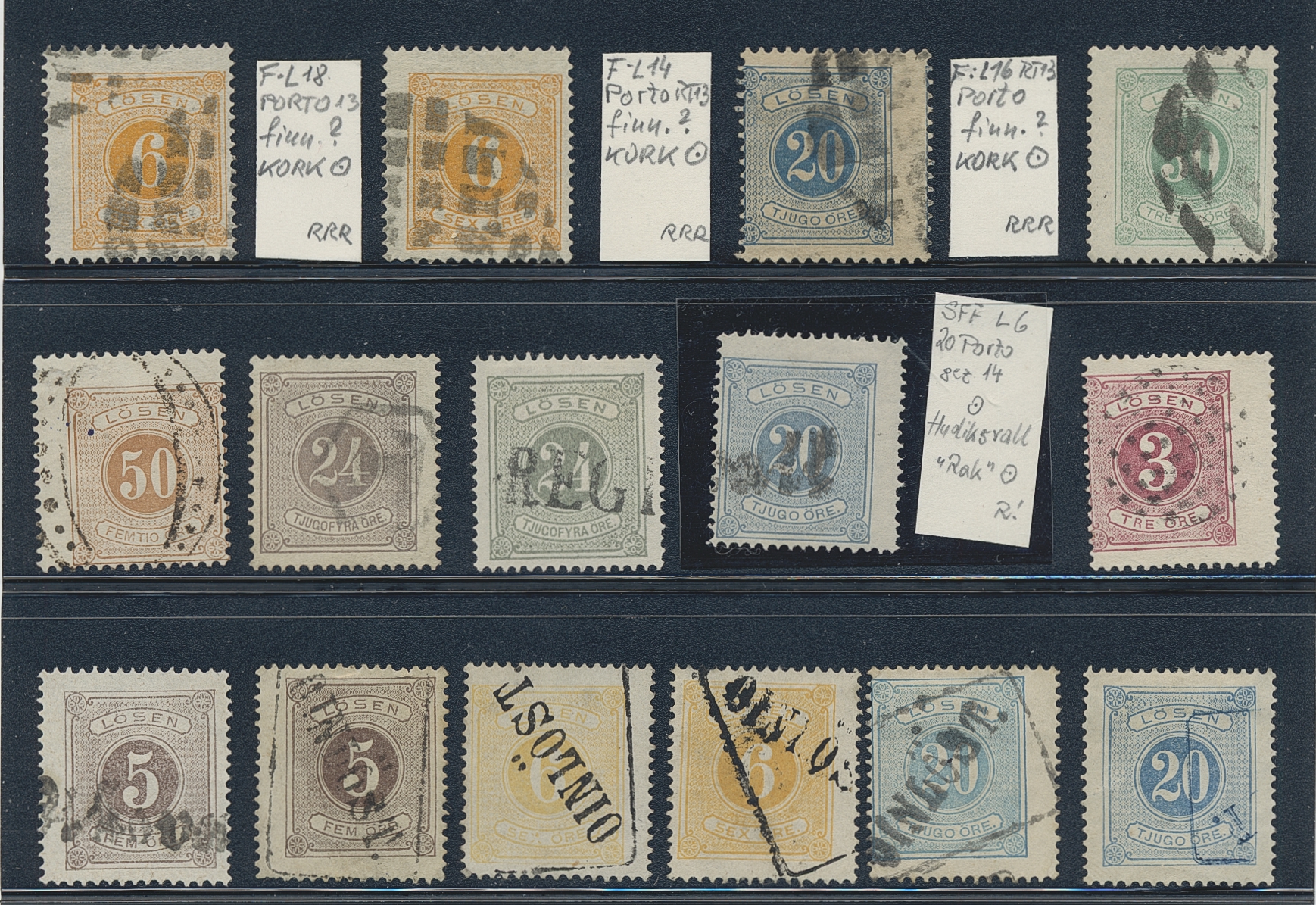 Sweden. Lot used POSTAGE DUES on stock card. Figure postmarks and other odd cancellations. Somewhat mixed quality. (15)