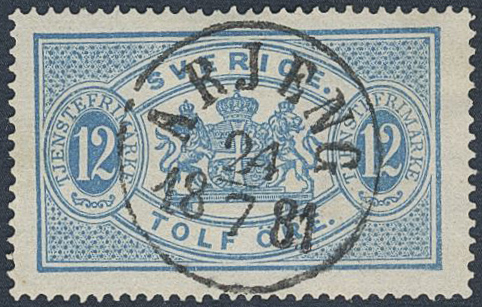 Sweden. Official Facit Tj5 used, 12 öre blue, perf. 14. EXCELLENT cancellation ÅRJENG 24.7.1881.