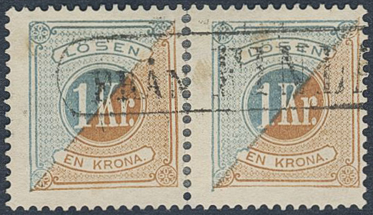 Sweden. Postage due Facit L20 used, 1 Kr blue/brown, perf 13 in recounstructed pair. Cancelled with FRÅN FINLAND. Very scarce on Swedish stamps.