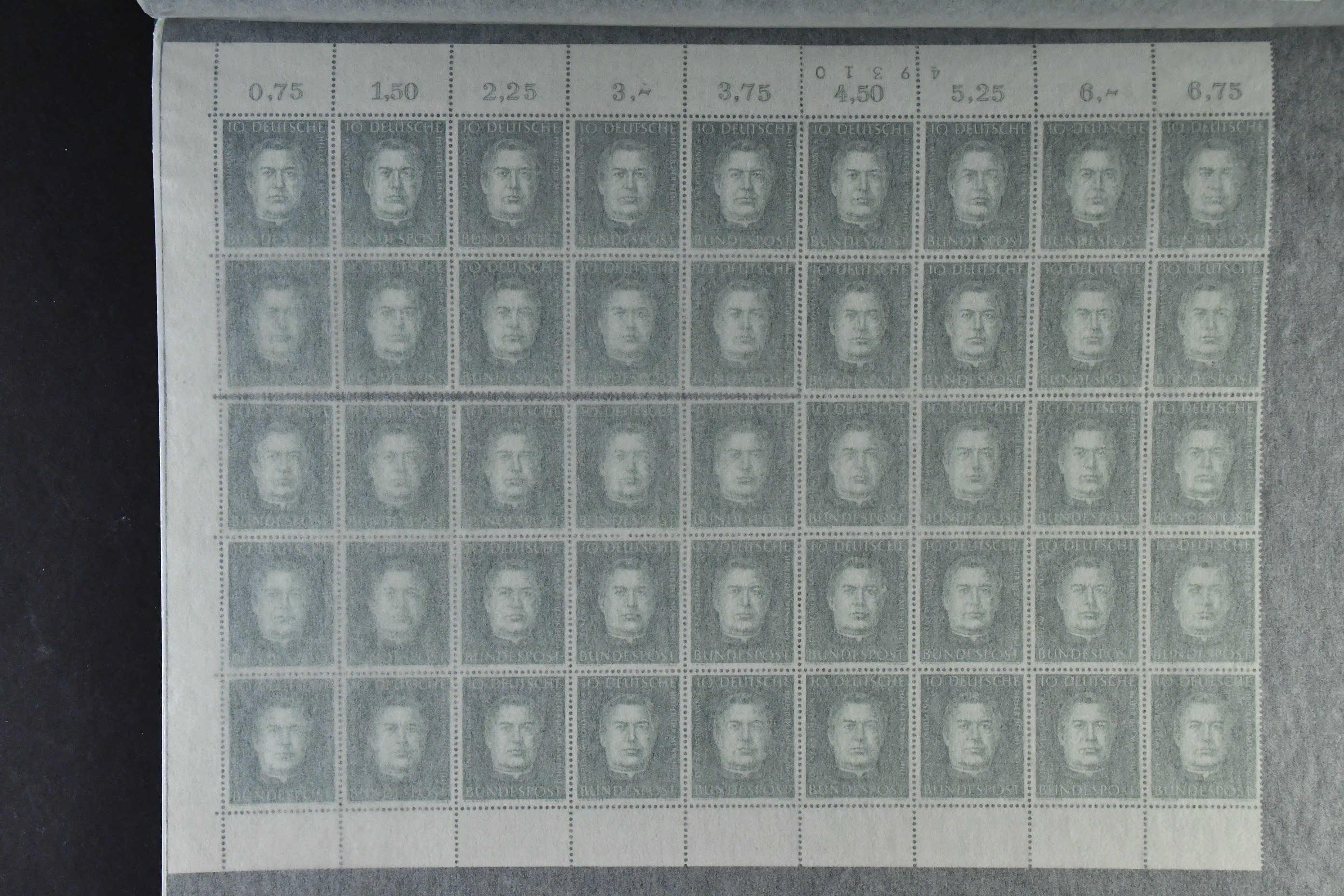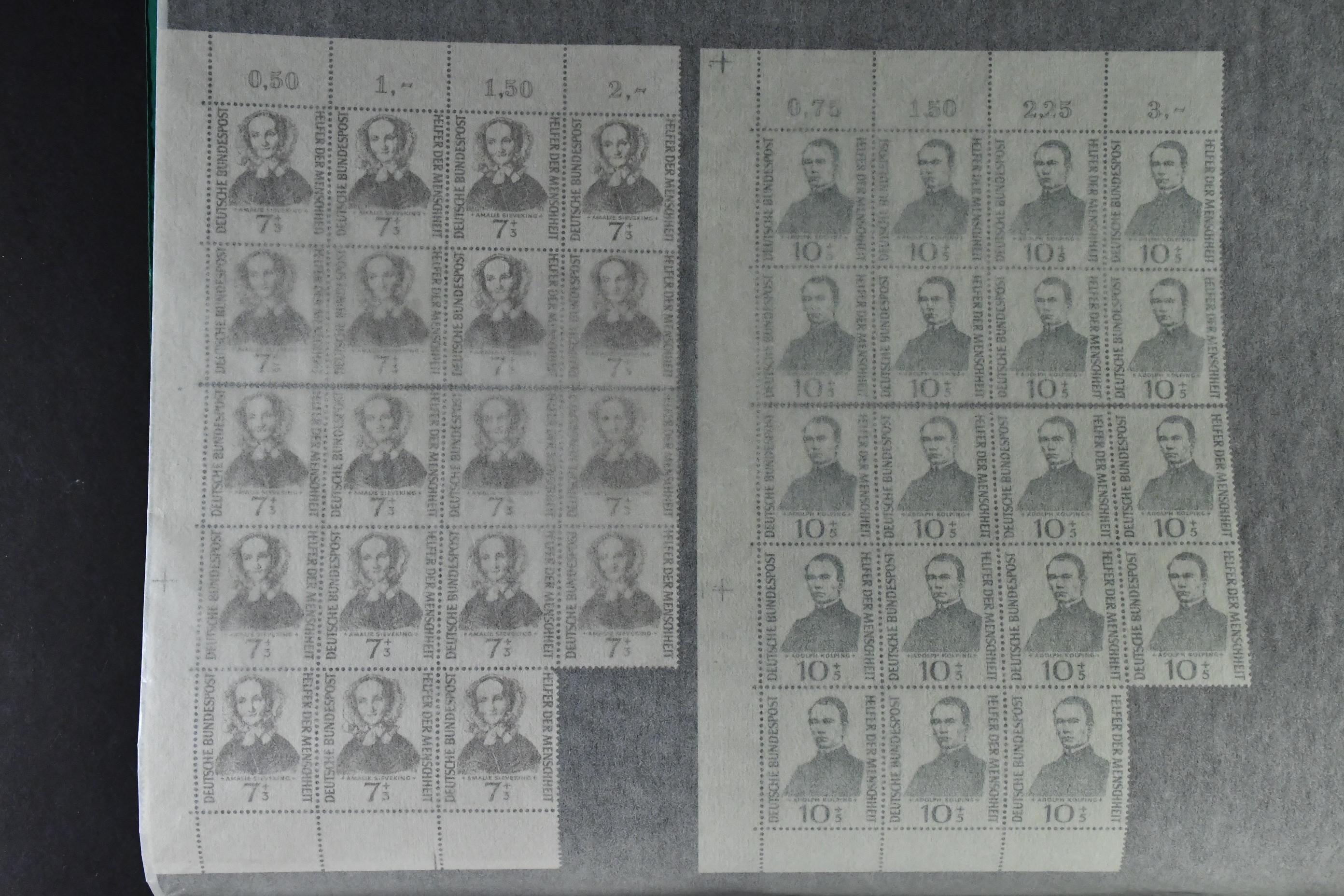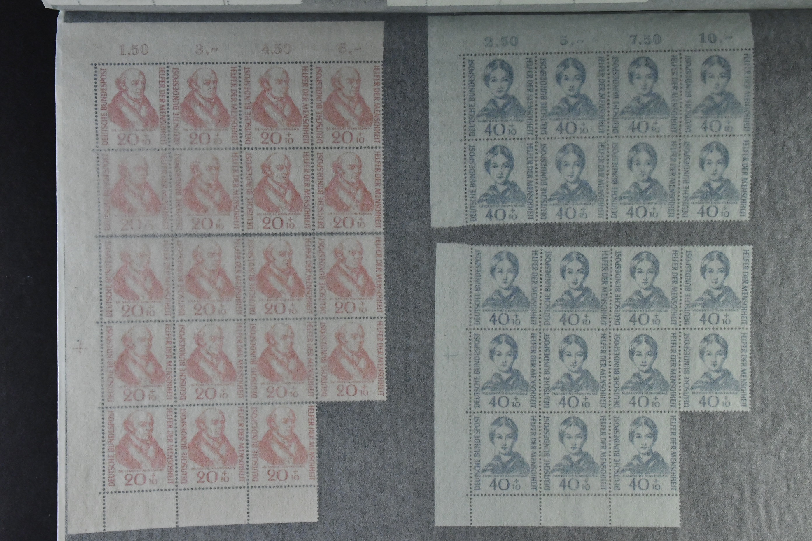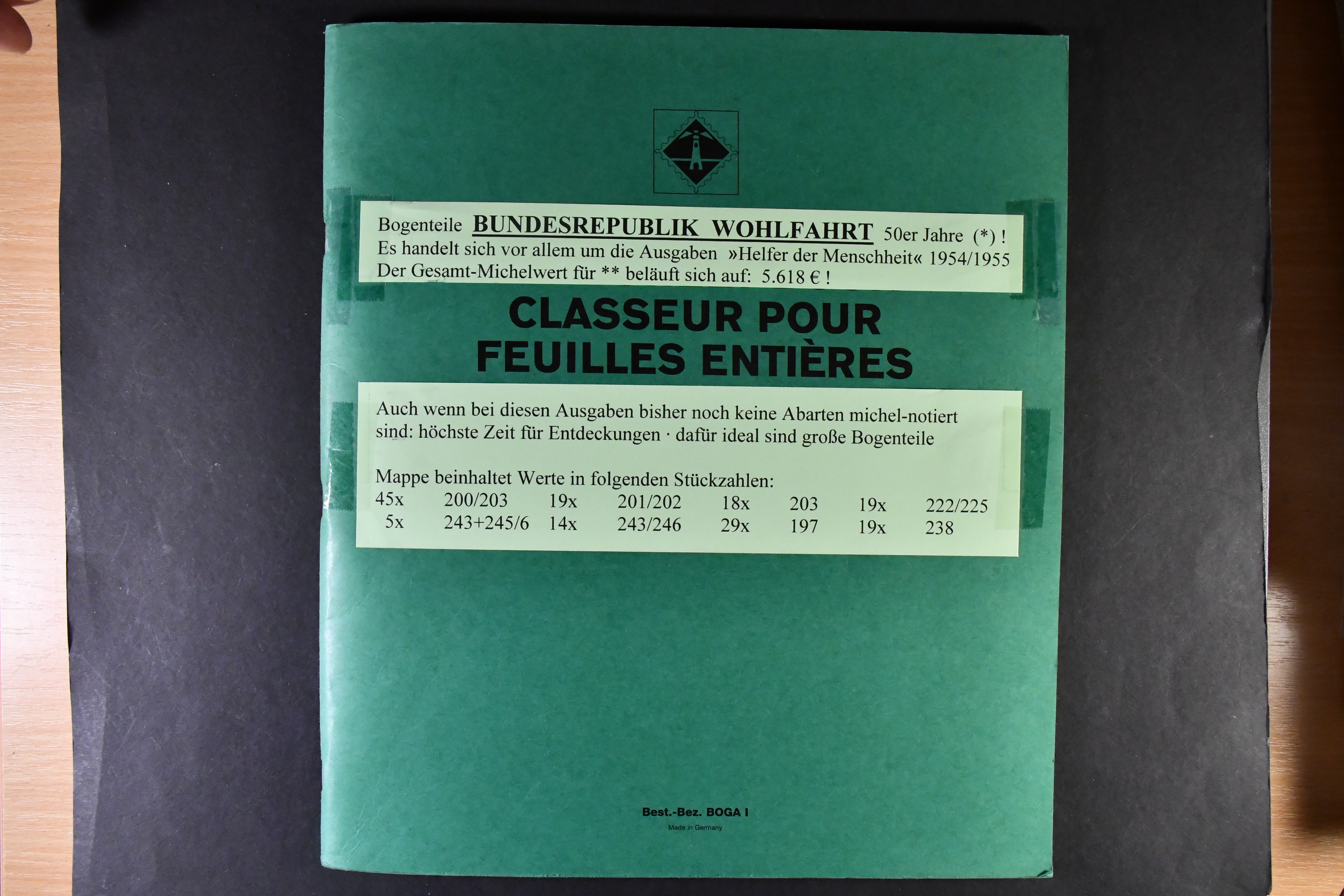 Germany, GFR (BRD). Lot (★) 1950s in sheet folder. SHEET PARTS, mainly from the "Valuable" Charity sets 1954 and 1945, the stated value for xx sets is more than EUR 5600! A small list of the content is included.