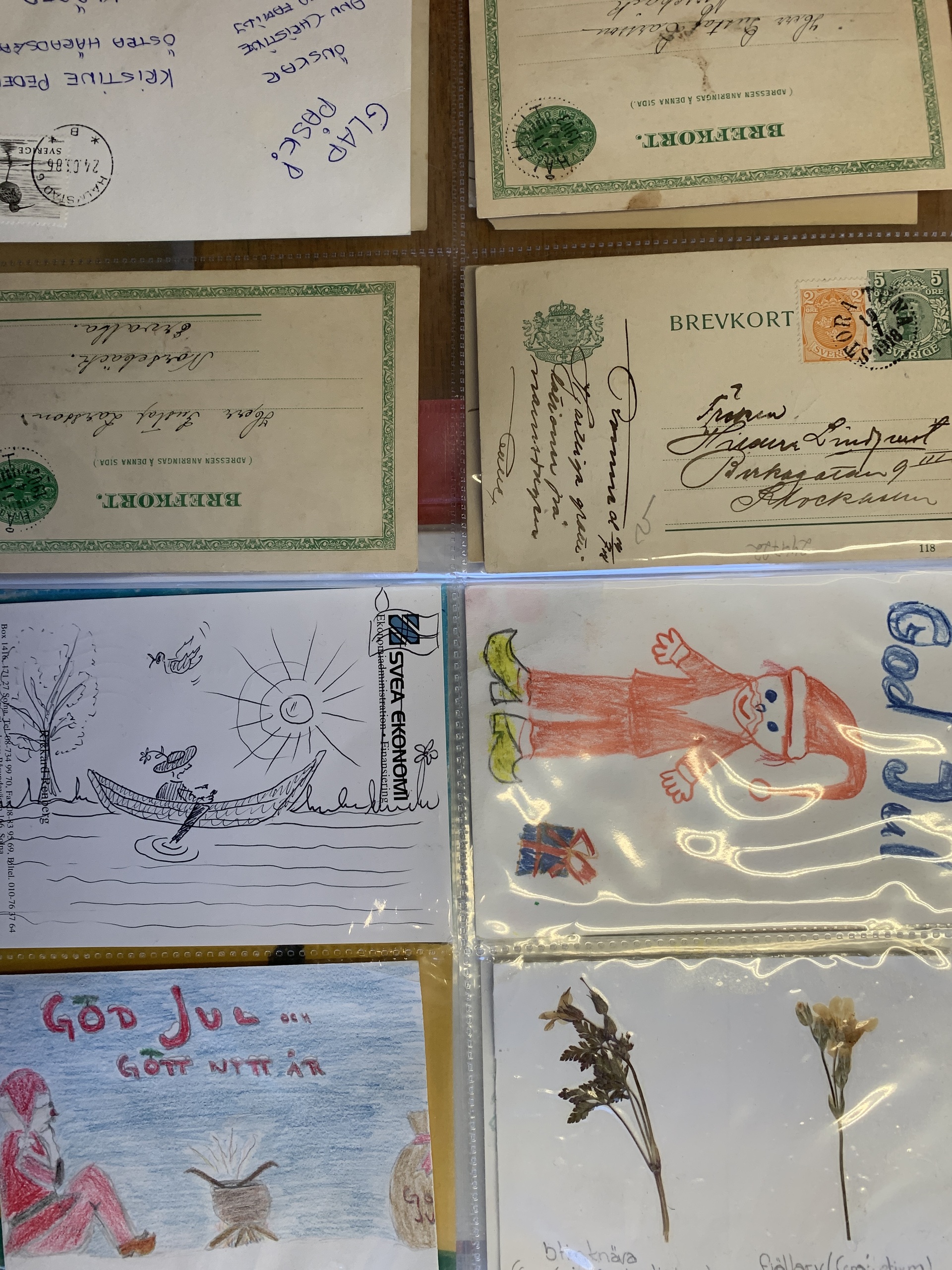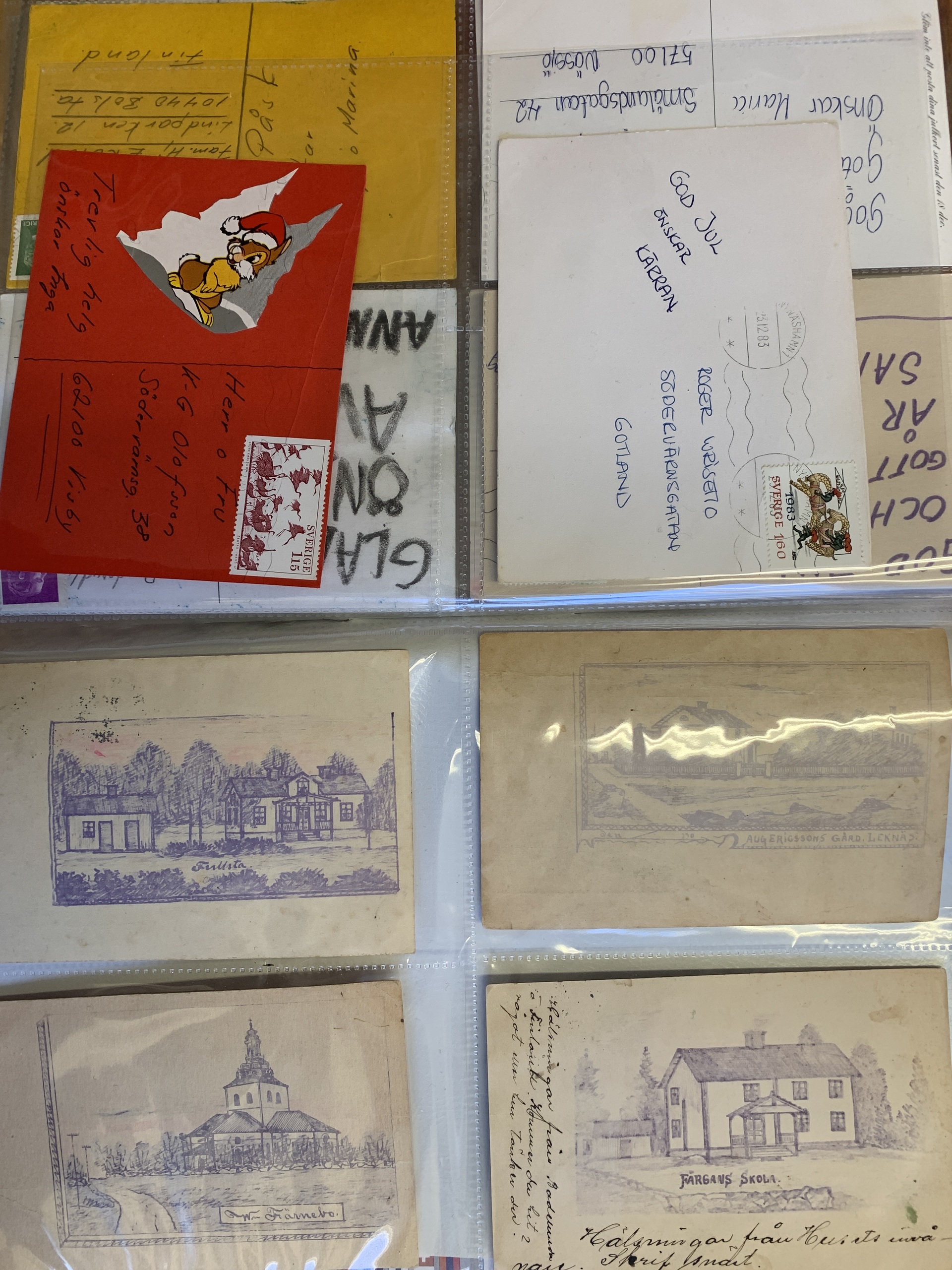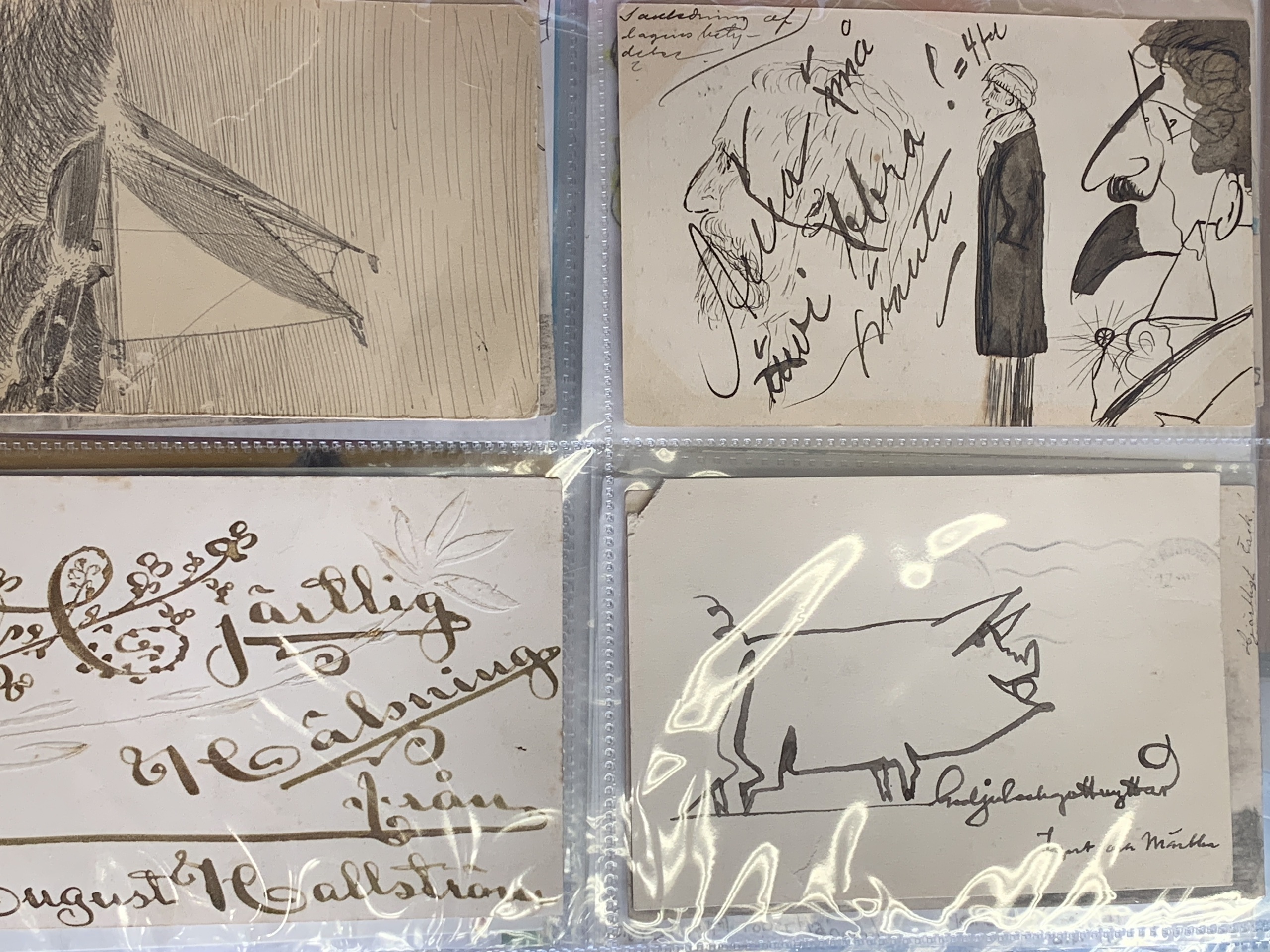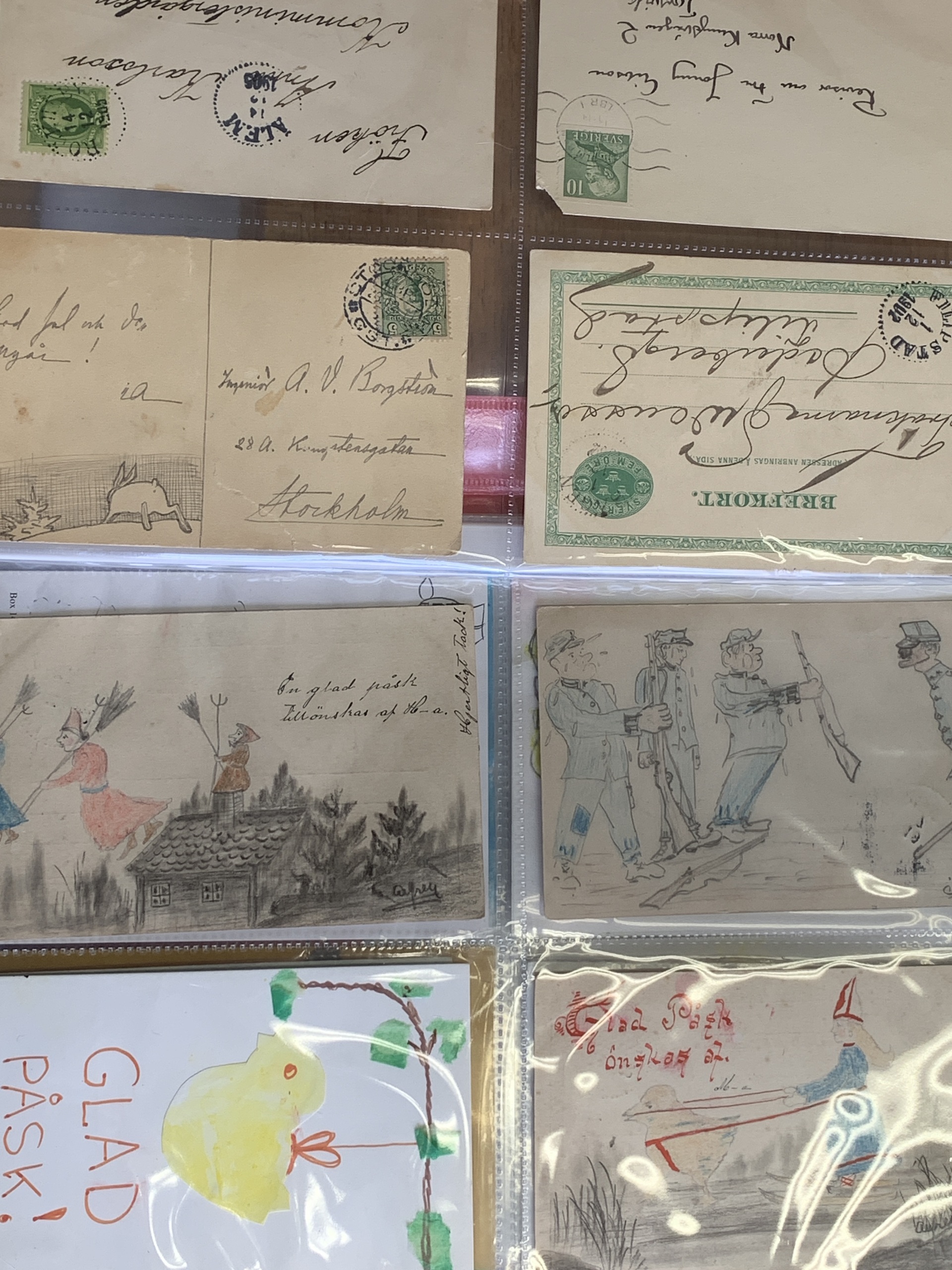 Sweden. Picture postcards. Collection "Art on mail". Self-made art on message page of older postcards etc. 18 different and four hectographies by the village painter Bror Bodingh in a folder with plastic pockets. Please see a selection of scans at www.philea.se.