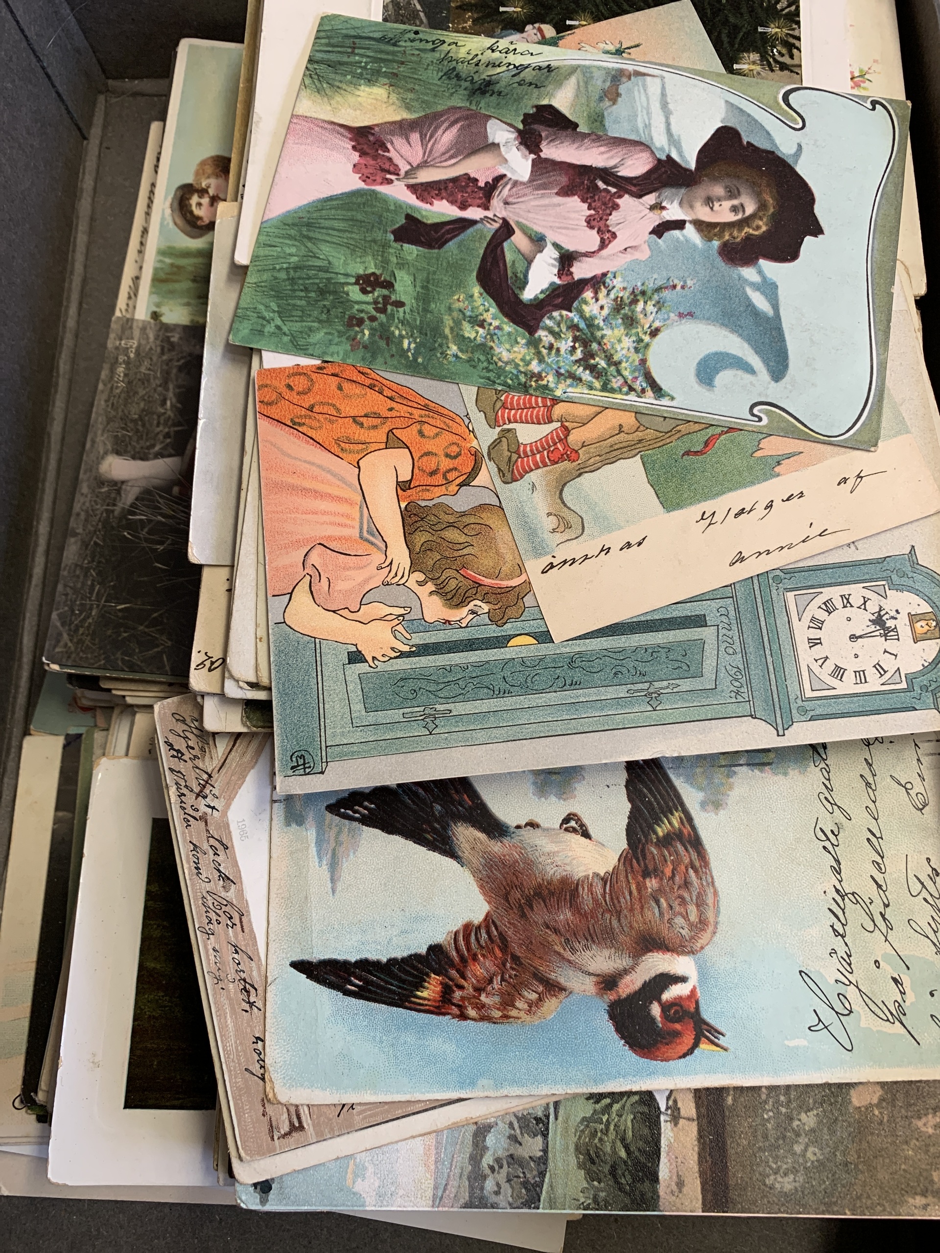 Sweden. Picture postcards. Different motifs, older, small size franked with 5 (mostly) and 10 öre Oscar, approx. 400 different in a box.