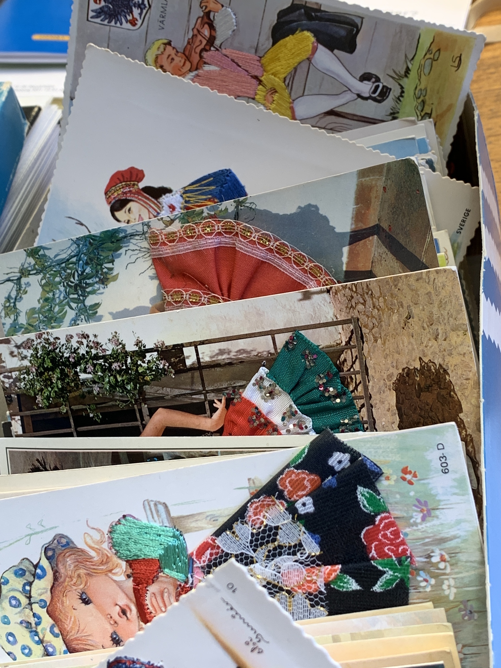 EUROPE. Picture postcards. Accumulation postcards with fabric application, several hundred different in a shoebox.