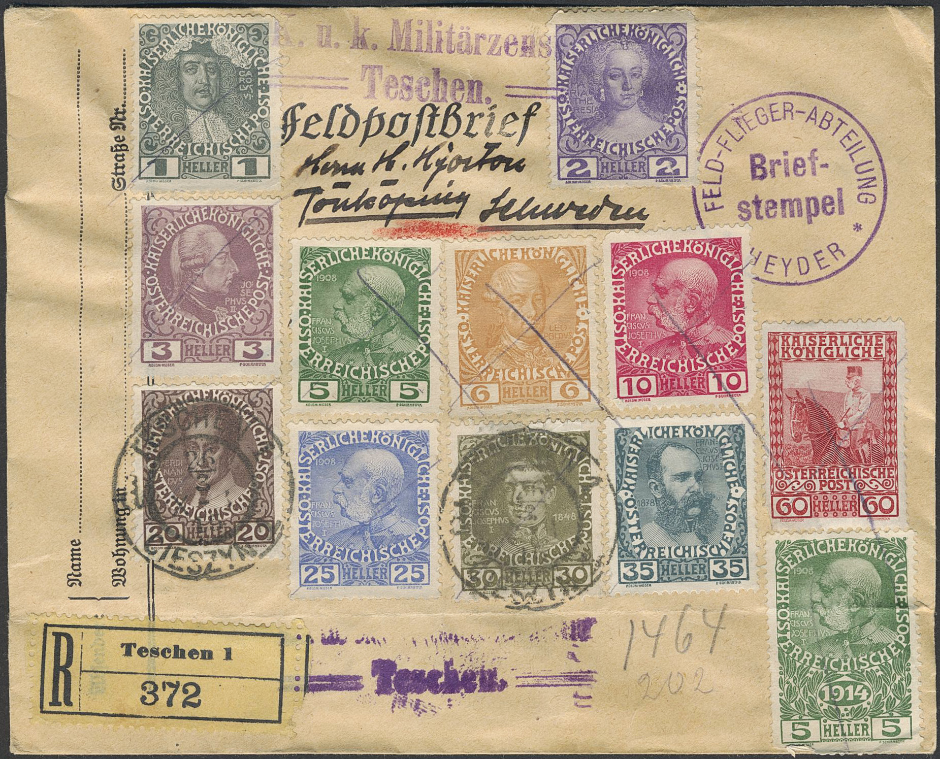 Austria. Michel 149v etc. cover, 1908 Franz Joseph 35 H laid paper and others on censored registered "Feldpostbrief" (horizontal fold) "FELD-FLIEGER-ABTEILUNG".