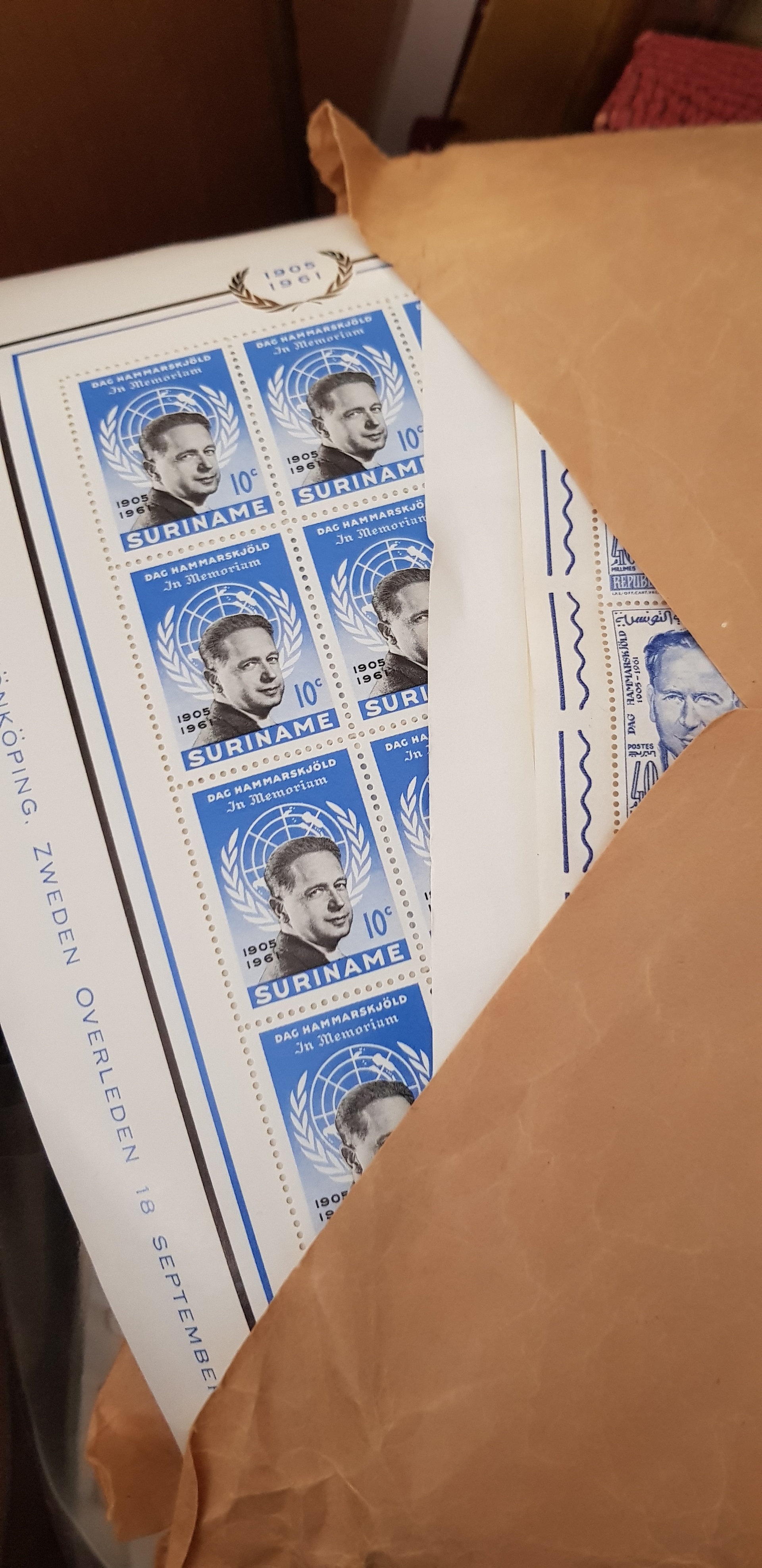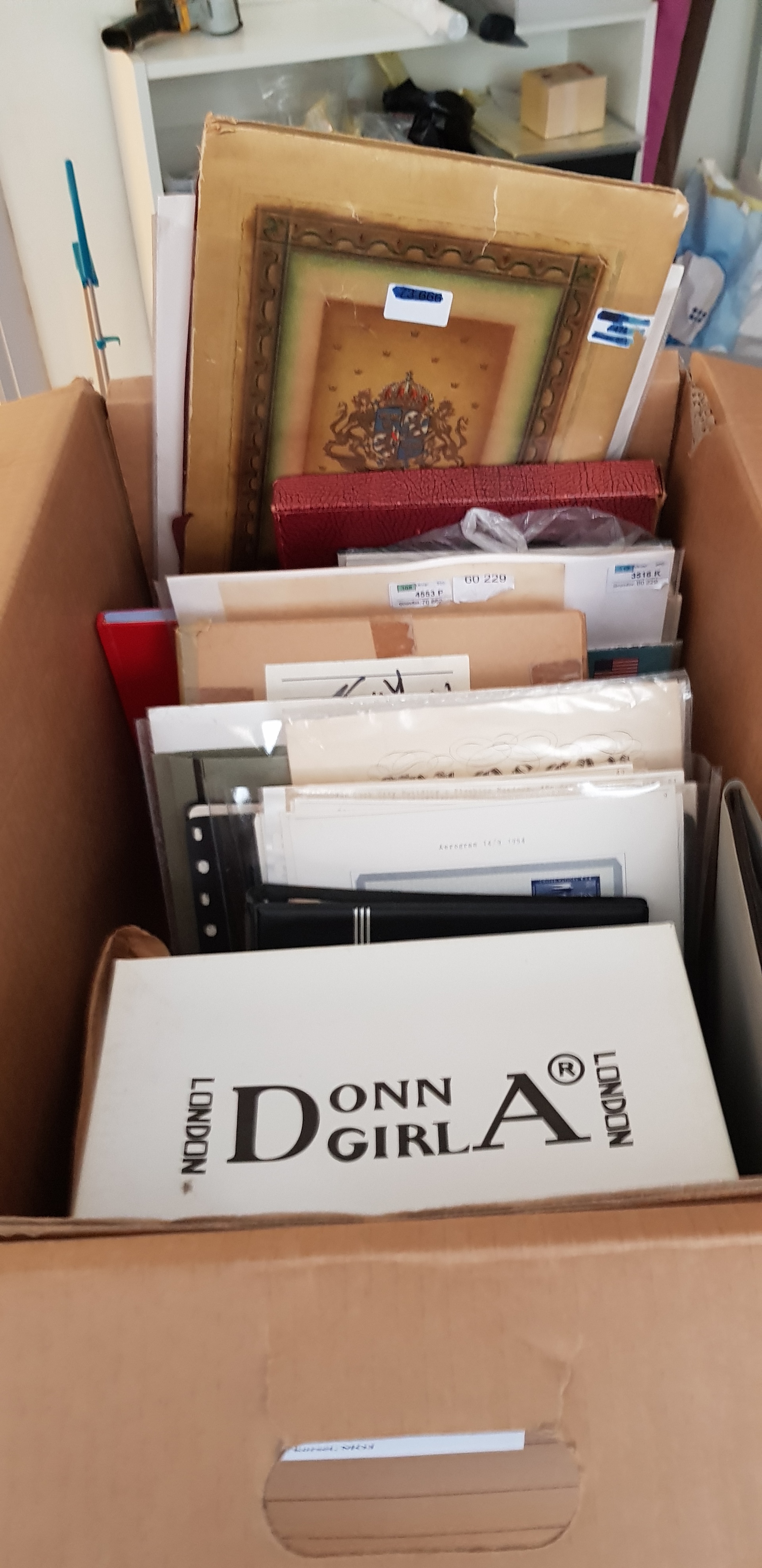 Miscellaneous, ALL WORLD. A removal box with mixed items such as books, "Kromkronor" and "Guldkronor" for clocks, postcards, stamps and blocks. A bargain box! Approx. 16 kg.