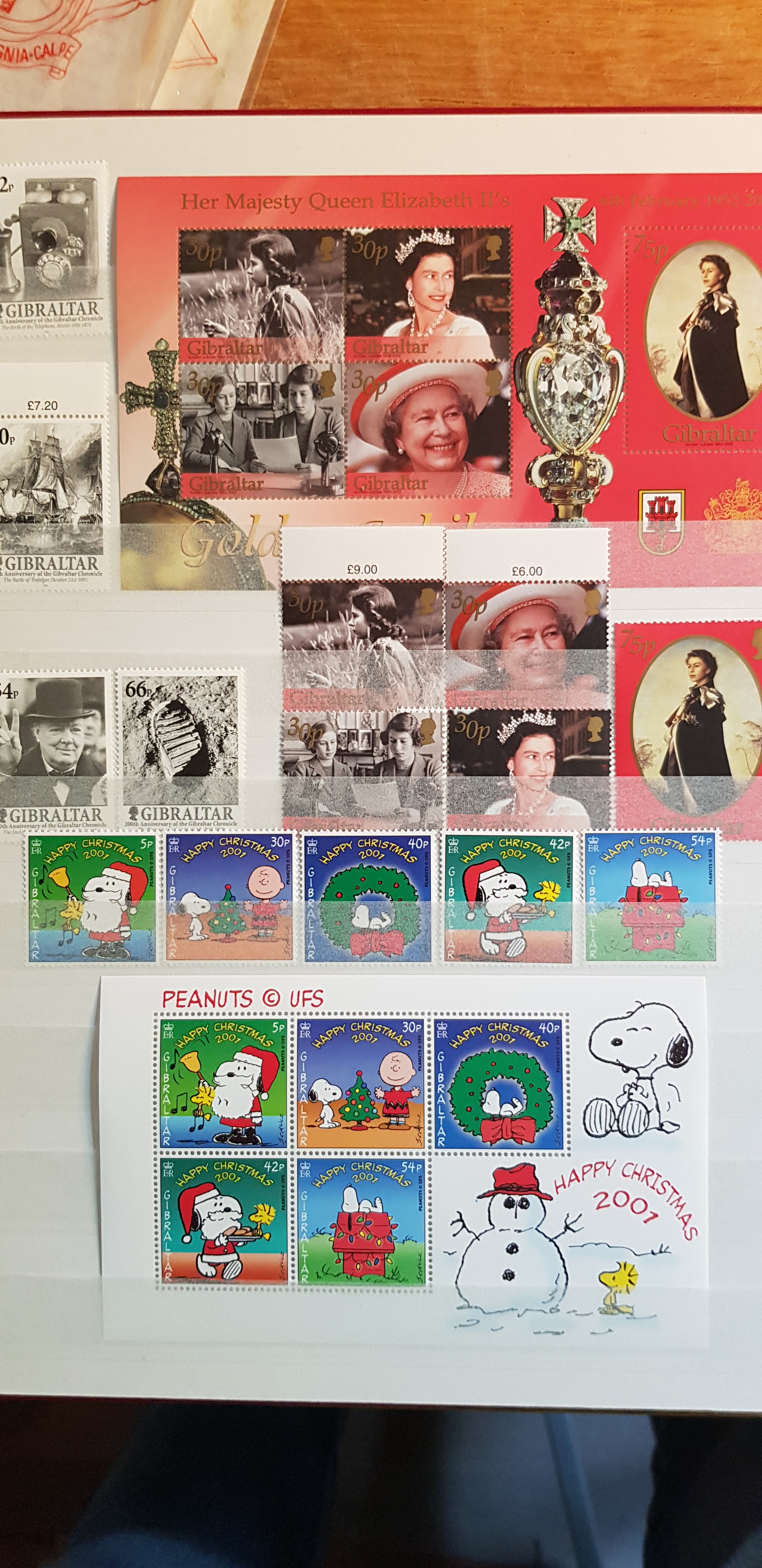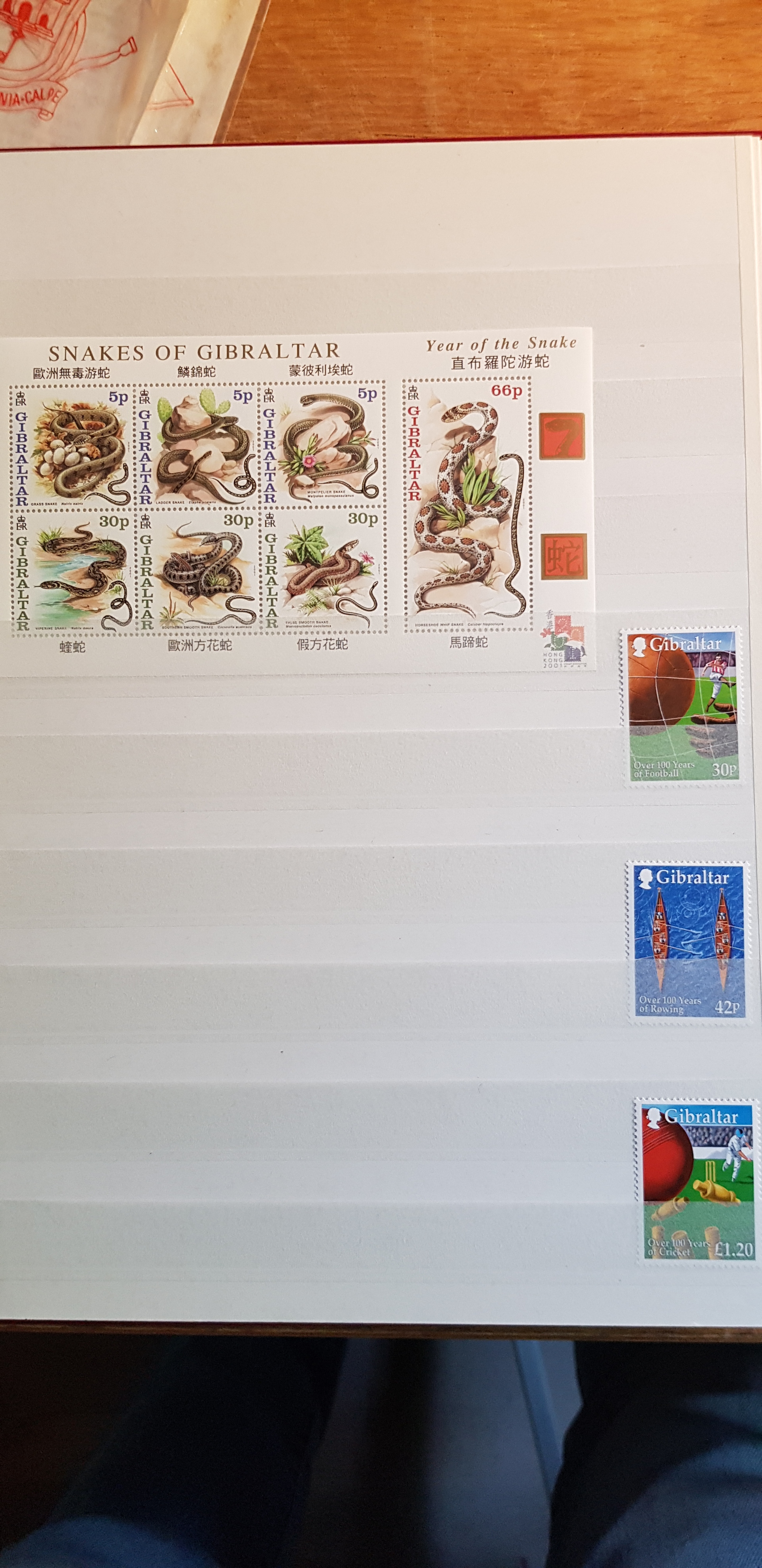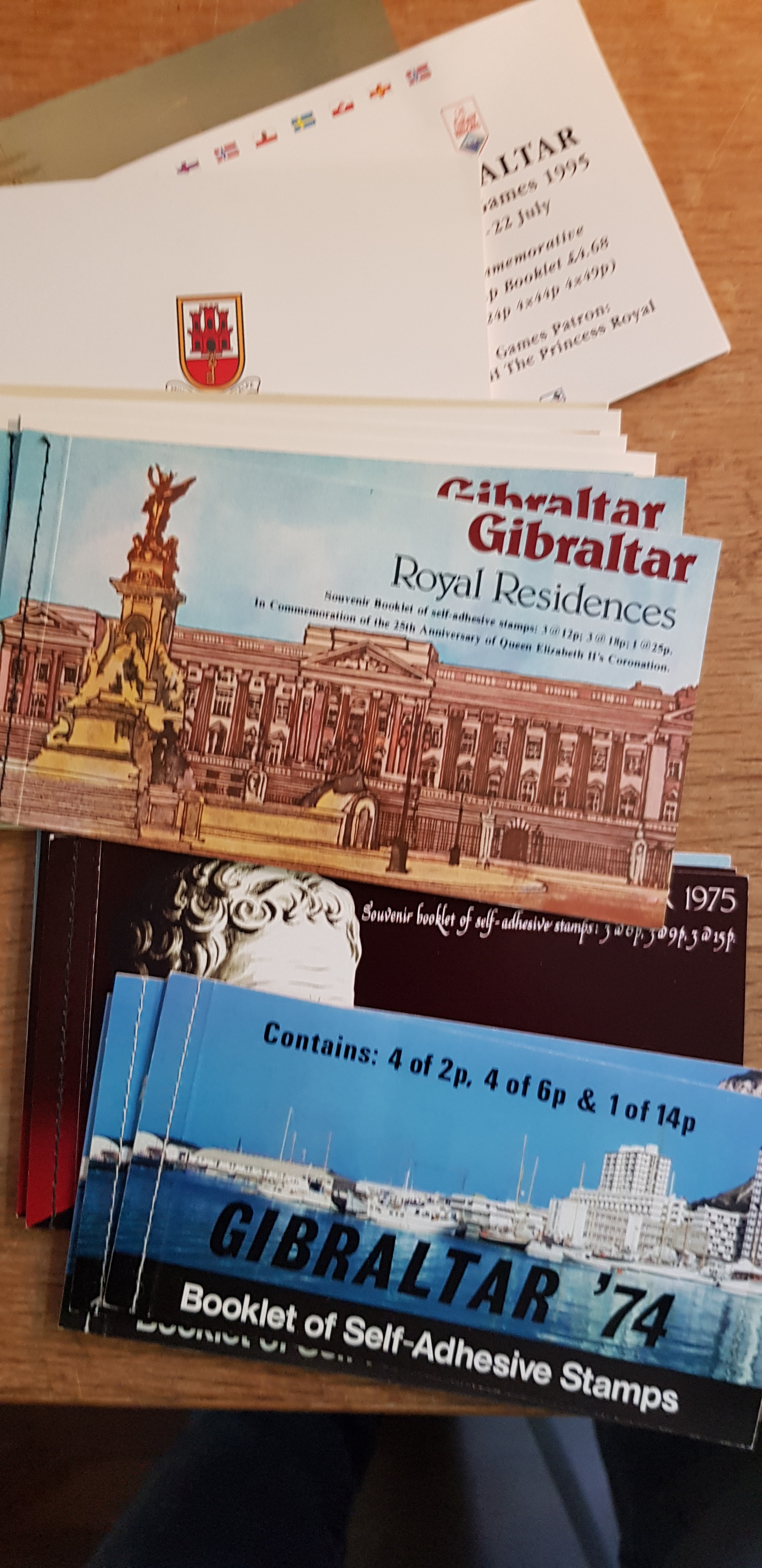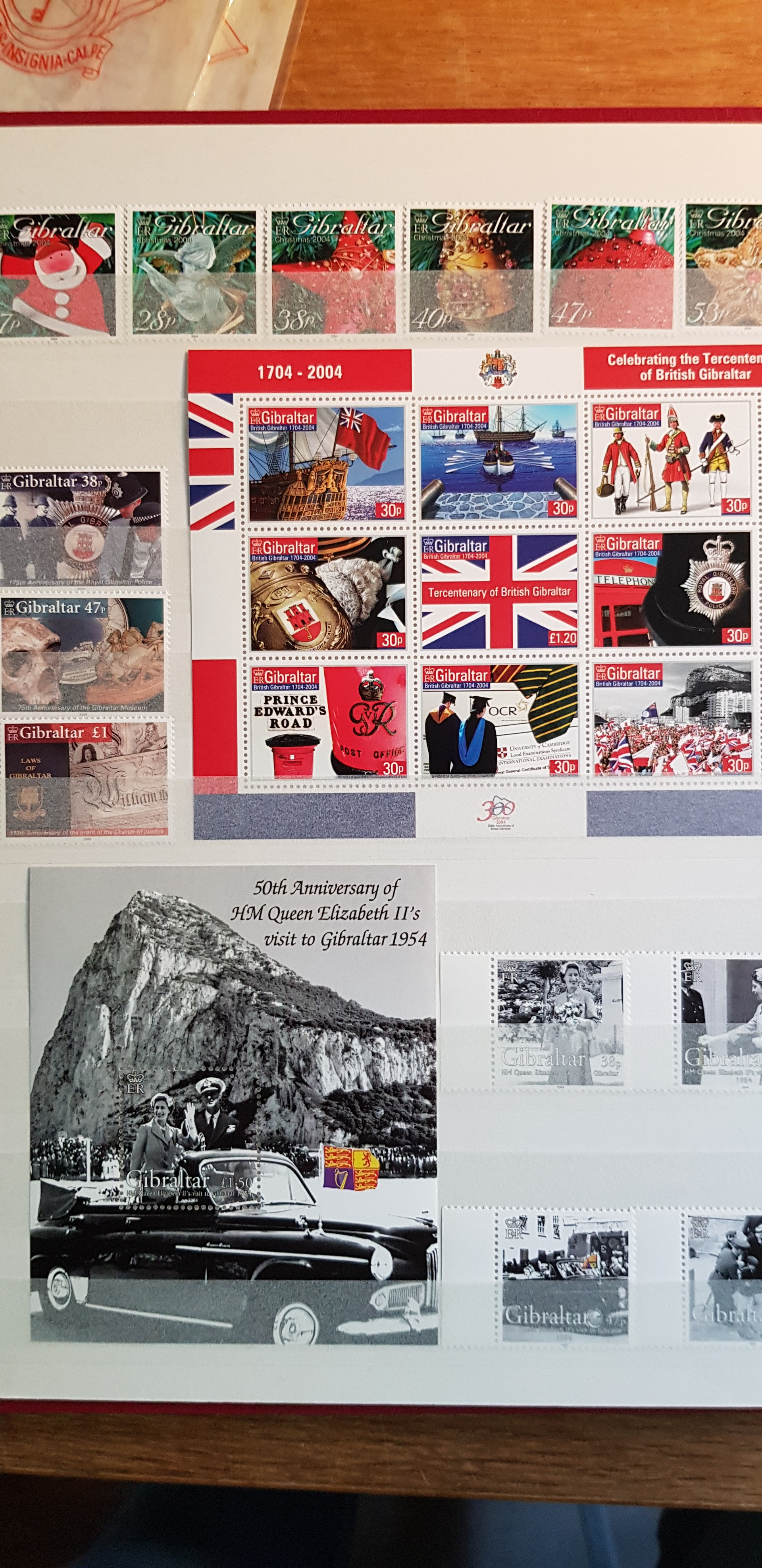 Gibraltar. Collection/accumulation mostly ★★ 1900s–2000s in box. Mainly Gibraltar in two stockbooks plus one small album with sheets. Also a lot of blocks and souvenir sheets. Please see a selection of scans at www.philea.se. Mostly fine quality. (>5000)