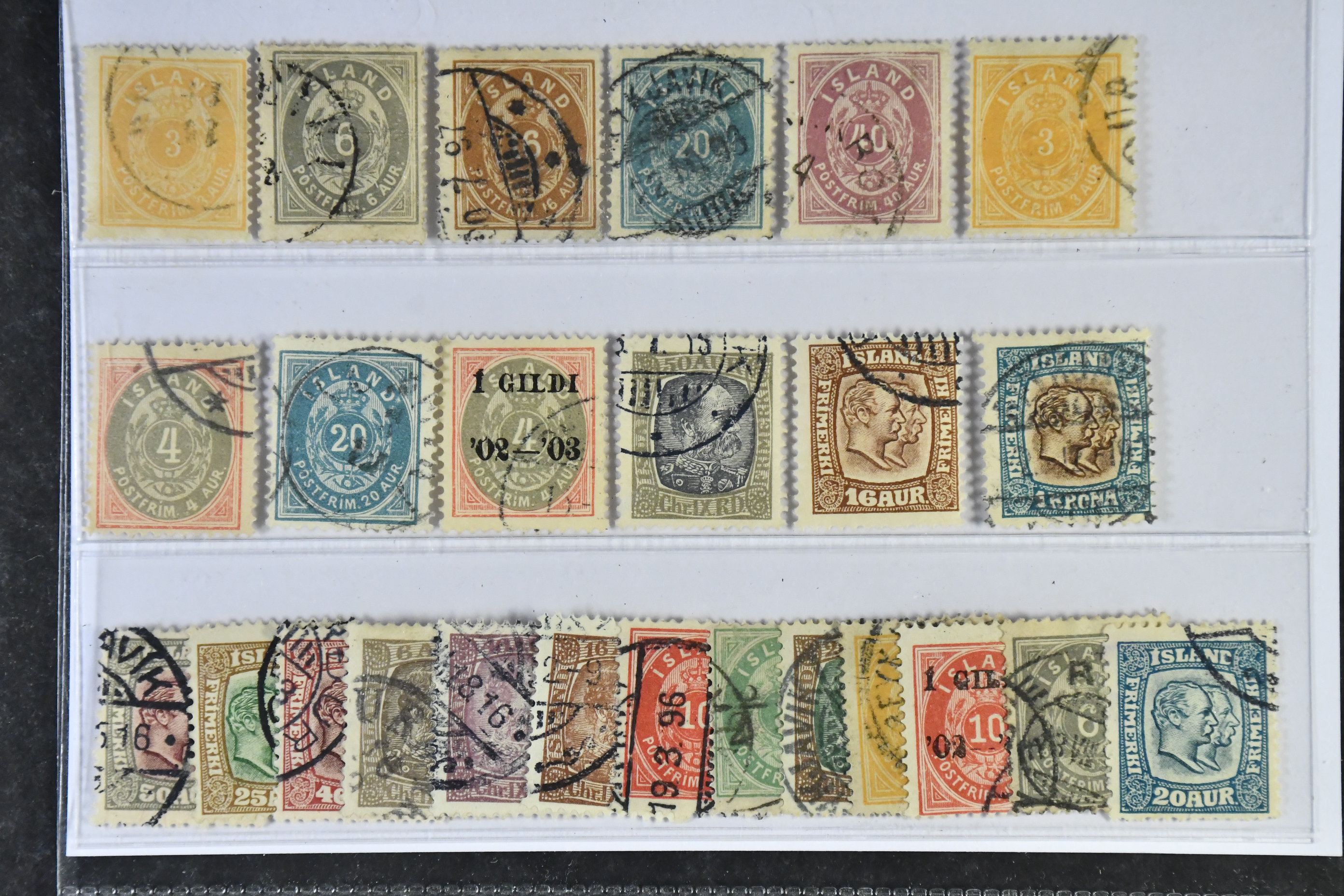 Iceland. Used 1876–1908. All different, e.g. F 8, 11, 13, 15, 17, 21-22, 28, 50, 72, 83, 88. Mostly good quality. F SEK 5280 (19)