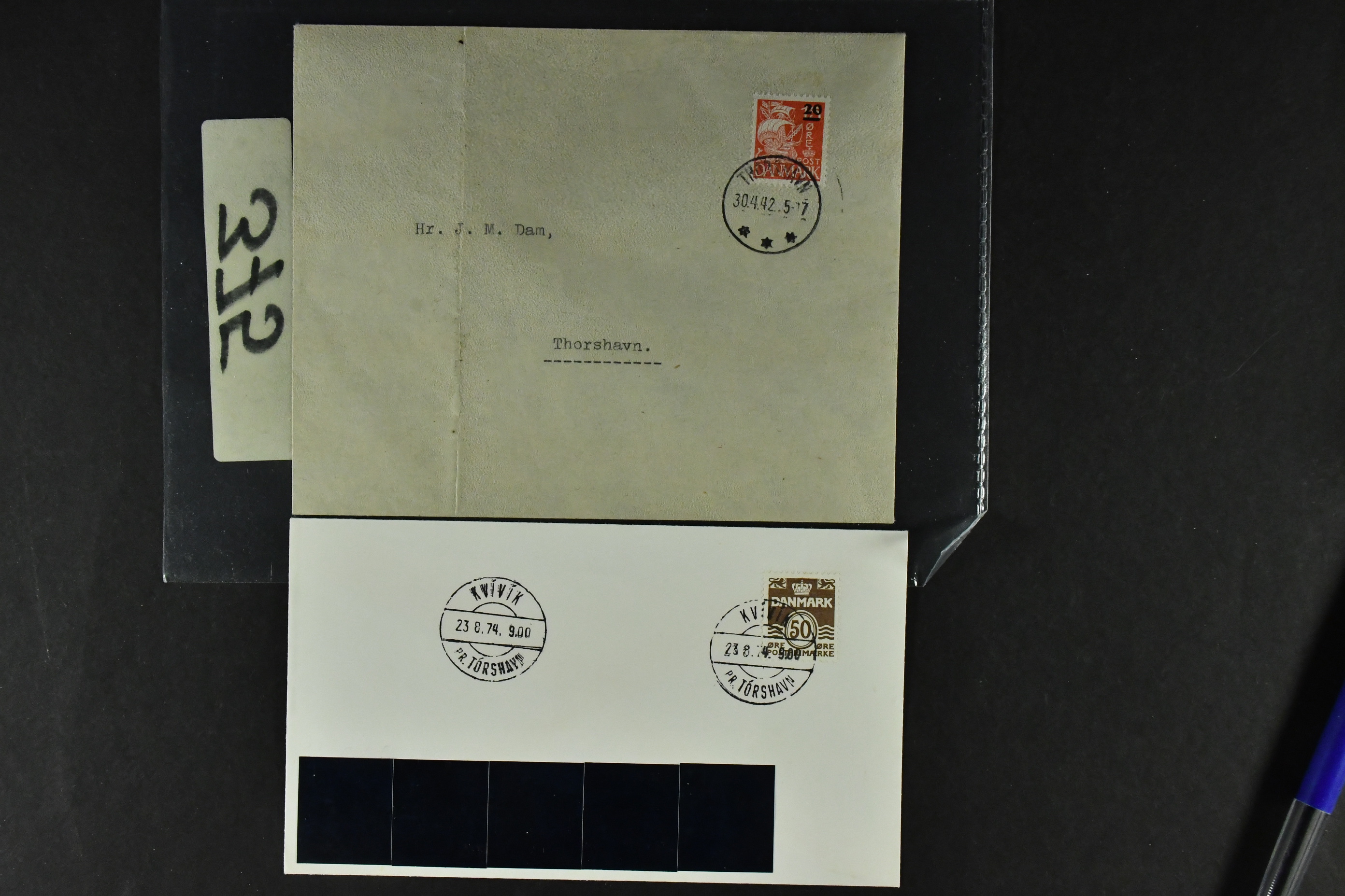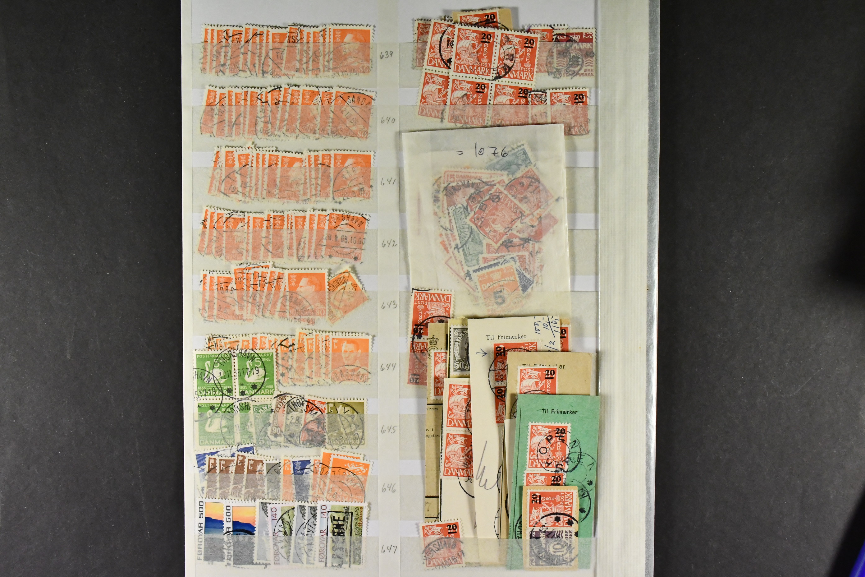 The Faroes. Lot used. On stockbook leaf well-filled with many 20 on 15 öre provinsionals incl. on cut piece and one cover. Also Danish stamps used on the Faroes. Interesting!