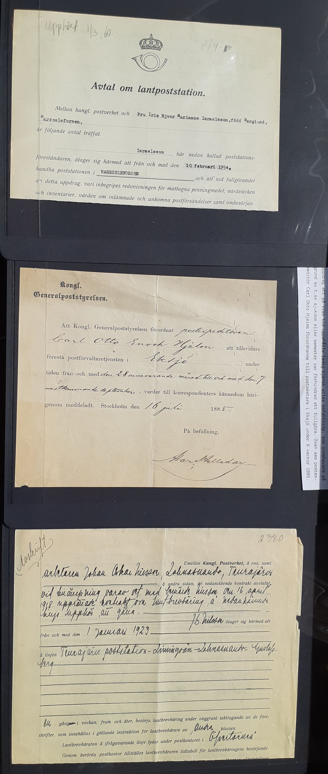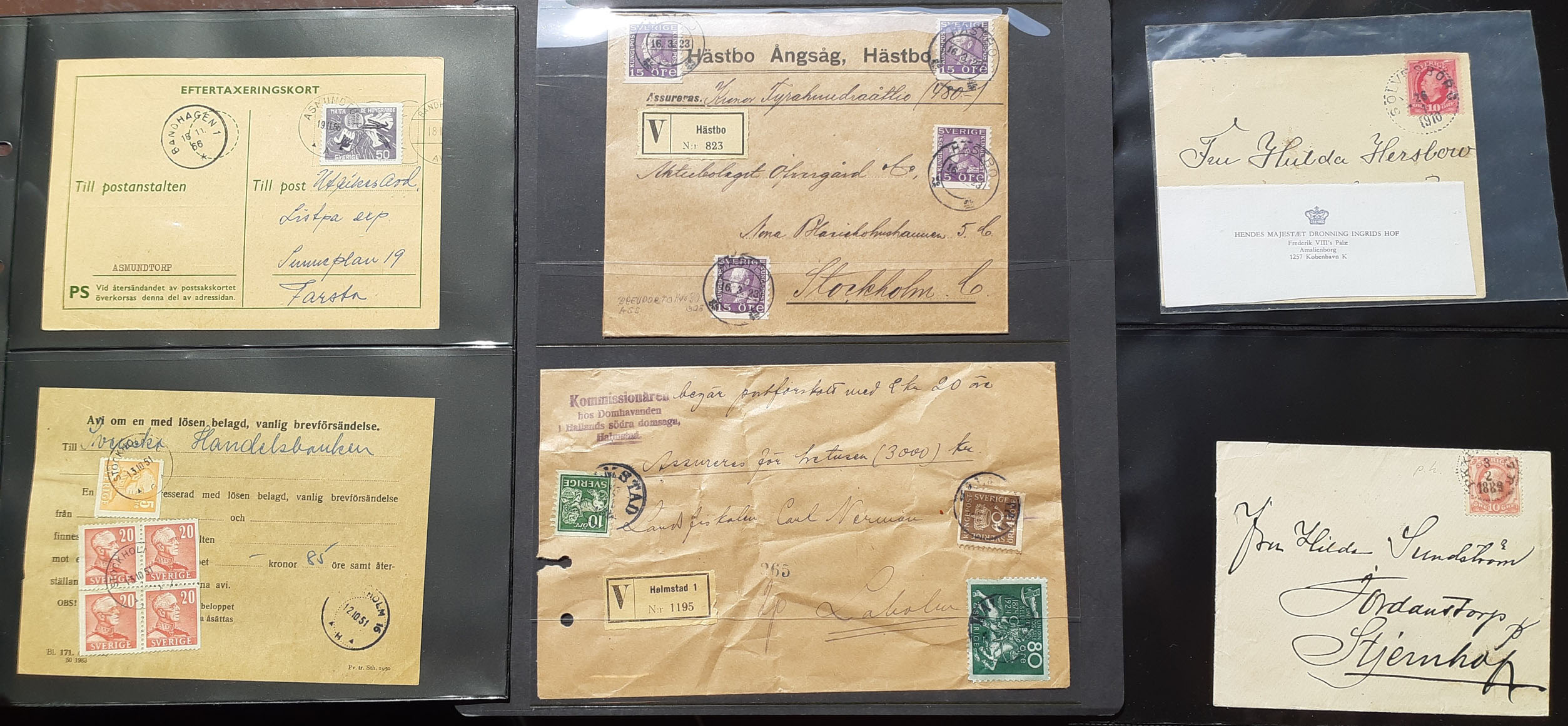 Sweden. Covers, collection/accumulation covers 1880s–1950s on visir leaves. Postal documents e.g. receipts, address changes, a military parcel label, postal agreements, and a form regarding assignment. The rest mostly covers incl. one insured cash on delivery cover (holepunched) with F222. Also a few wax seals (not counted). Somewhat mixed quality. (72)