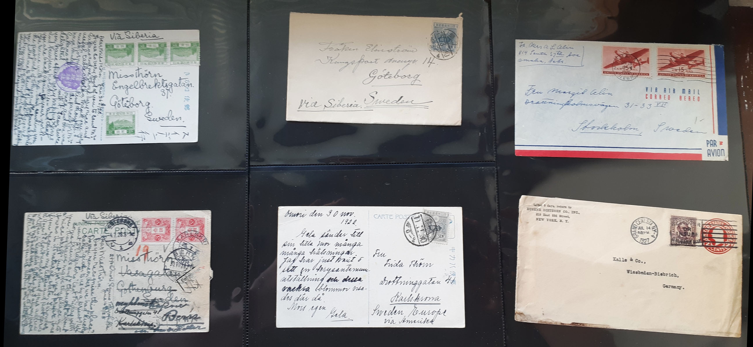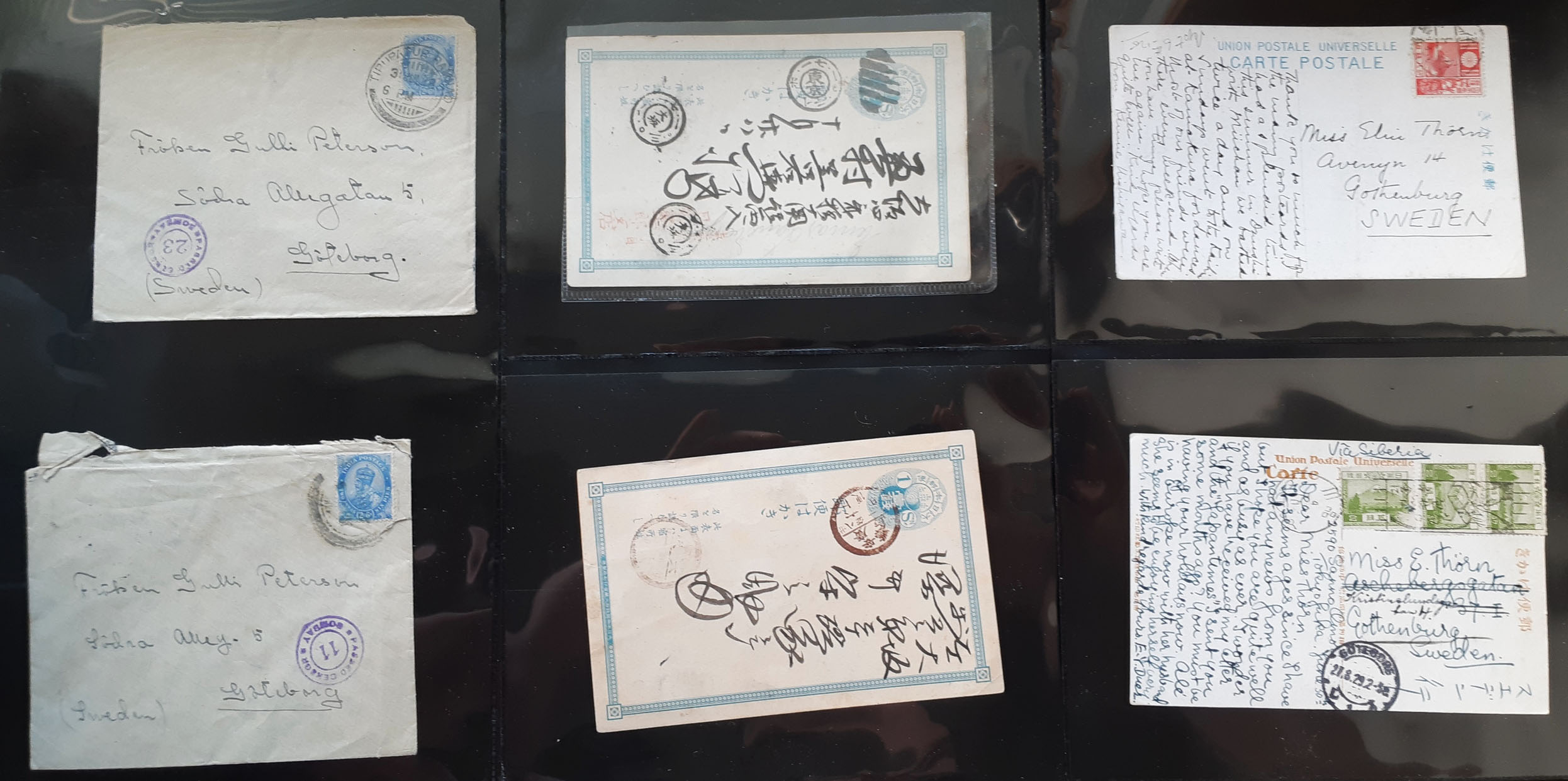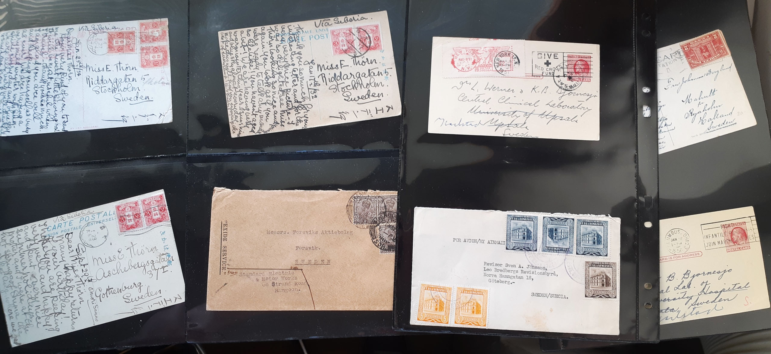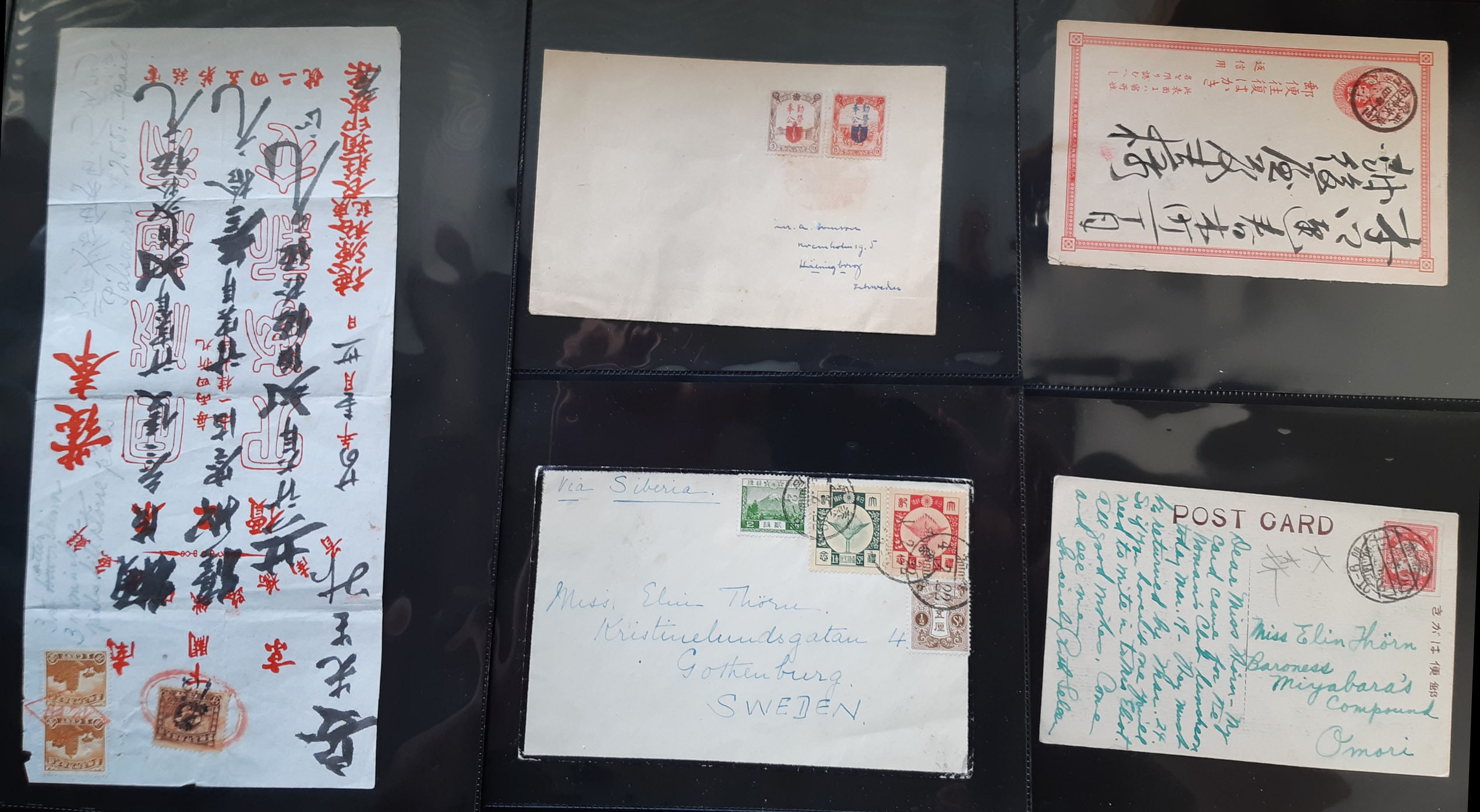 ALL WORLD. Covers, lot covers 1910s–1950s on visir leaves. Overseas countries, mostly ASIA incl. many from Japan, plus USA. Several sent to Sweden. Also a document paid with 3×1 c fiscal stamps. Somewhat mixed quality. (25)
