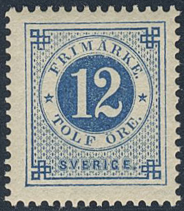 Sweden. Facit 32h ★★, 12 öre dark blue–light blue on calendered paper. Very fine and fresh, never hinged copy with opinion (shade) by O.P.