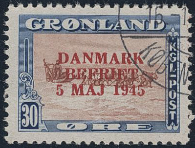 Greenland. Facit 24v2 or Scott 22a used, 1945 Overprint "Danmark Befriet 5 Maj 1945" 30 øre brown-red/blue, red overprint. SEK 1800