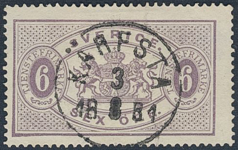 Sweden. Official Facit Tj4 used, 6 öre violet, perf 14. EXCELLENT cancellation KÄRFSTA 3.8.1881. Thin spots.