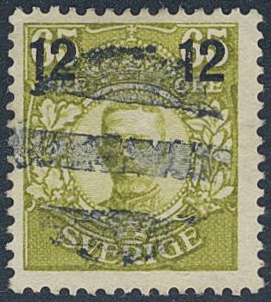 Sweden. Facit 101 used, Surcharge 12 / 65 öre yellow-green. Cancelled with superb FIGURE MARK.