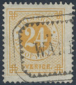 Sweden. Facit 34 used, 24 öre yellow. Fresh copy cancelled WÄRDE.