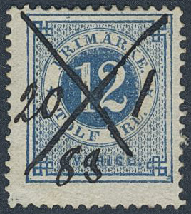 Sweden. Facit 32 used, 12 öre blue. Ink cancellation 20.1.83. Two folded perfs.