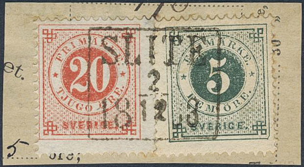 Sweden. Facit 43, 46 on piece, 5+20 öre on wonderful cut piece cancelled SLITE 2.12.1883.