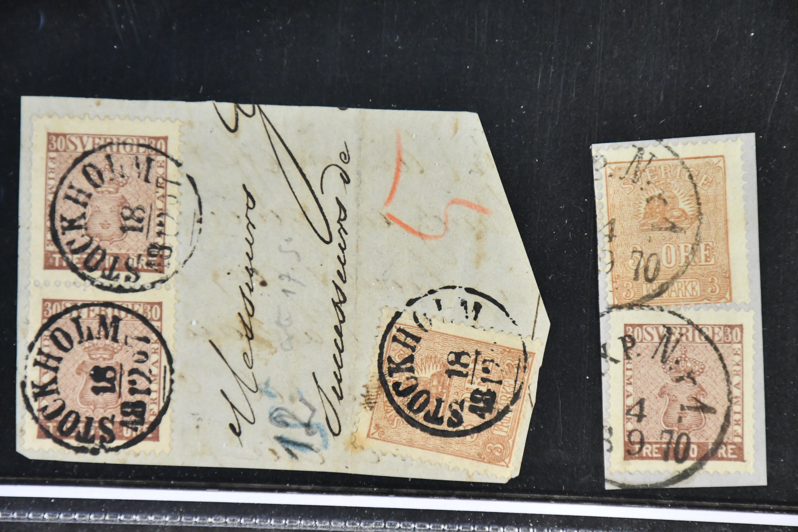 Sweden. Facit 11, 14B on piece, 3+2×30 and 3+30 öre on two cut pieces, cancelled 1867–1870. (2).